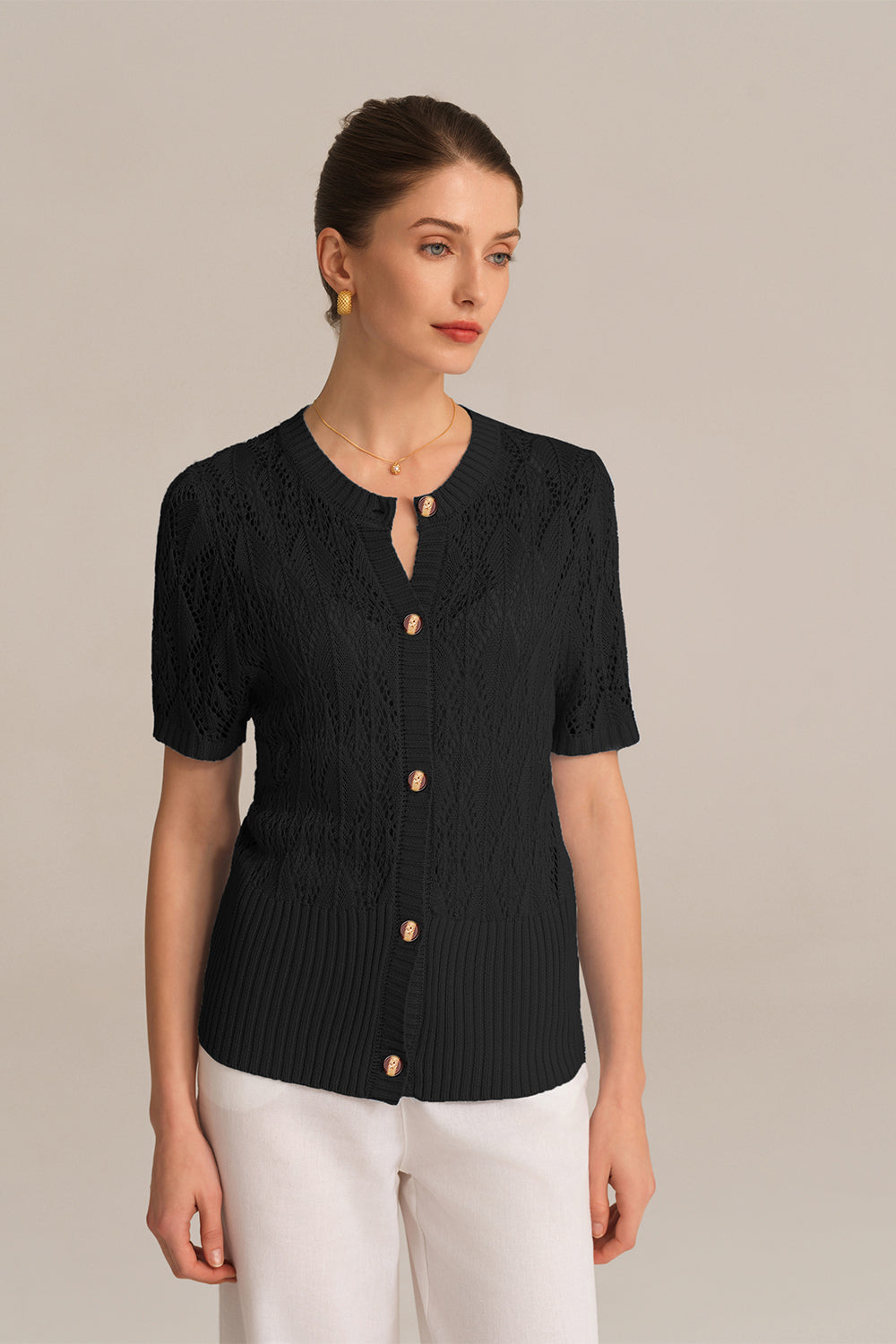 Delikli Kısa Kol Bisiklet Yaka Düğmeli Örme Hırka - Siyah