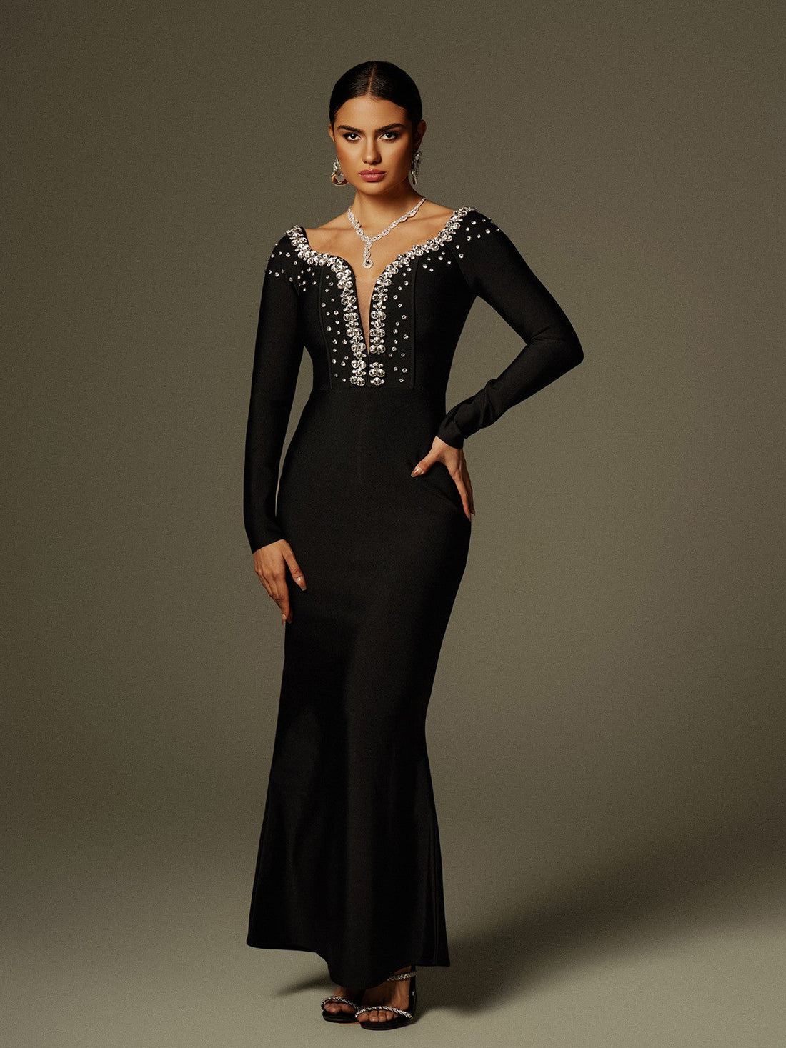 Cayla V Yaka Rhinestone Bandaj Maksi Elbise