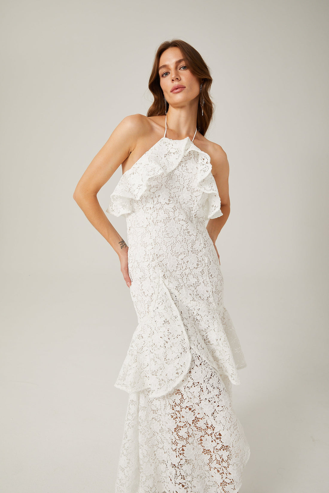 Sancia beyaz fırfırlı güpür dantel Maxi elbise