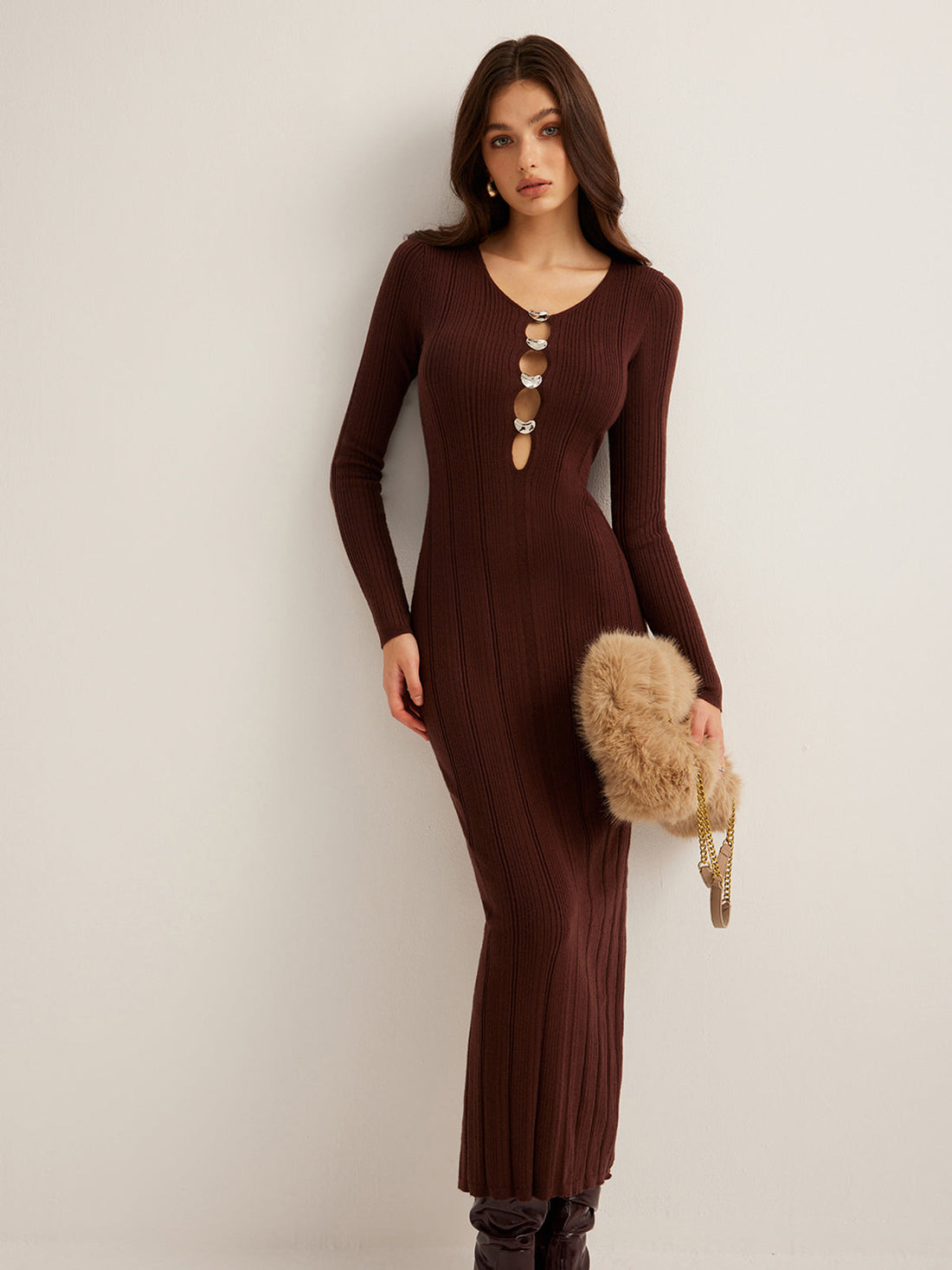 Balıkçı Yaka Pliseli Örgü Maxi Elbise