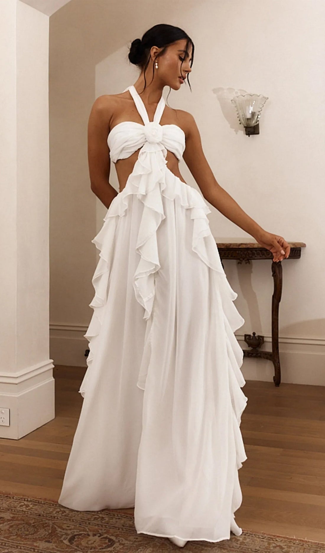 Halter Ruffles Gül Süslemeli Maksi Elbise