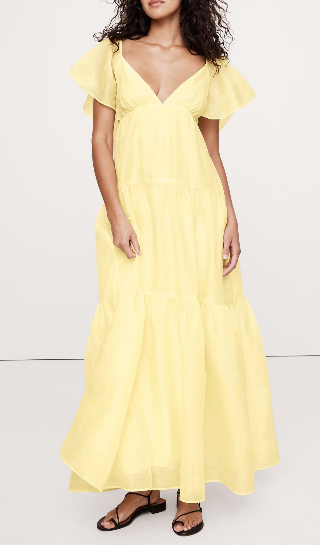 Süper özel bir elbise. Bu katmanlı maksi elbise tamamen detaylarla ilgili: volanlı kol, ampir bel...