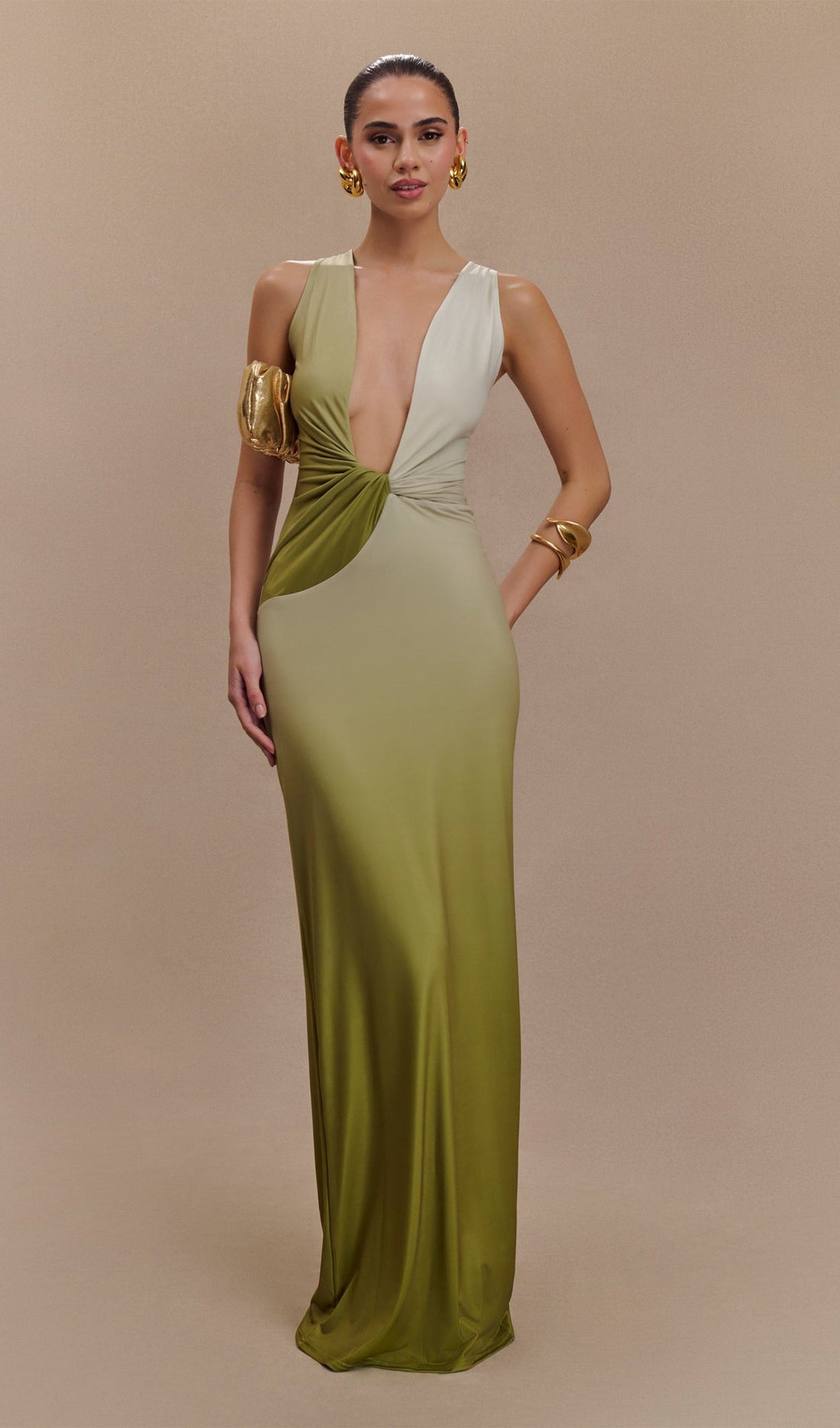 Drapeli Dar Maksi Elbise Ombre Zeytin