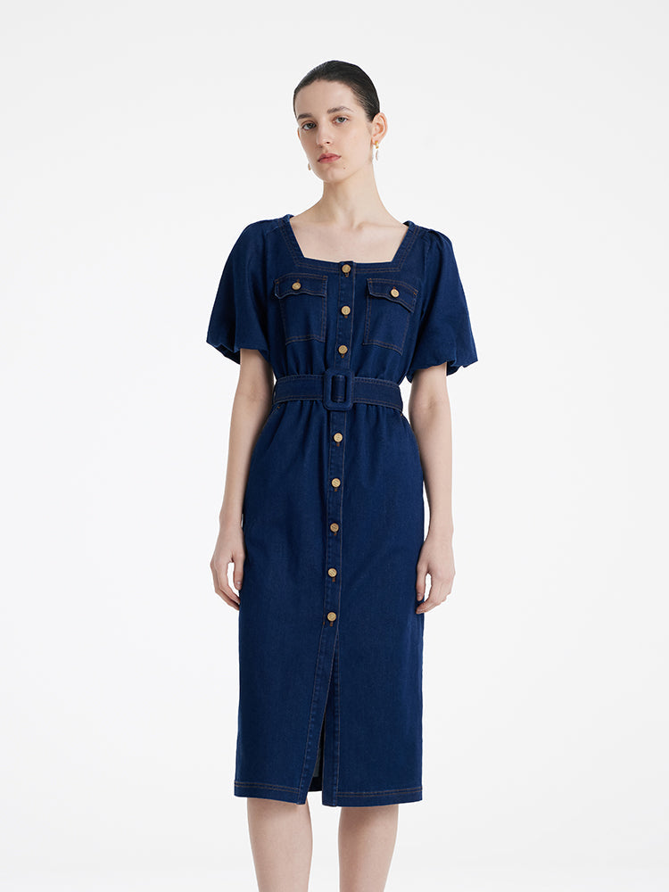 Puf Kollu Kare Yaka Denim Kadın Midi Kot Elbise Kemerli