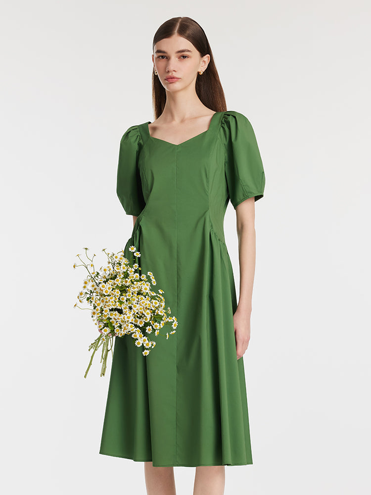 Kare Yaka Puf Kollu Kadın Midi Spor Yeşil Elbise