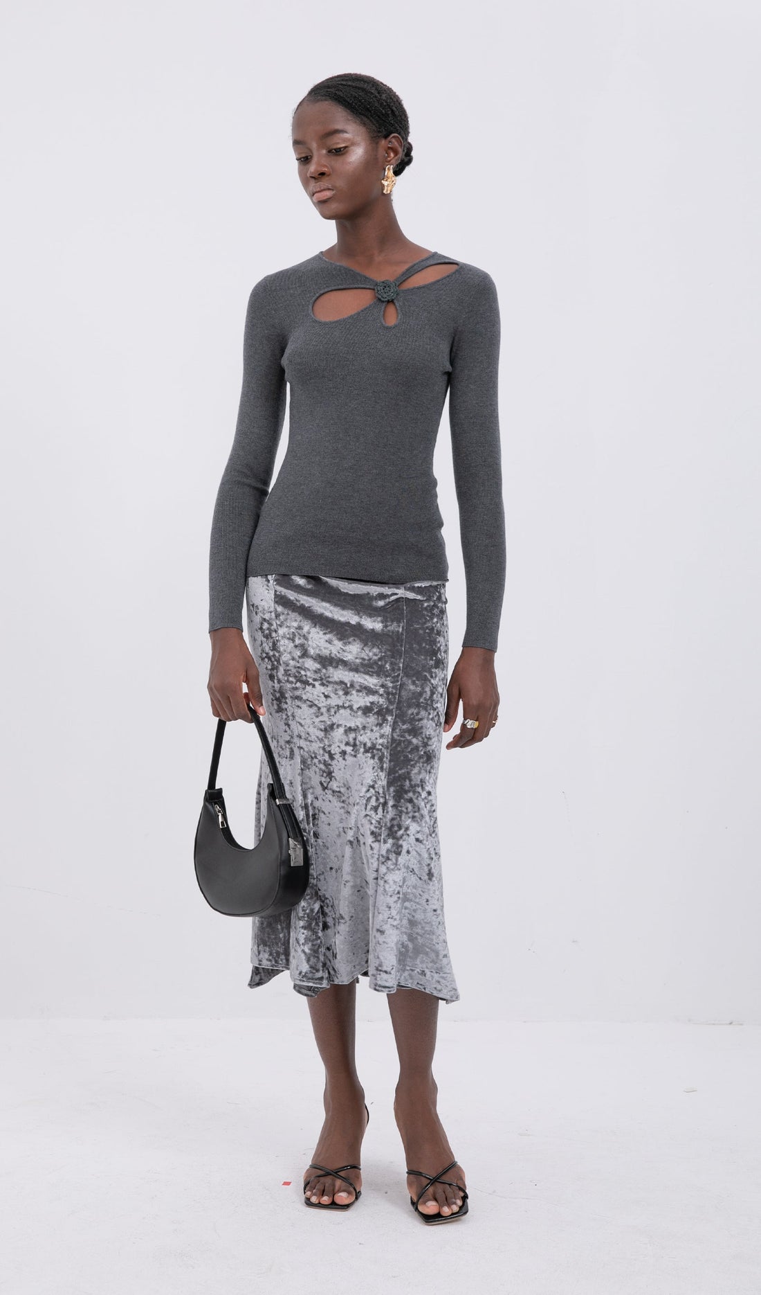 Trendy Yüksek Bel Kadife Midi Etek-Gümüş