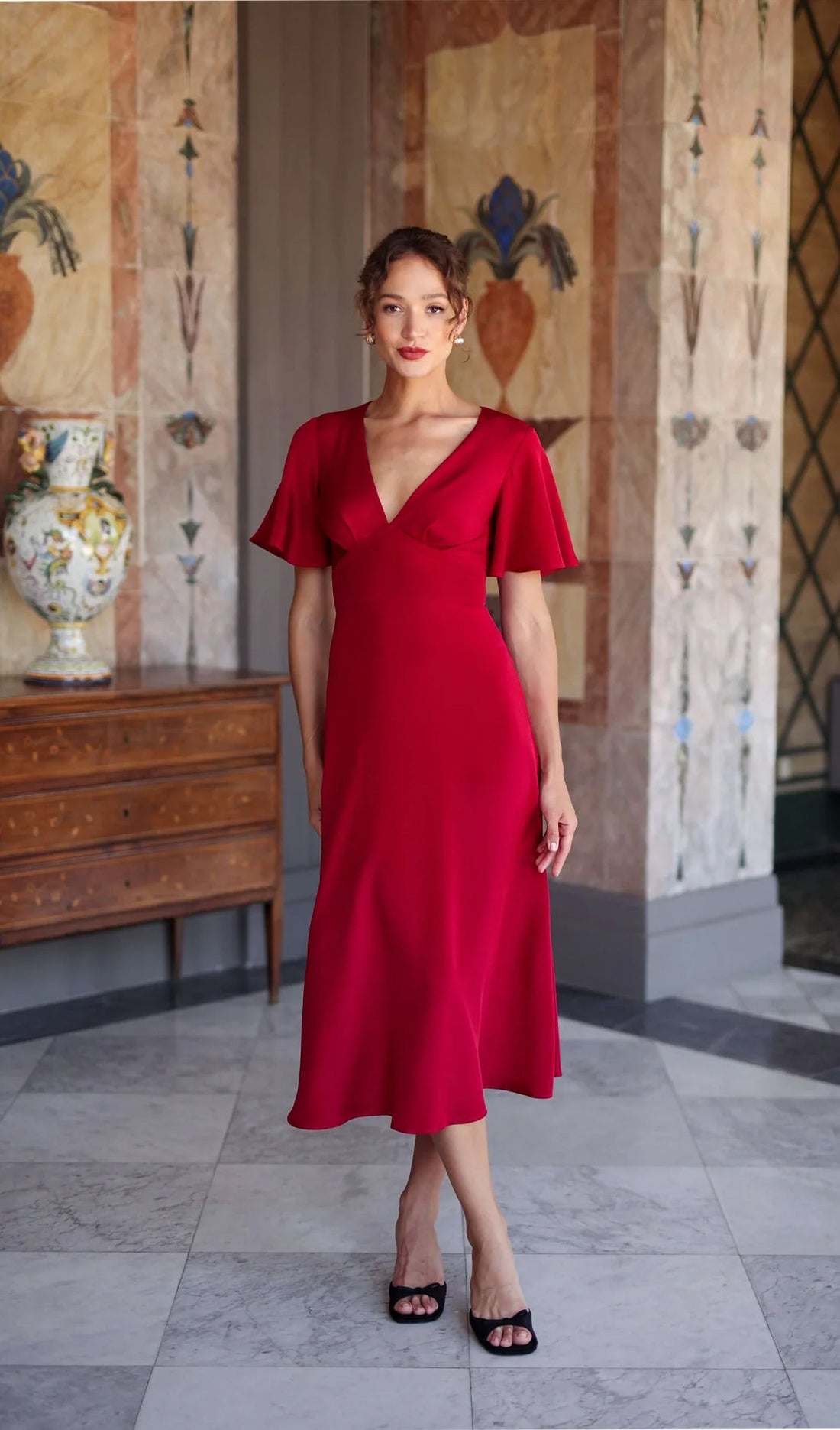V Yaka Abiye Midi Elbise-Kırmızı