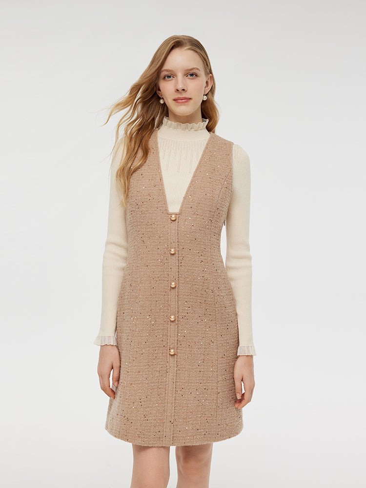 Alpaka ve Yün Tüvit Mini Elbise ve Örgü Üst İki Parçalı Takım