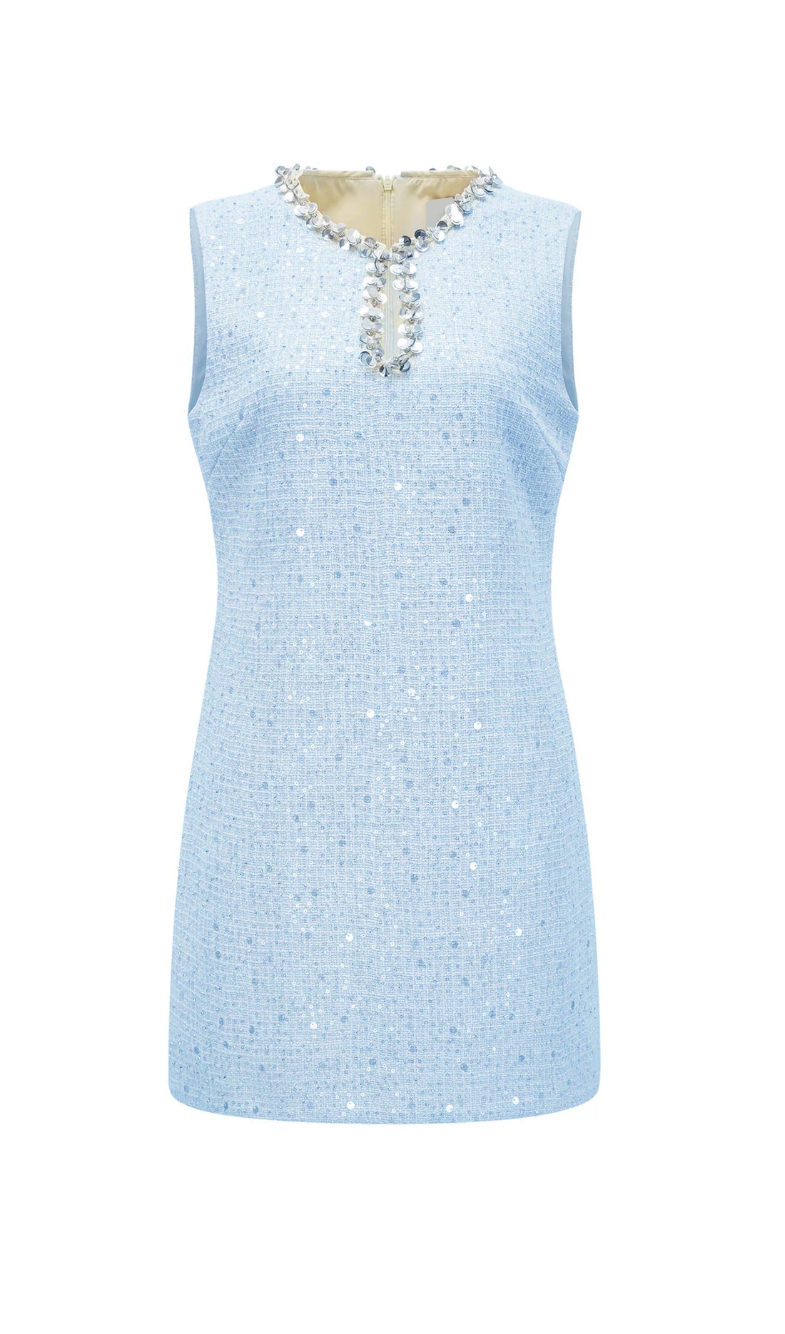 Bu Süslemeli Buklet Mini Elbise, ışıltılı payet, kristal ve kristal süslemelere sahip çok renkli bir...