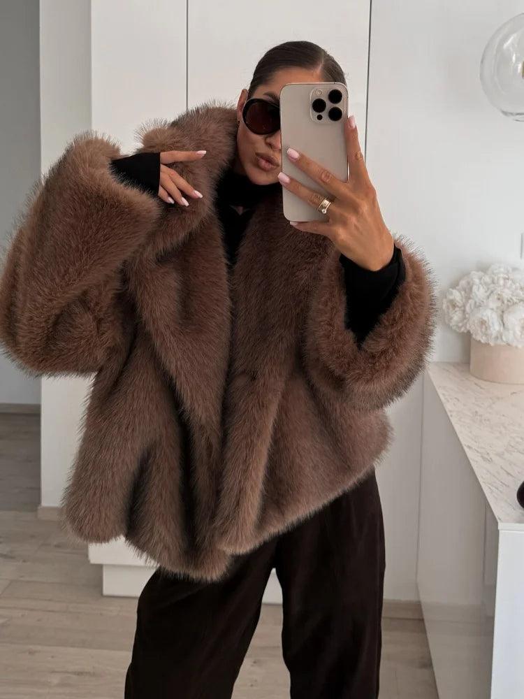 Bu şık suni kürk ceket ile kendinizi lüksle sarın. Pelüş, dokulu bir tasarıma ve sofistike...