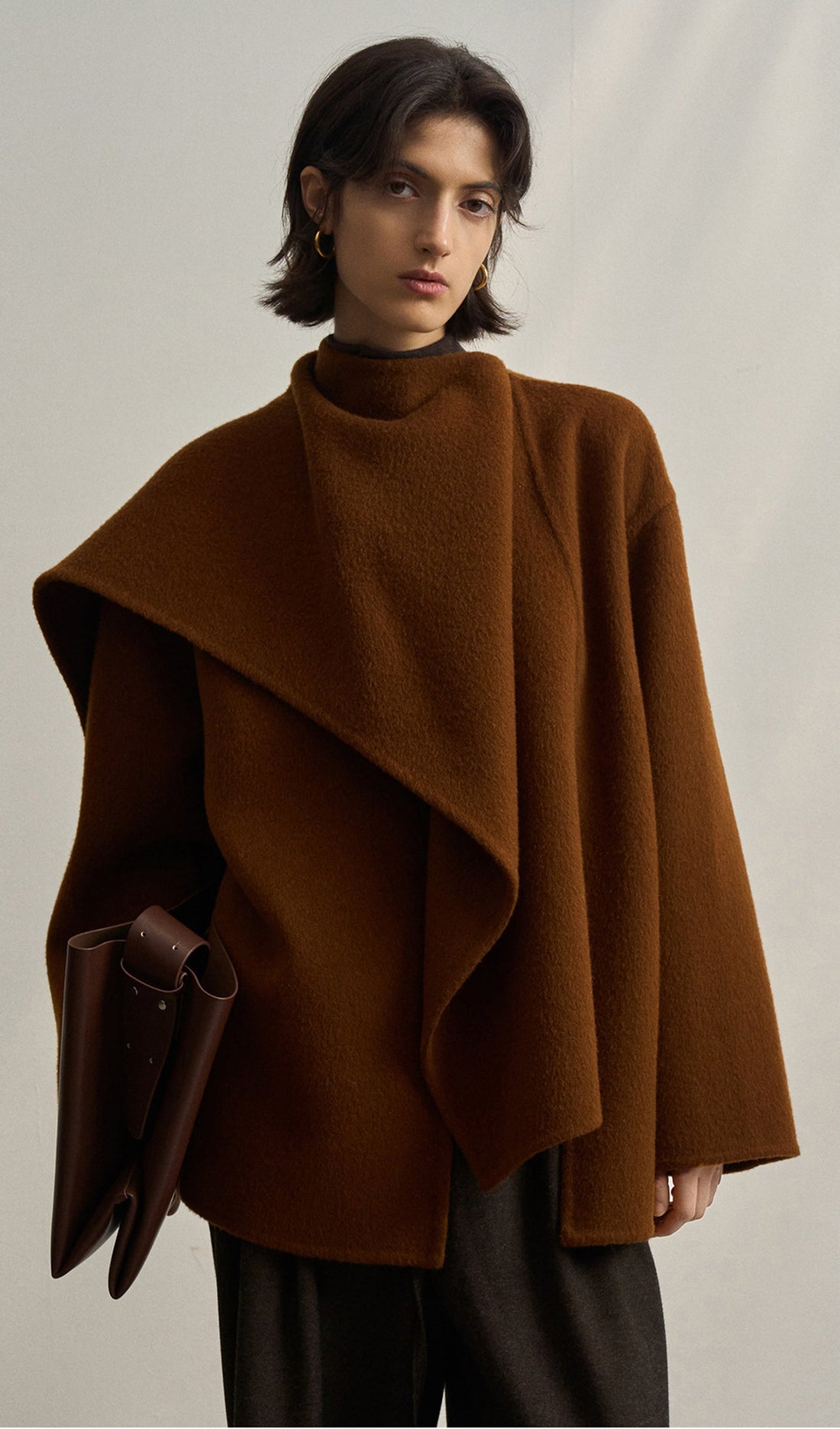 Solid Pelerin Stili %100 Yün Kaban-Kestane