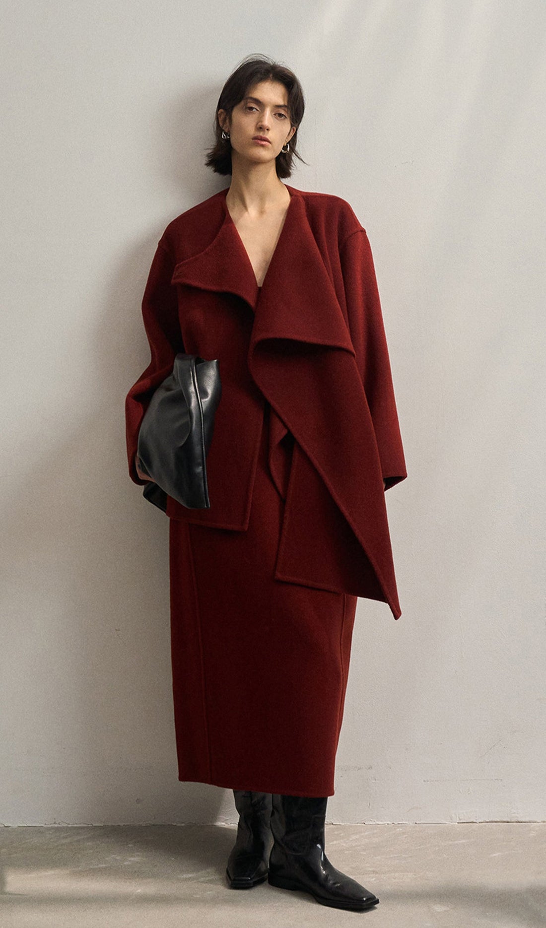 Düz Pelerin Stili %100 Yün Kaban-Şarap Kırmızısı