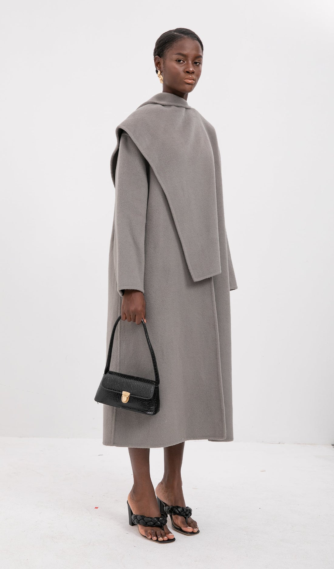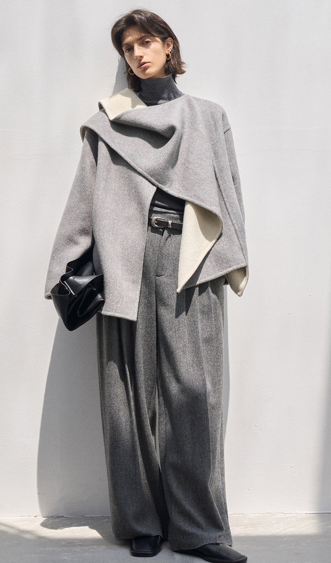 Solid Pelerin Stili %100 Yün Kaban-Gri