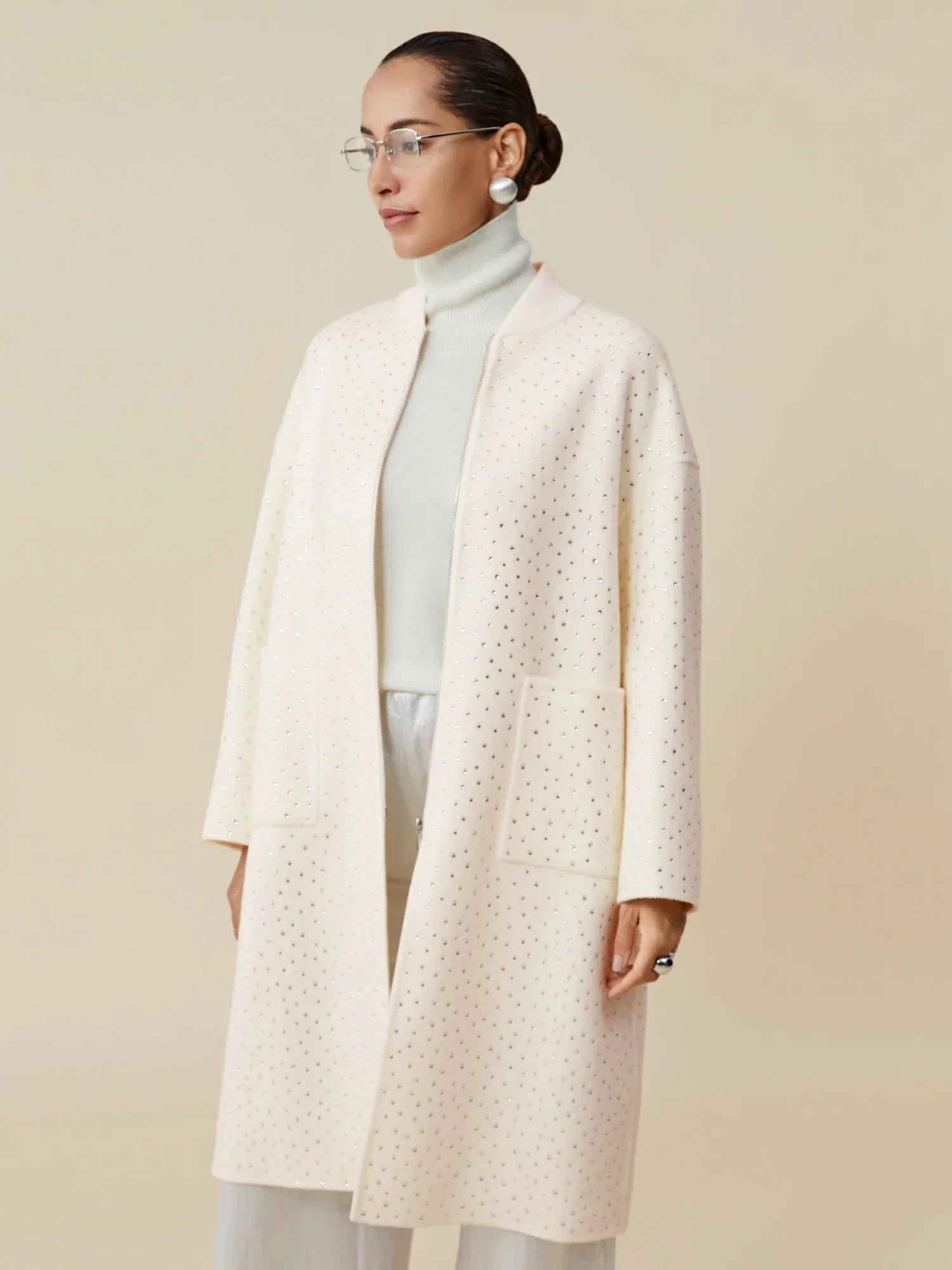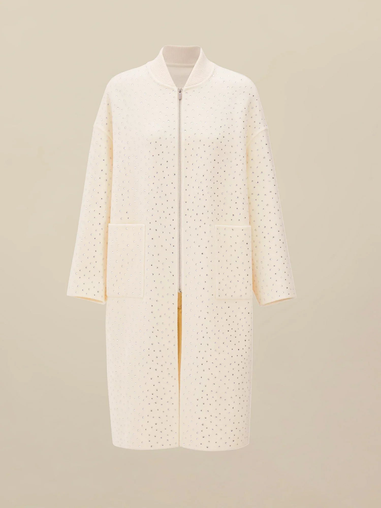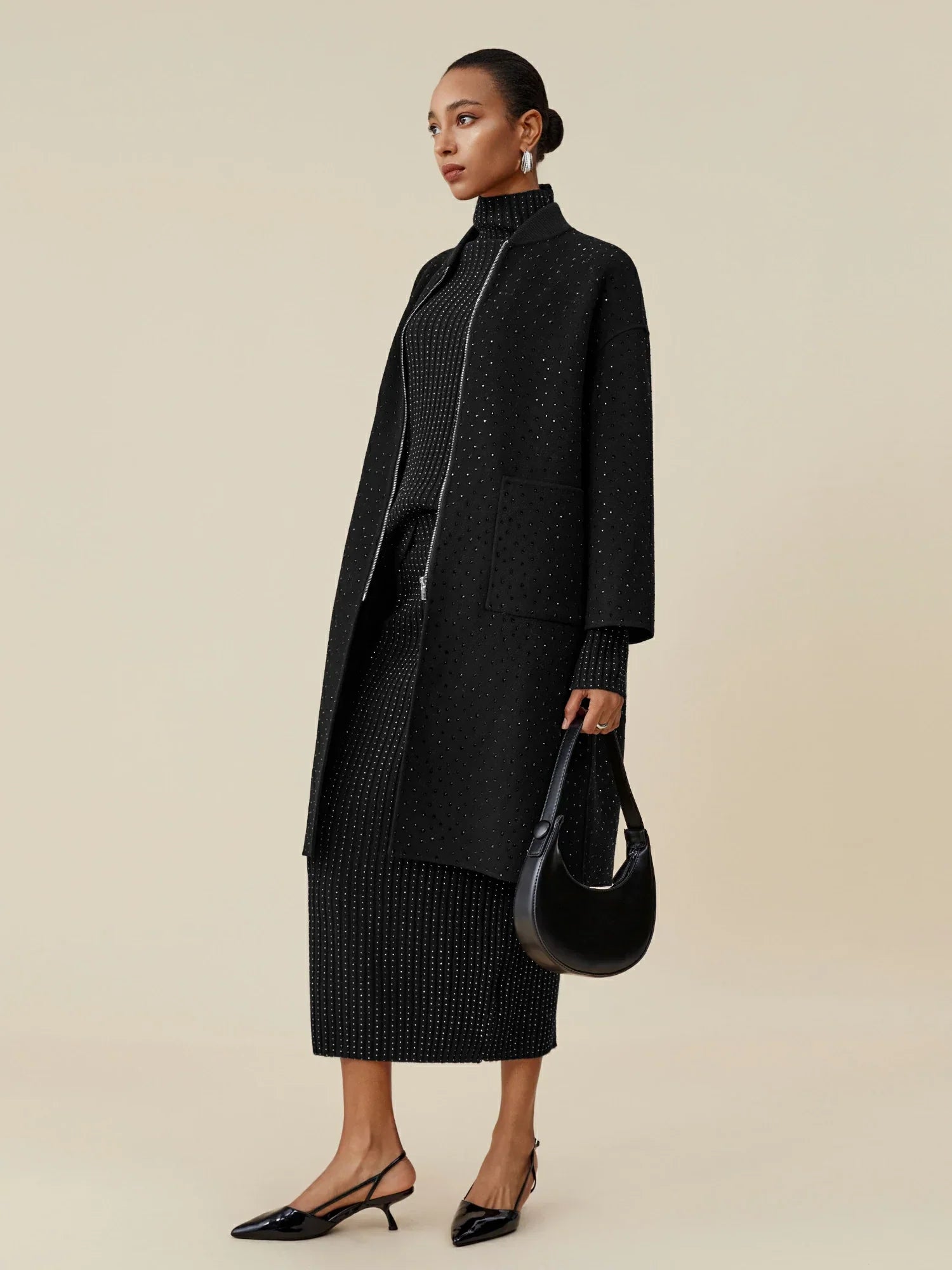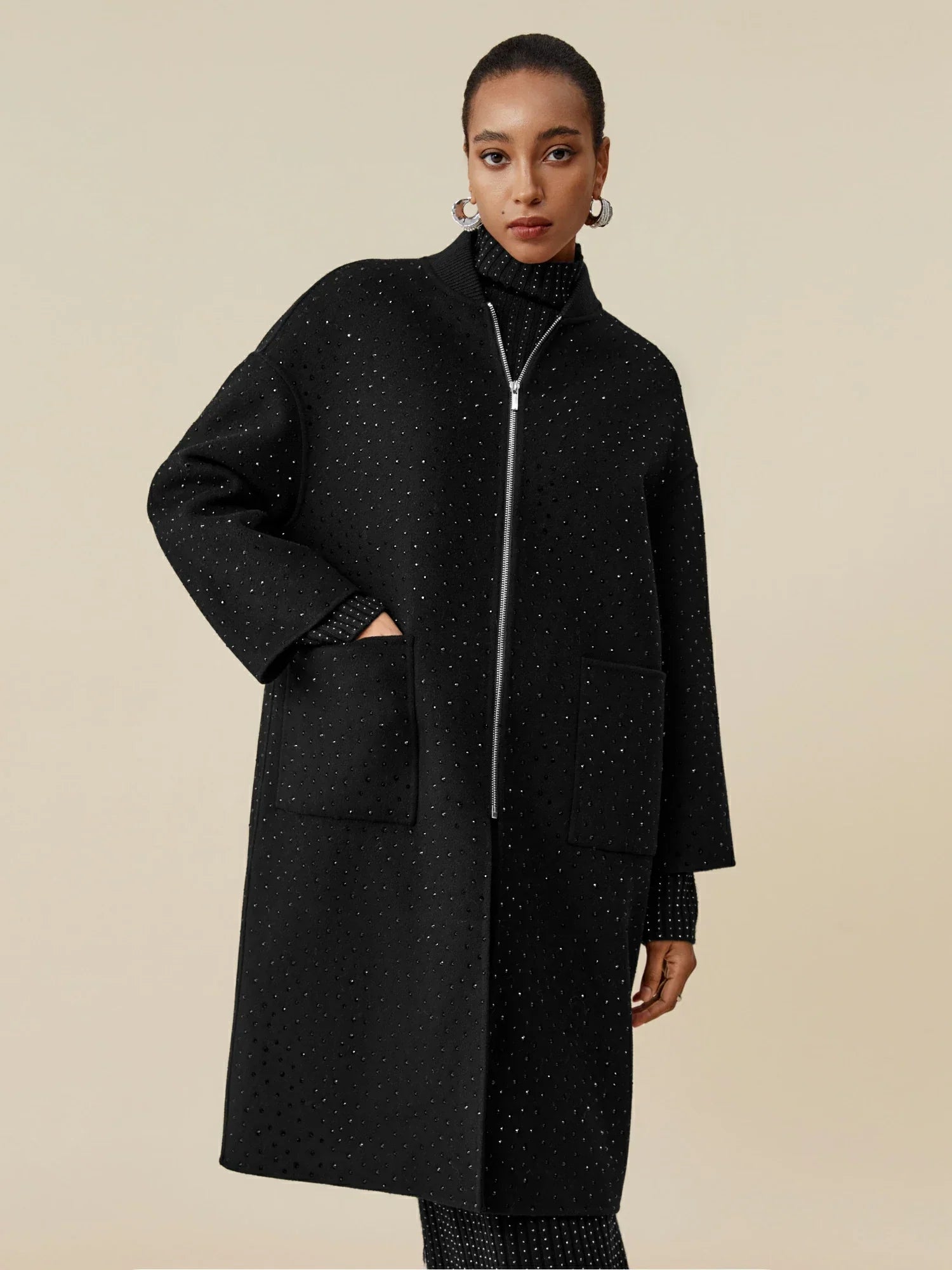 Yün Rhinestone Fermuarlı Uzun Kaban