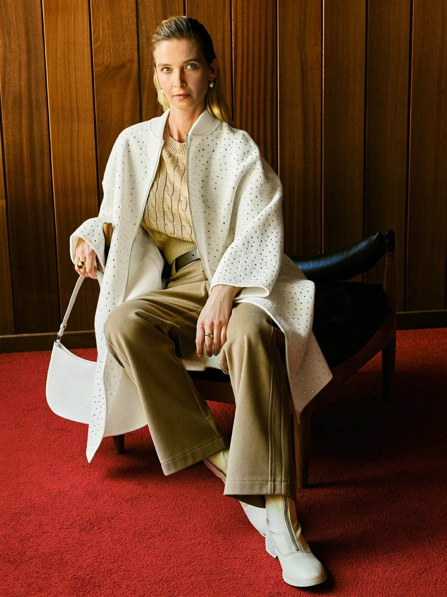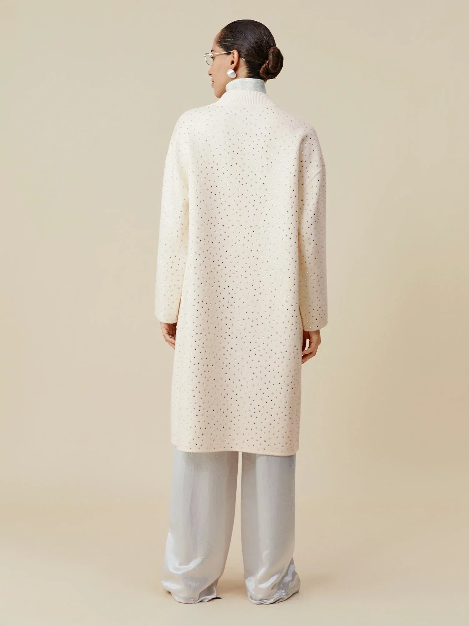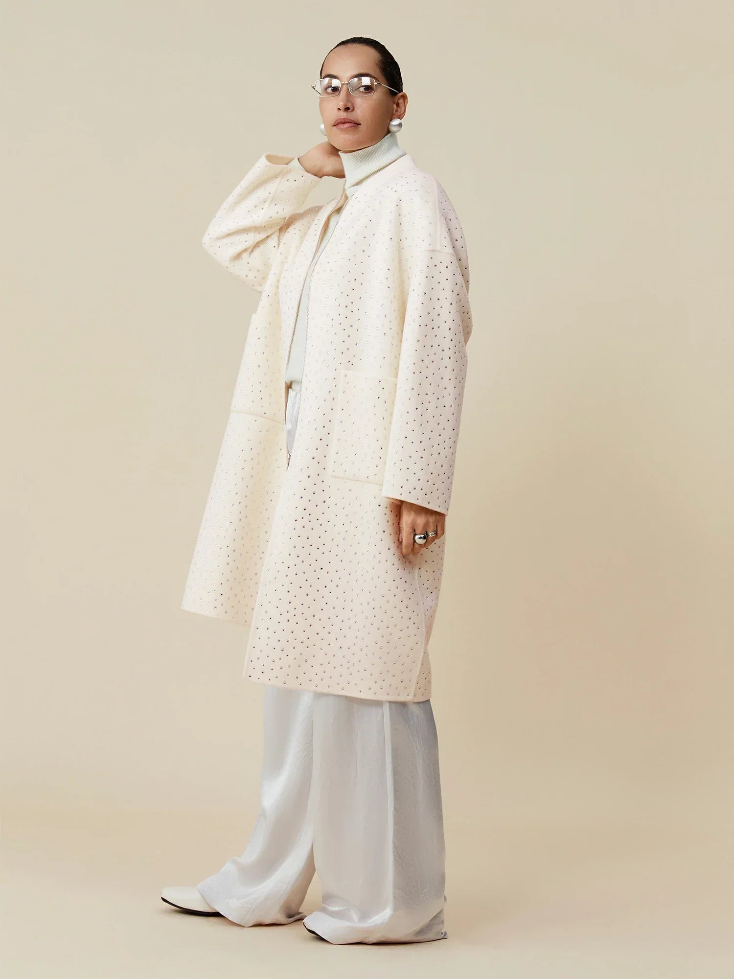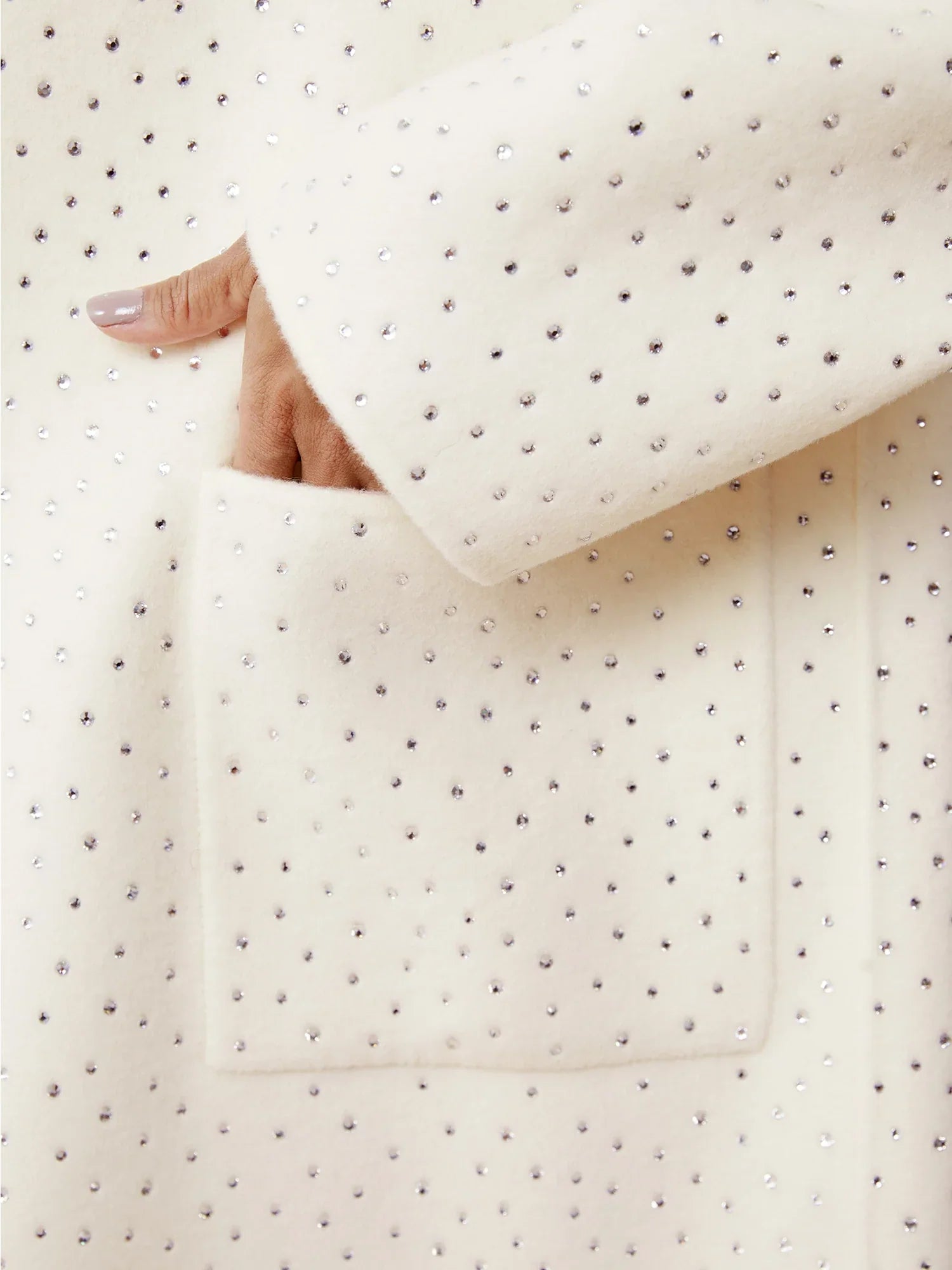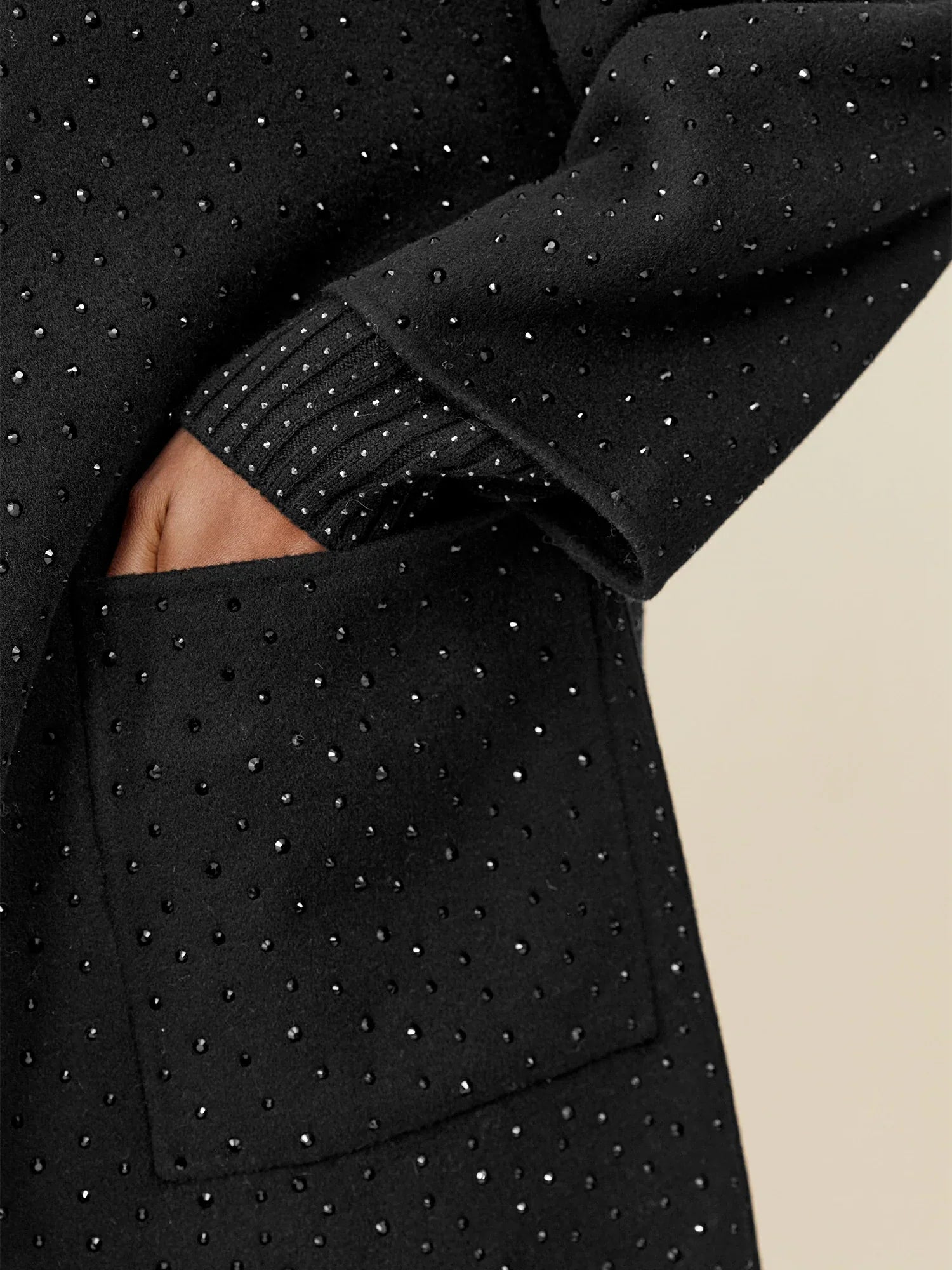 El yapımı Swarovski kristalleriyle süslenmiş bu palto, şık bir silüete, nervürlü yakaya ve hoş bir uyum sunan iyi yapılandırılmış bir kesime sahiptir. Cömert kesim, hacim eklemeden kolayca katmanlama olanağı sağlar.