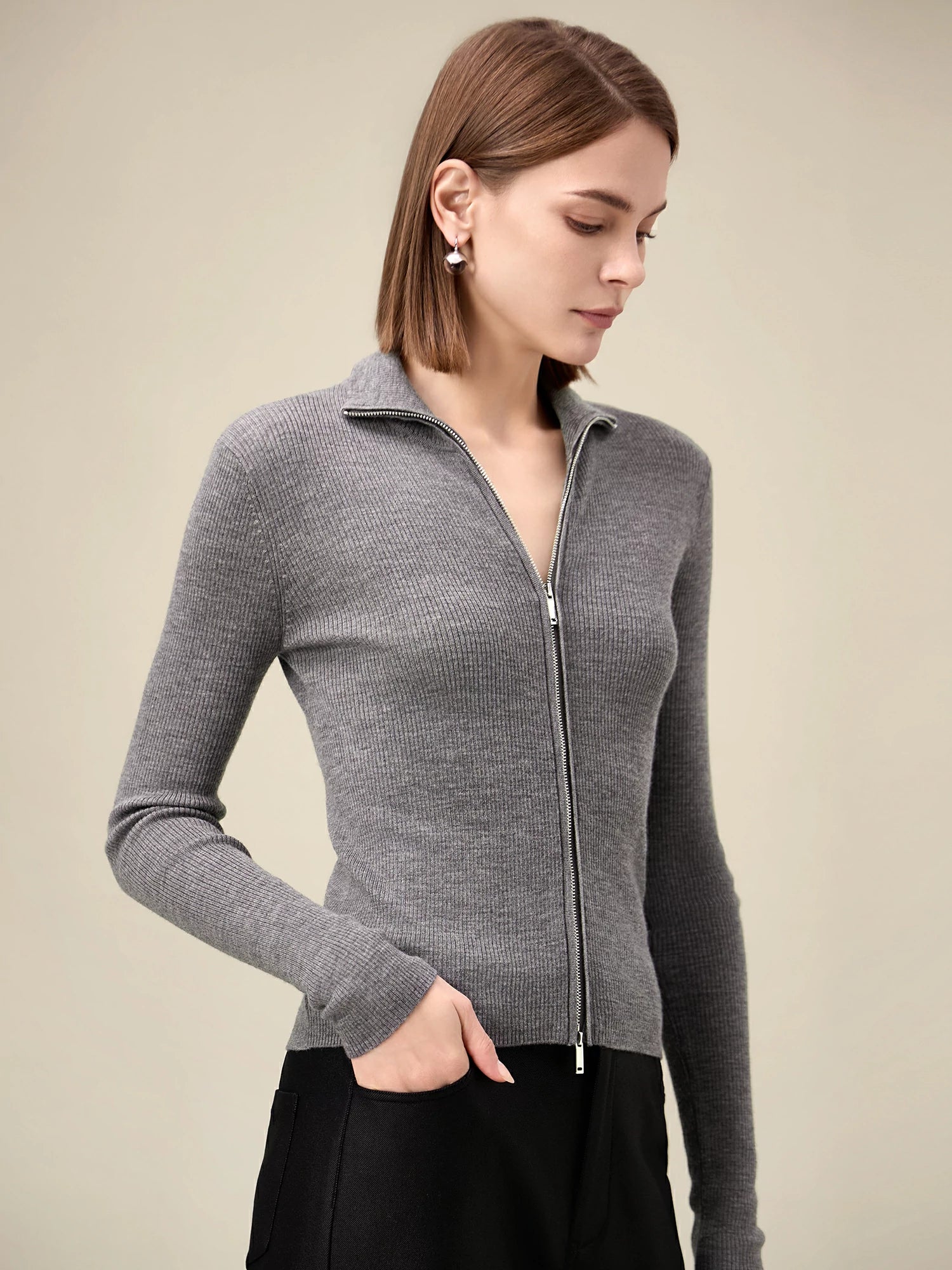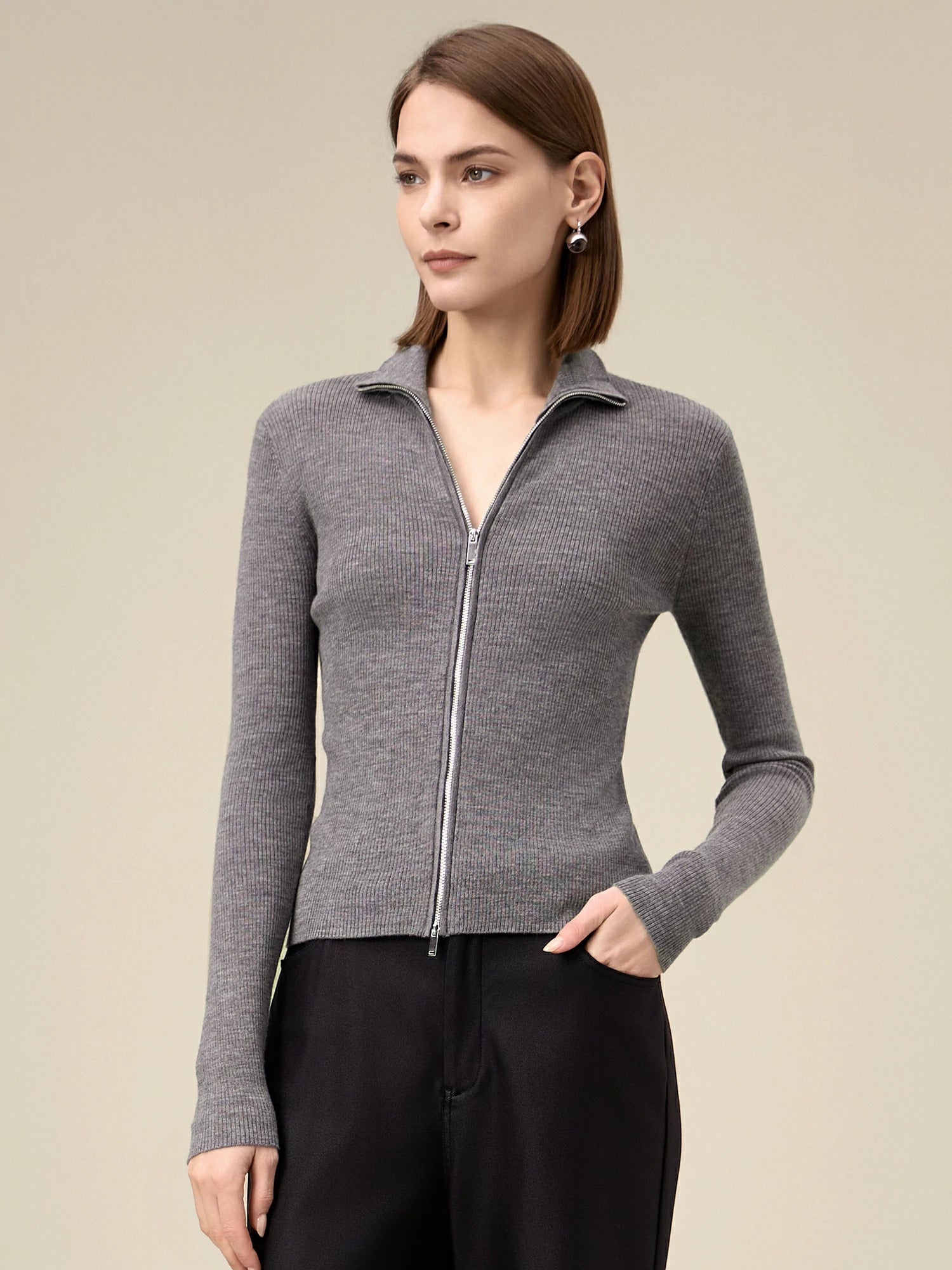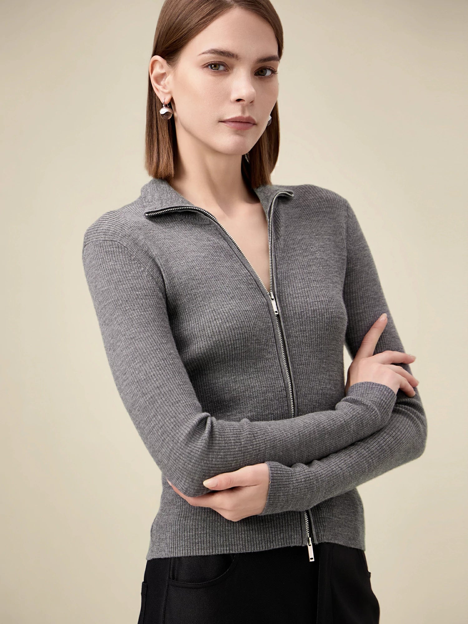 Yün Dik Yaka Çift Fermuarlı %100 Örgü Ceket