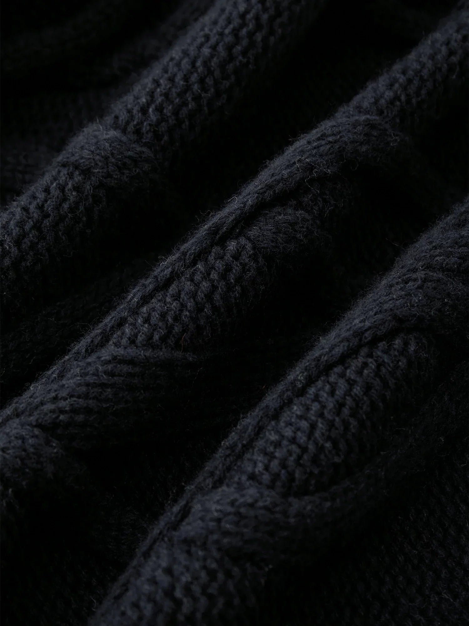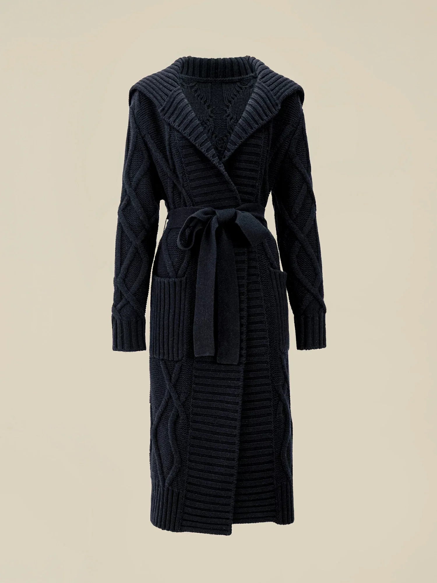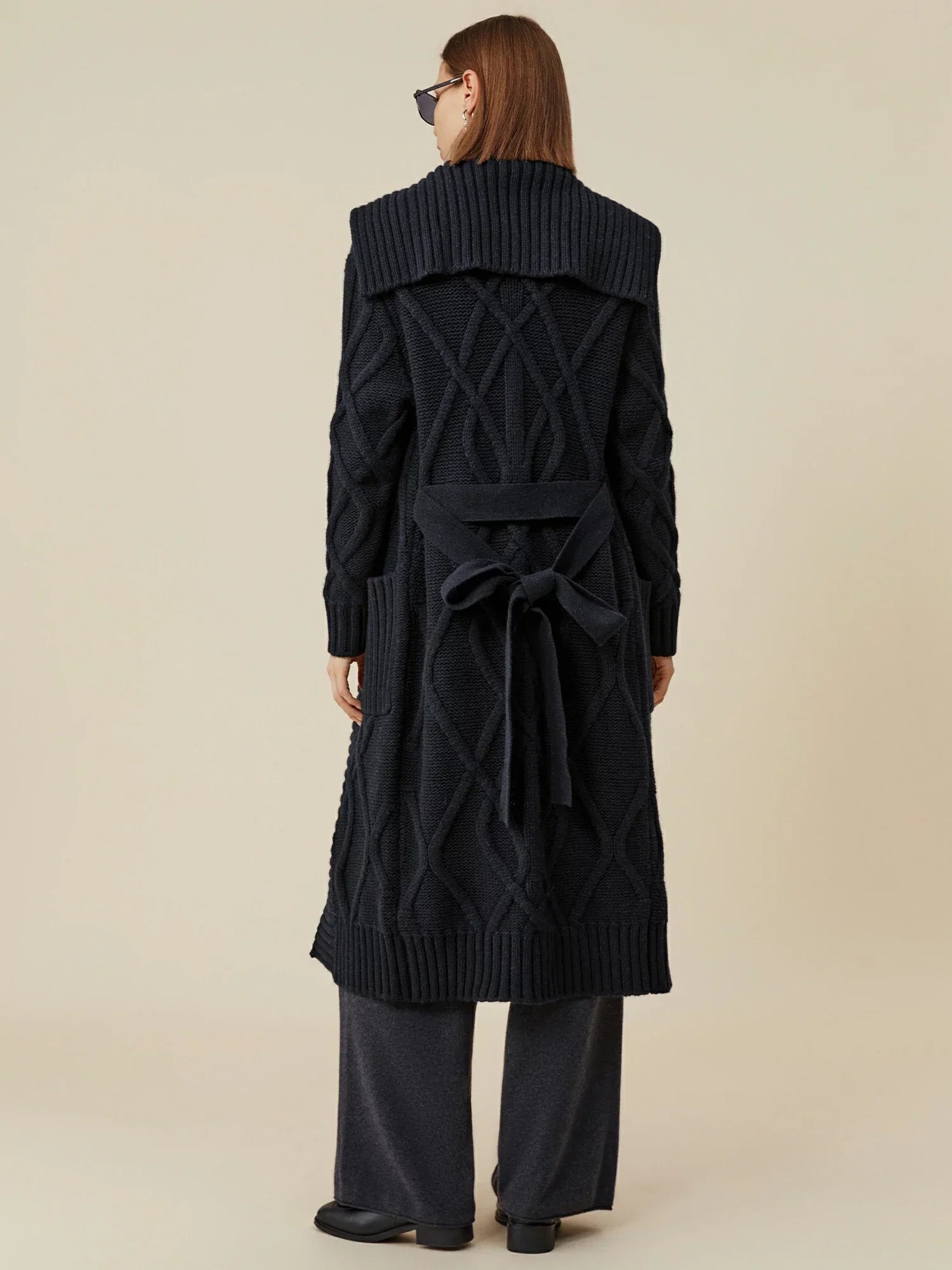 Simgesel Alen çiçek desenine ve benzersiz büyük yakaya sahip bu palto, yaka, manşet ve etek ucundaki bükülmüş ip dokusu ve nervürlü örgü detaylarıyla öne çıkıyor. Bel kemeri silueti sıkılaştırarak zarafet ve konfor katıyor.