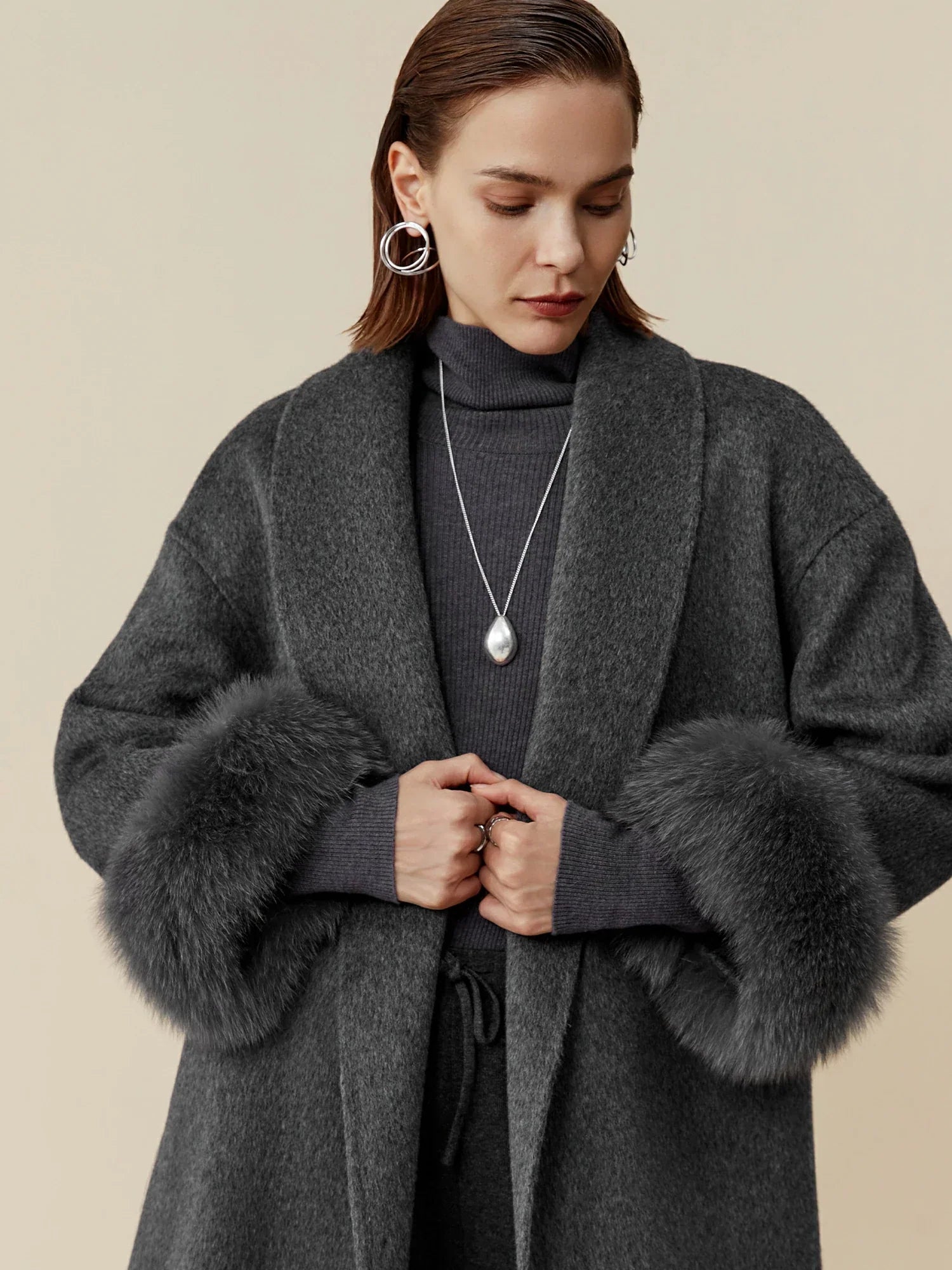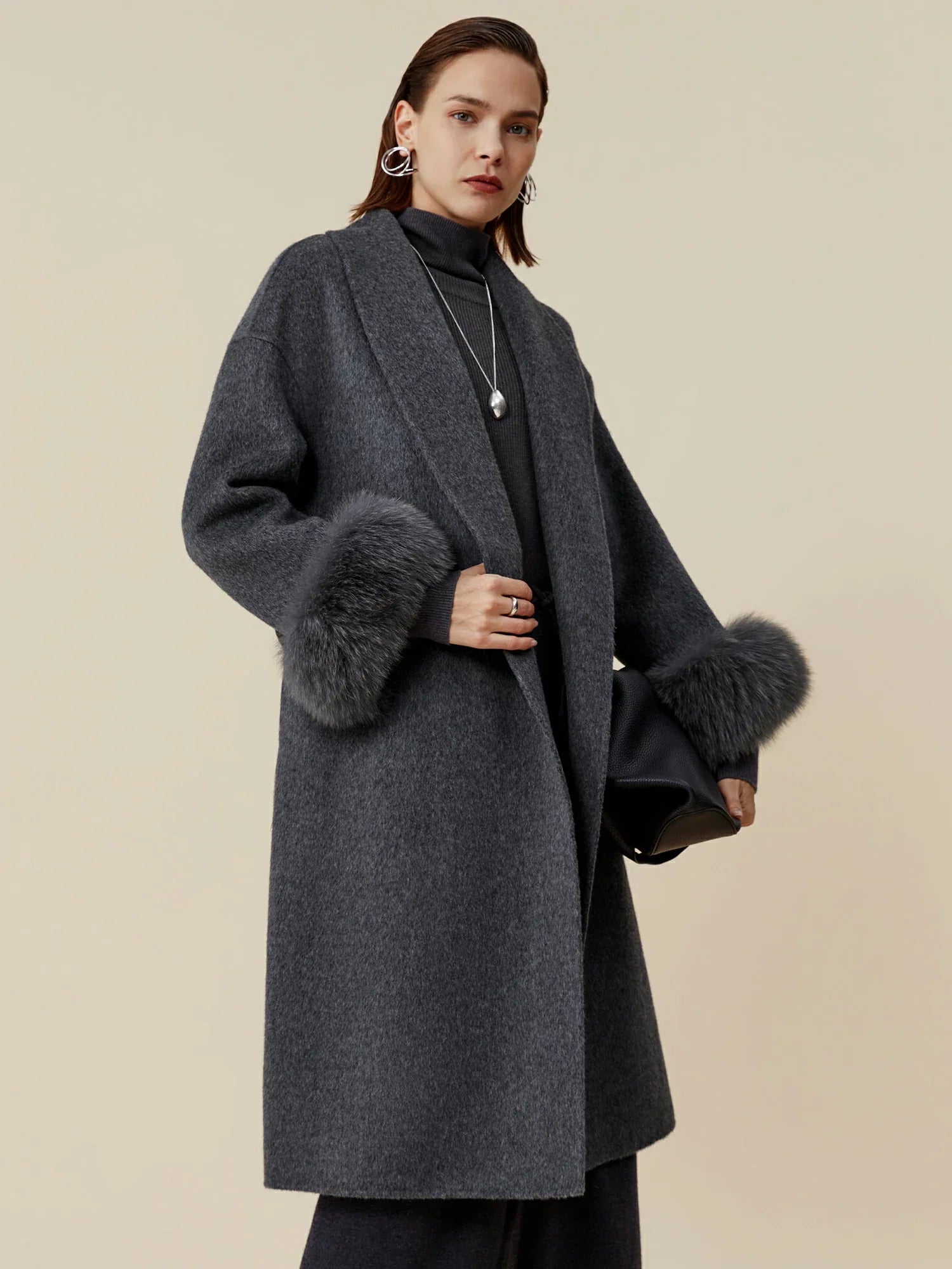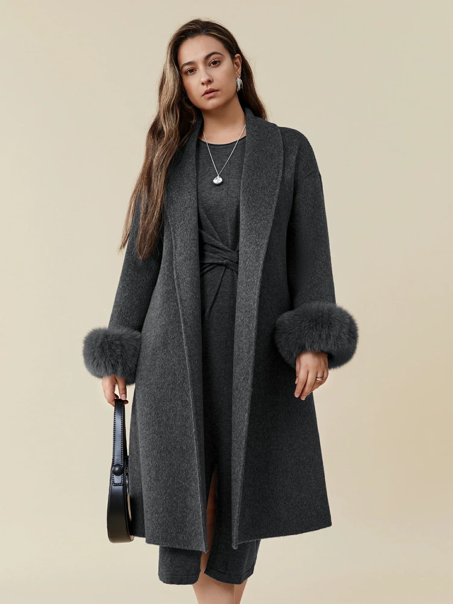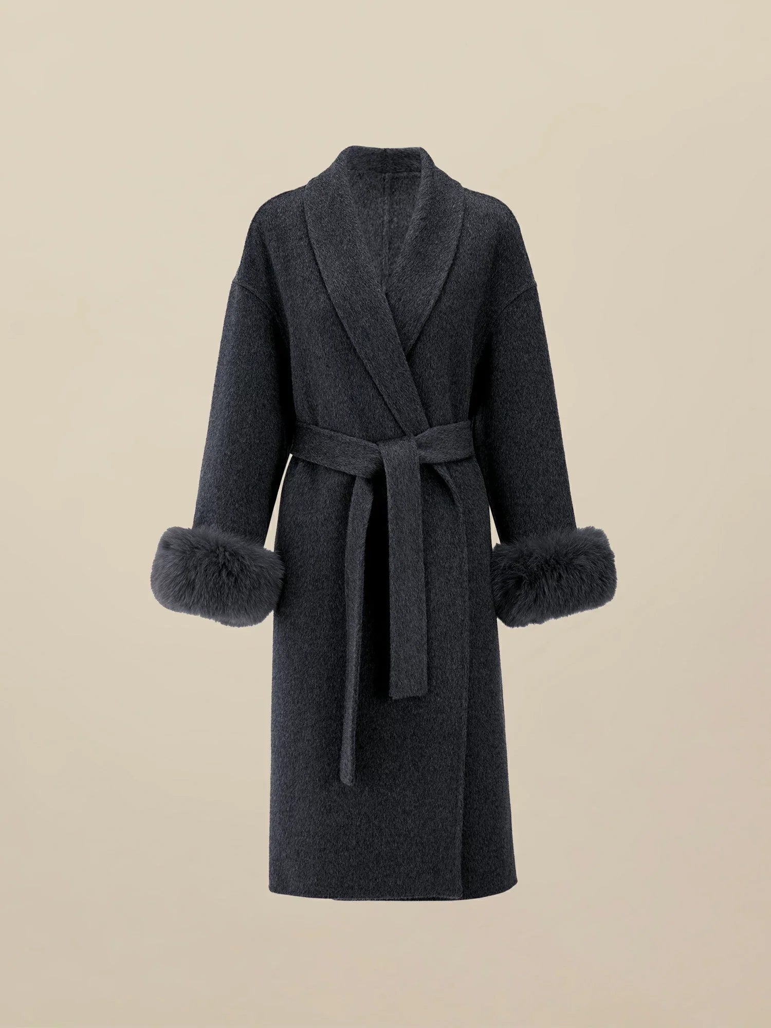 Yün Yaka Uzun Kollu Peluş Manşetli Uzun Kaban
