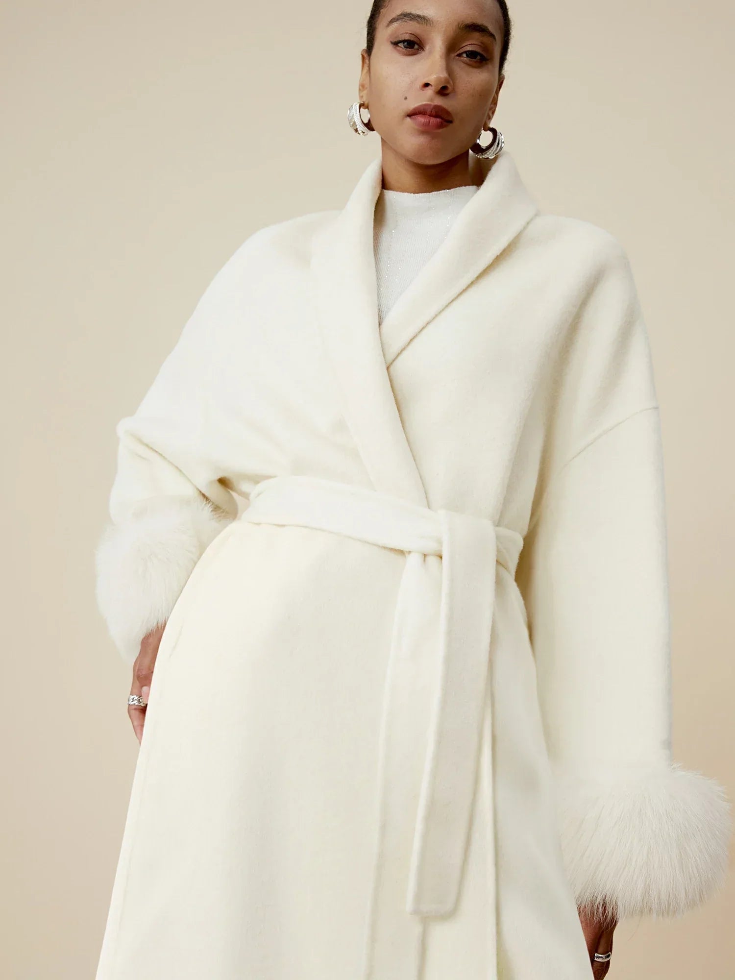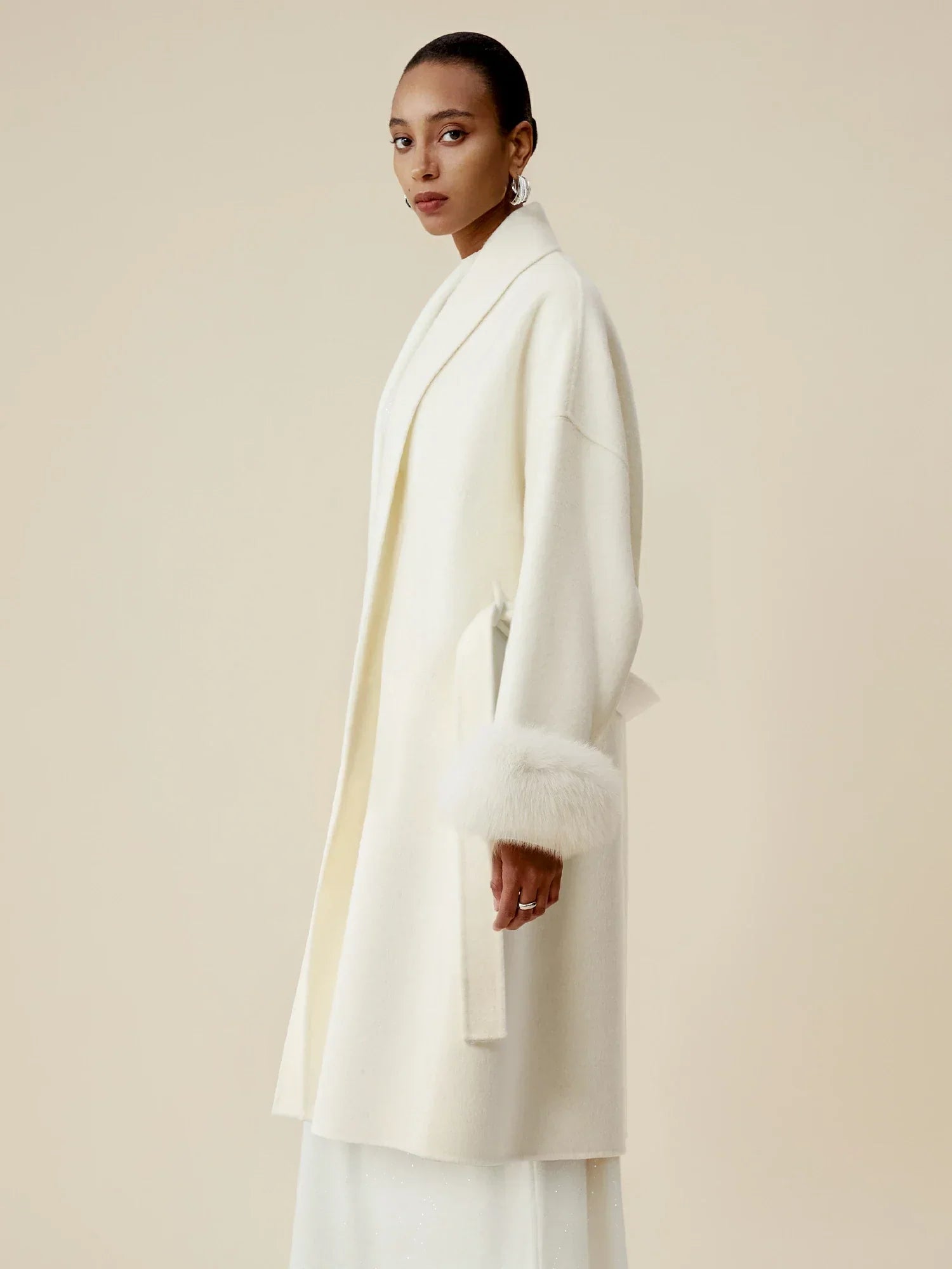 Tasarım : Sade ama zarif bir şal yakaya sahip olan bu palto, Fransız romantik cazibesini yansıtır. Uzun boyu ve rahat A kesim silueti ince ve rahat bir uyum sağlar. Çıkarılabilir hakiki tilki kürkü kollar lüks ve pratiklik katarken, damla omuz tasarımı pürüzsüz çizgiler ve rahat, asi bir yetenek yaratır.