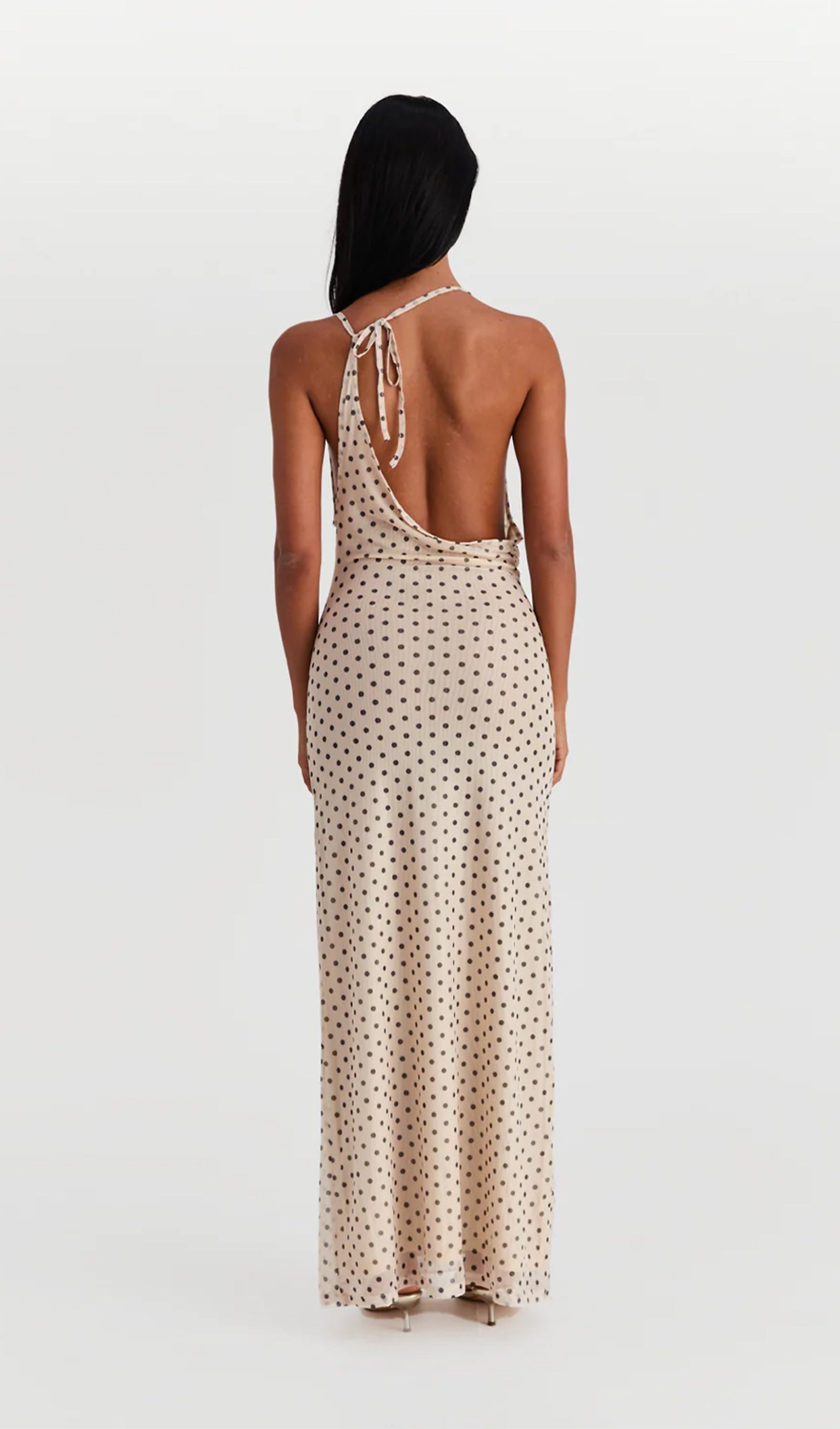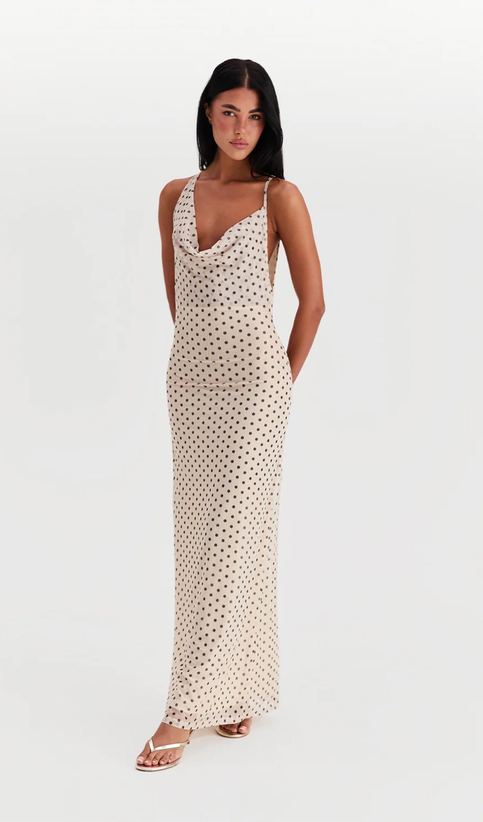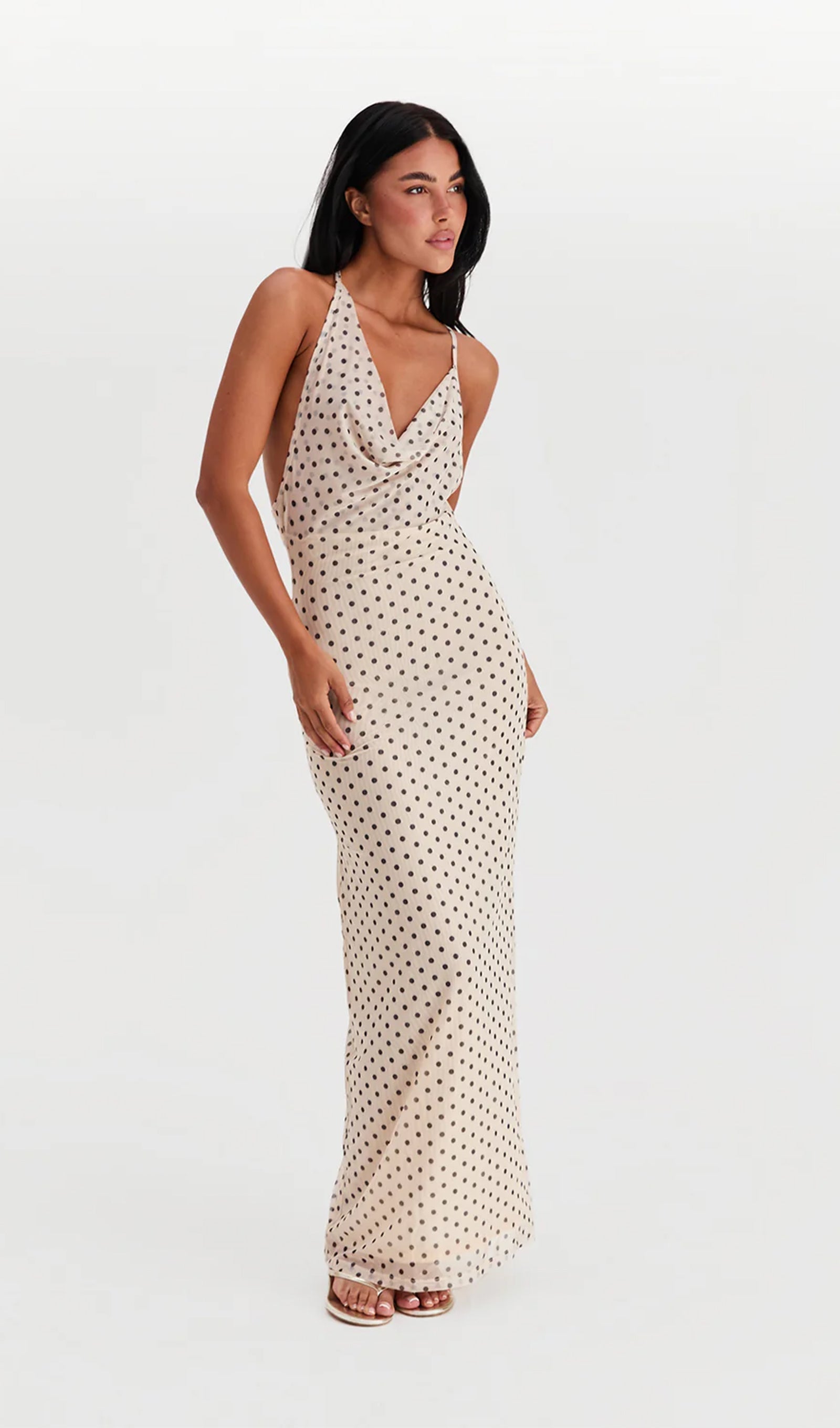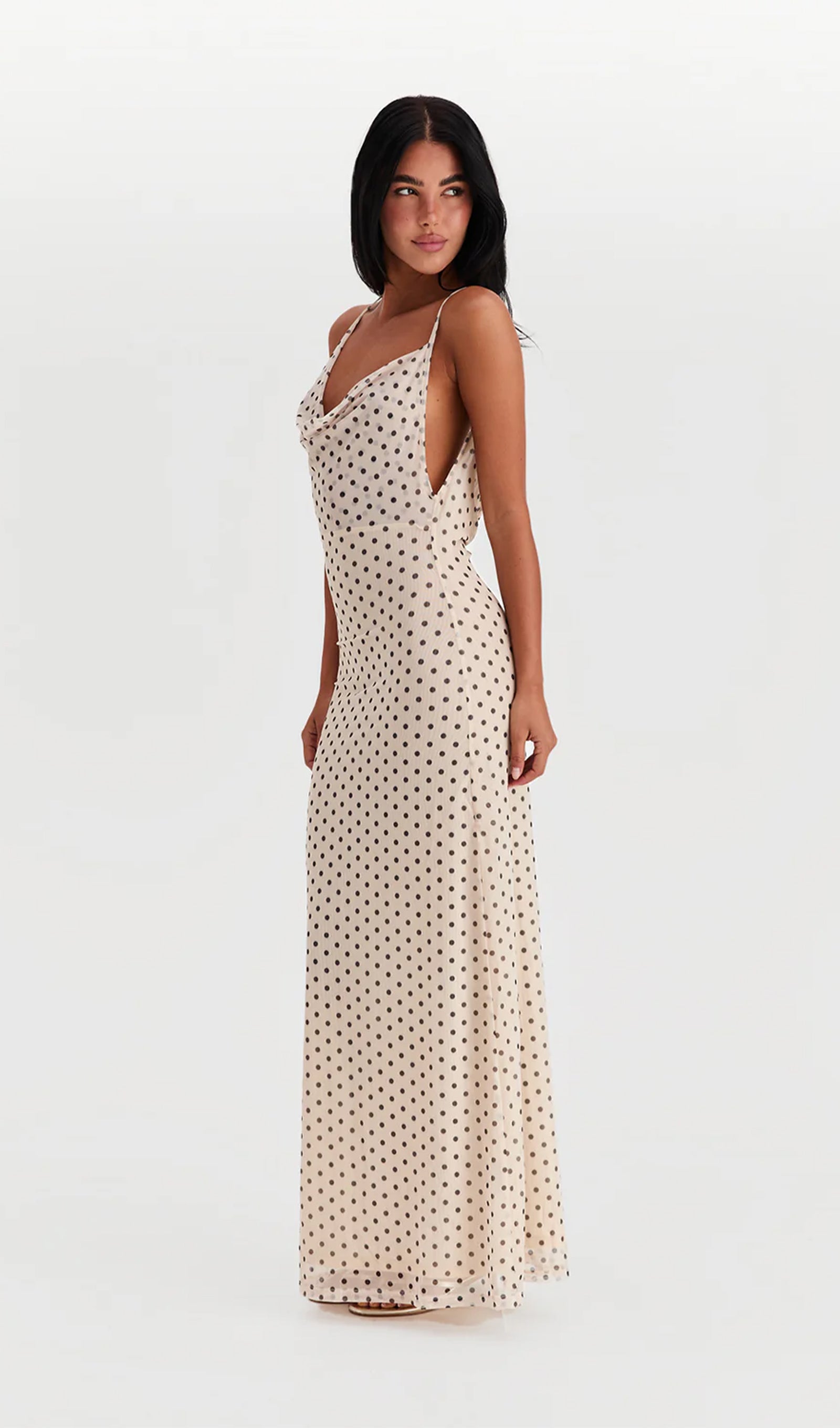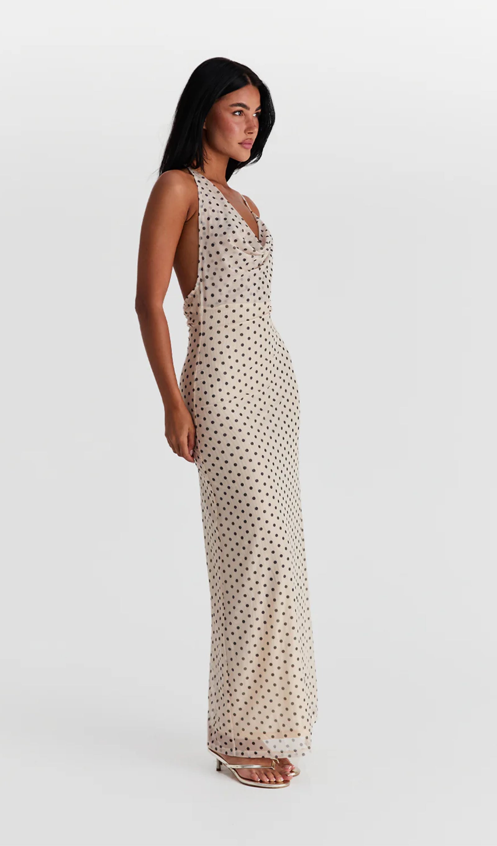 Asimetrik Kukuletalı Puantiyeli Maksi Elbise