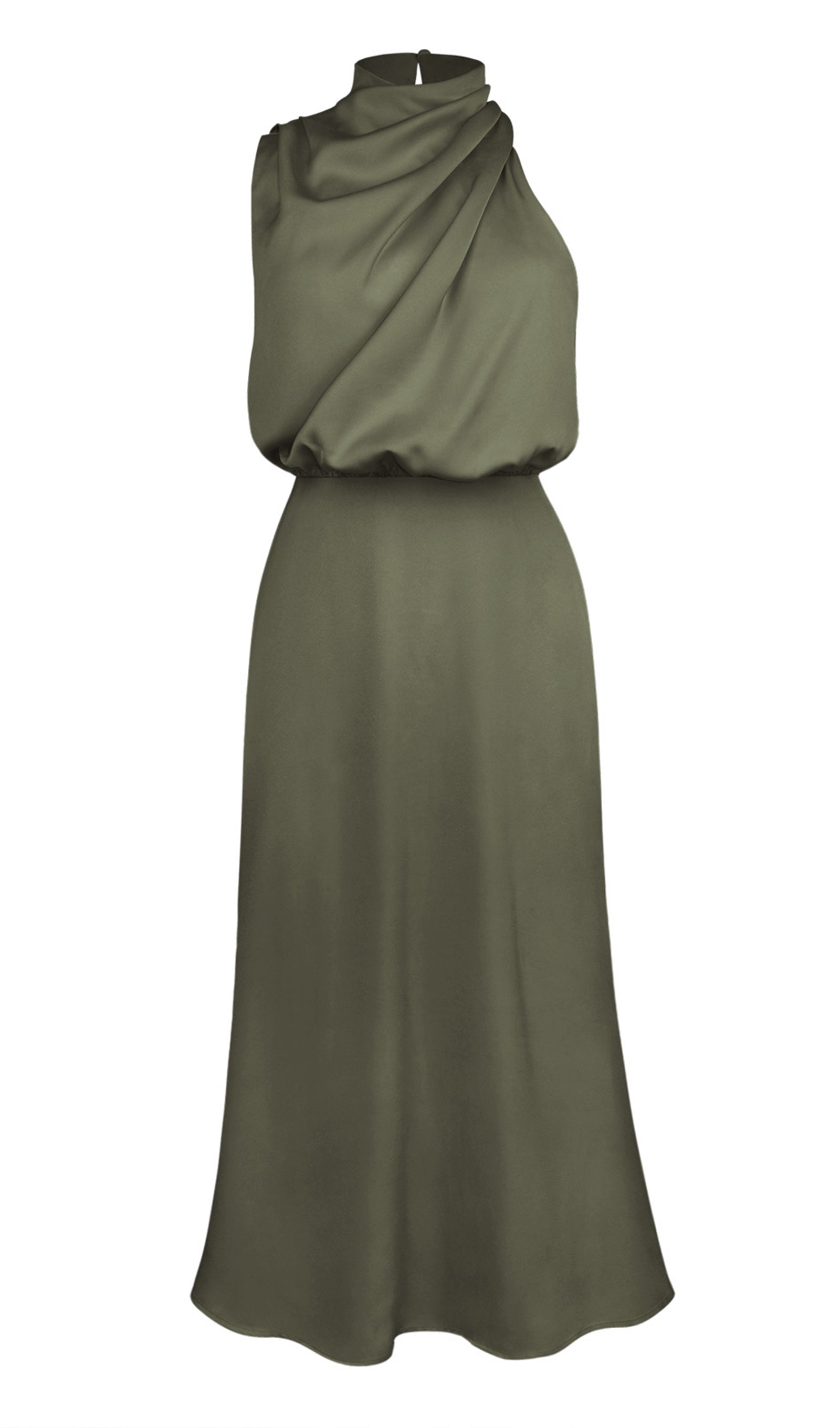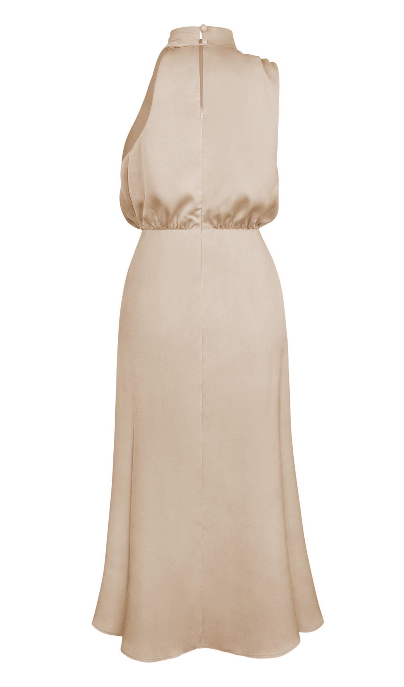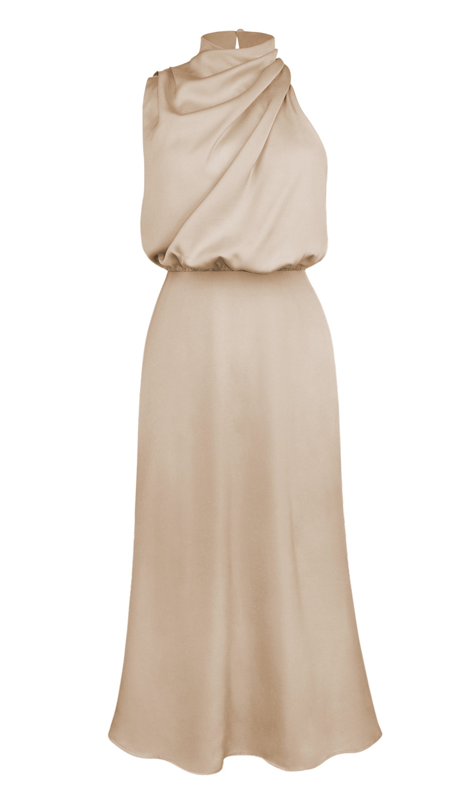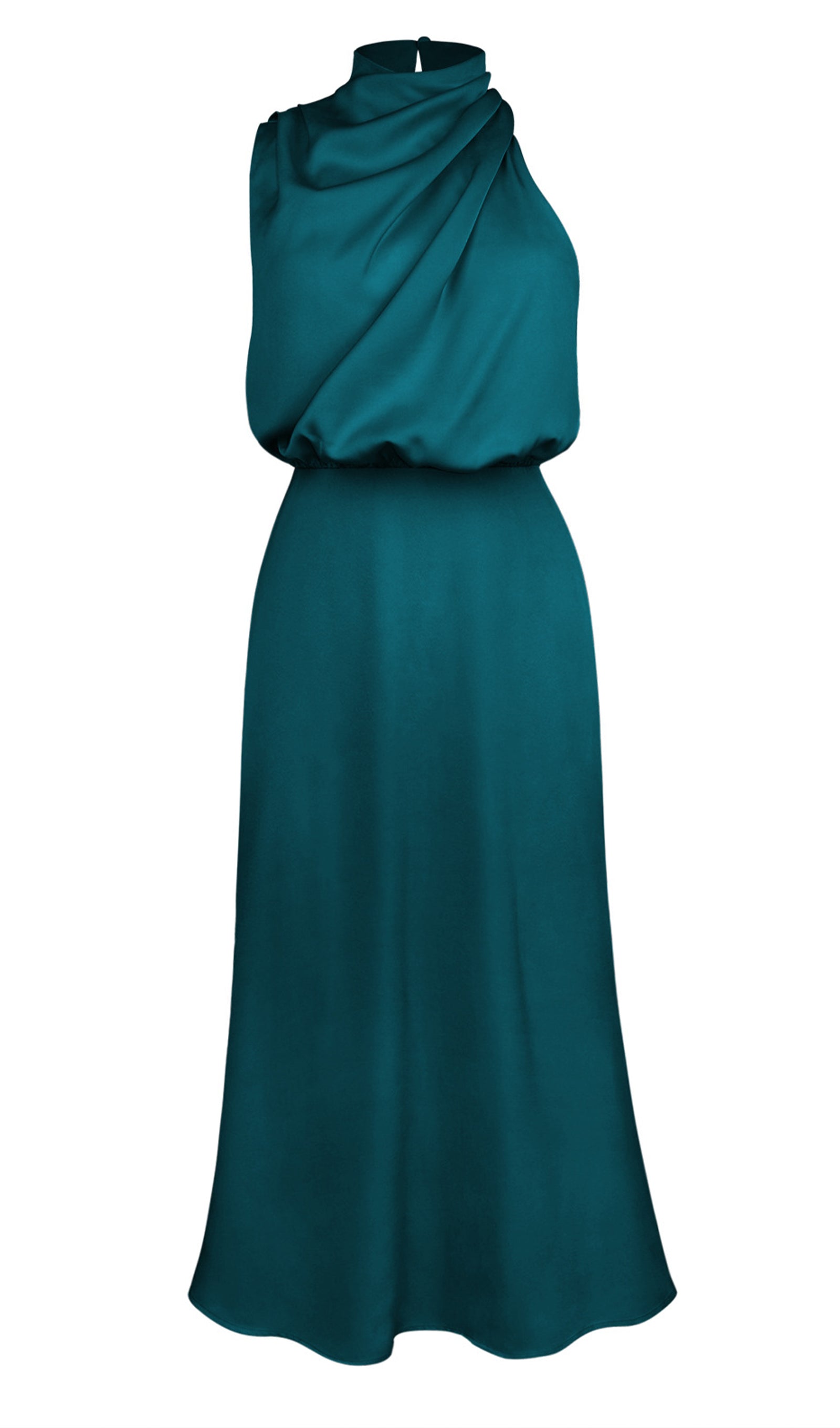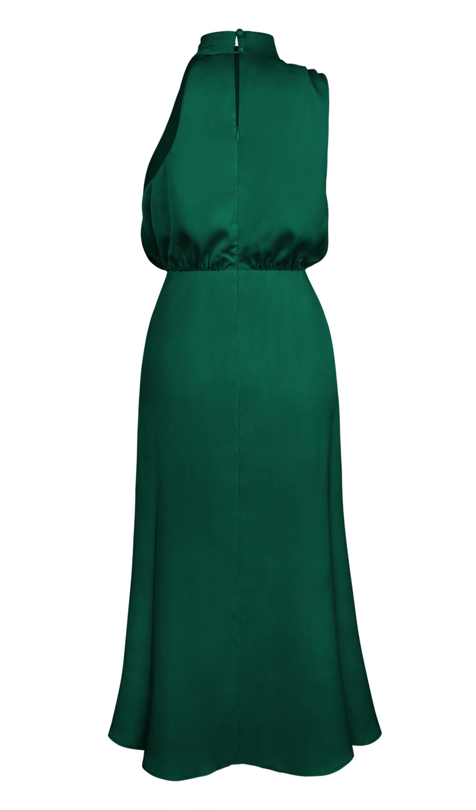 Bedeni boyunca uzanan asimetrik detaylarla sinirli bir hava kazanan bu saten kokteyl elbisesiyle en çekici halinizi hissedin.