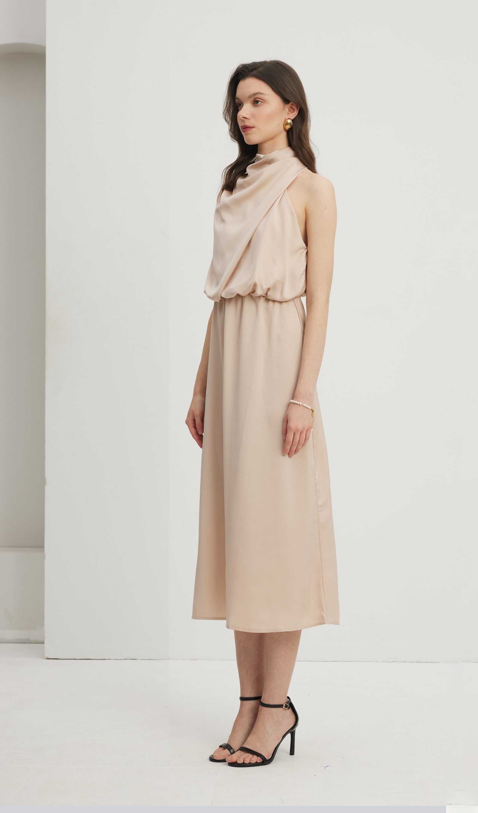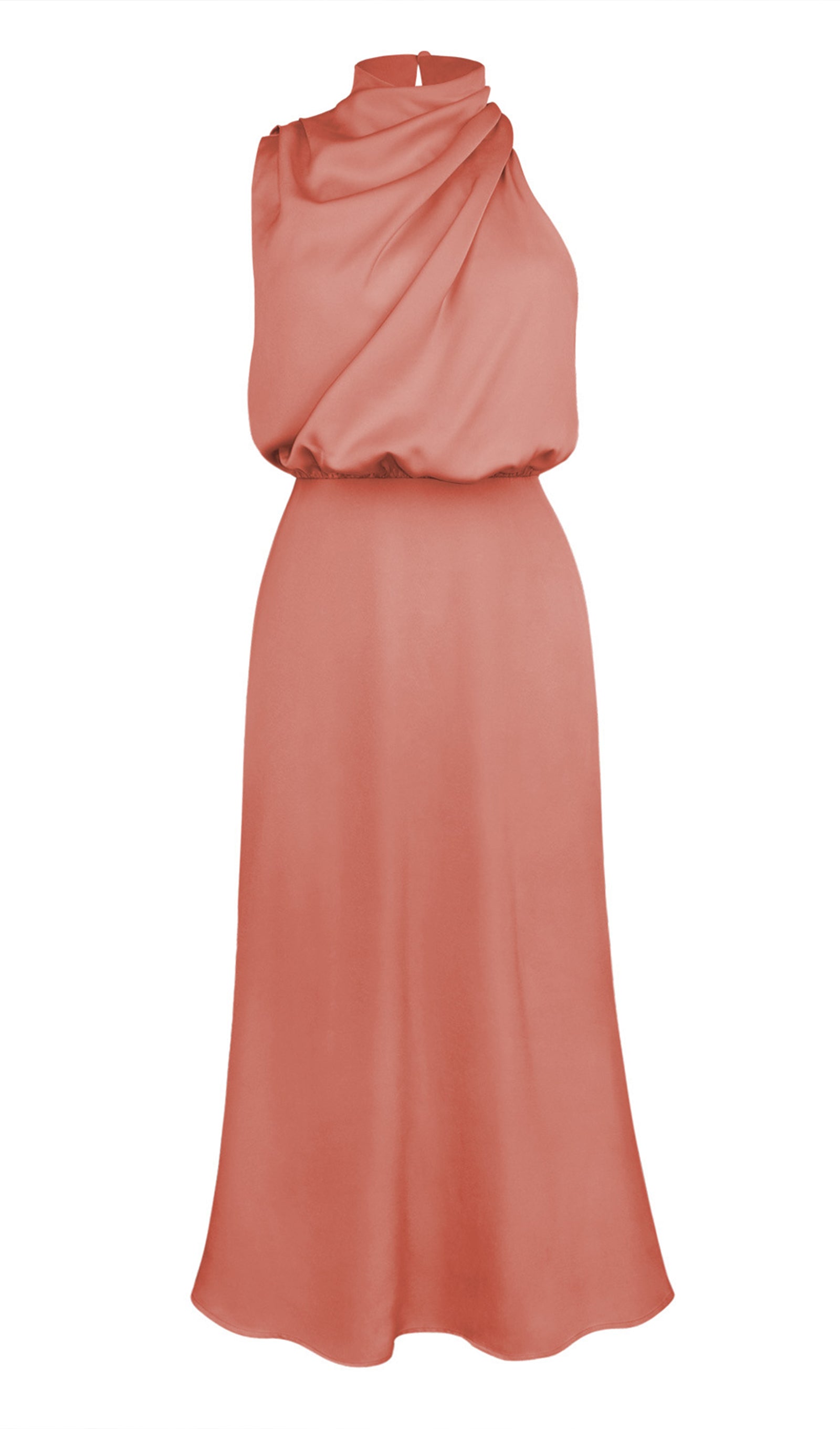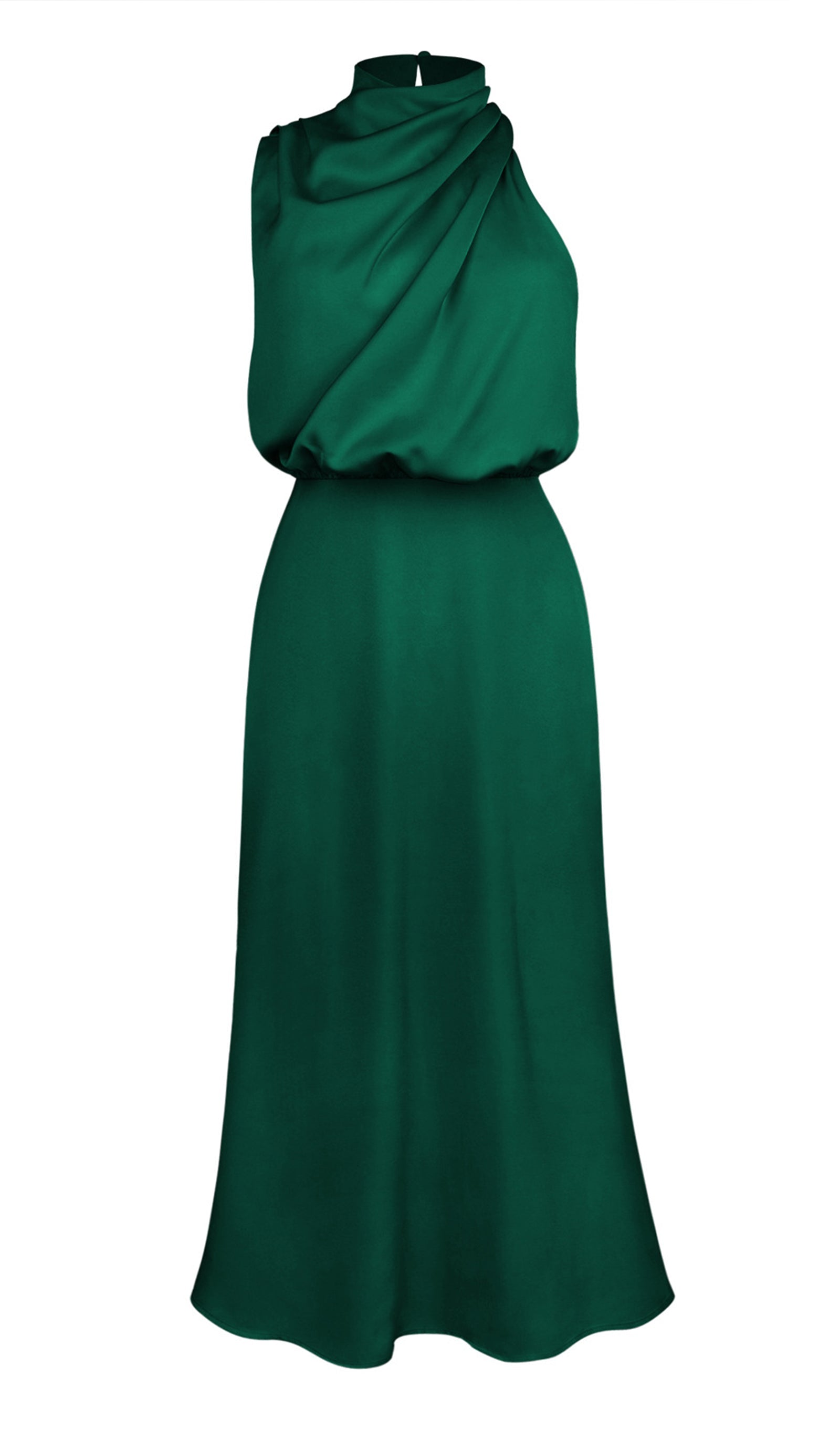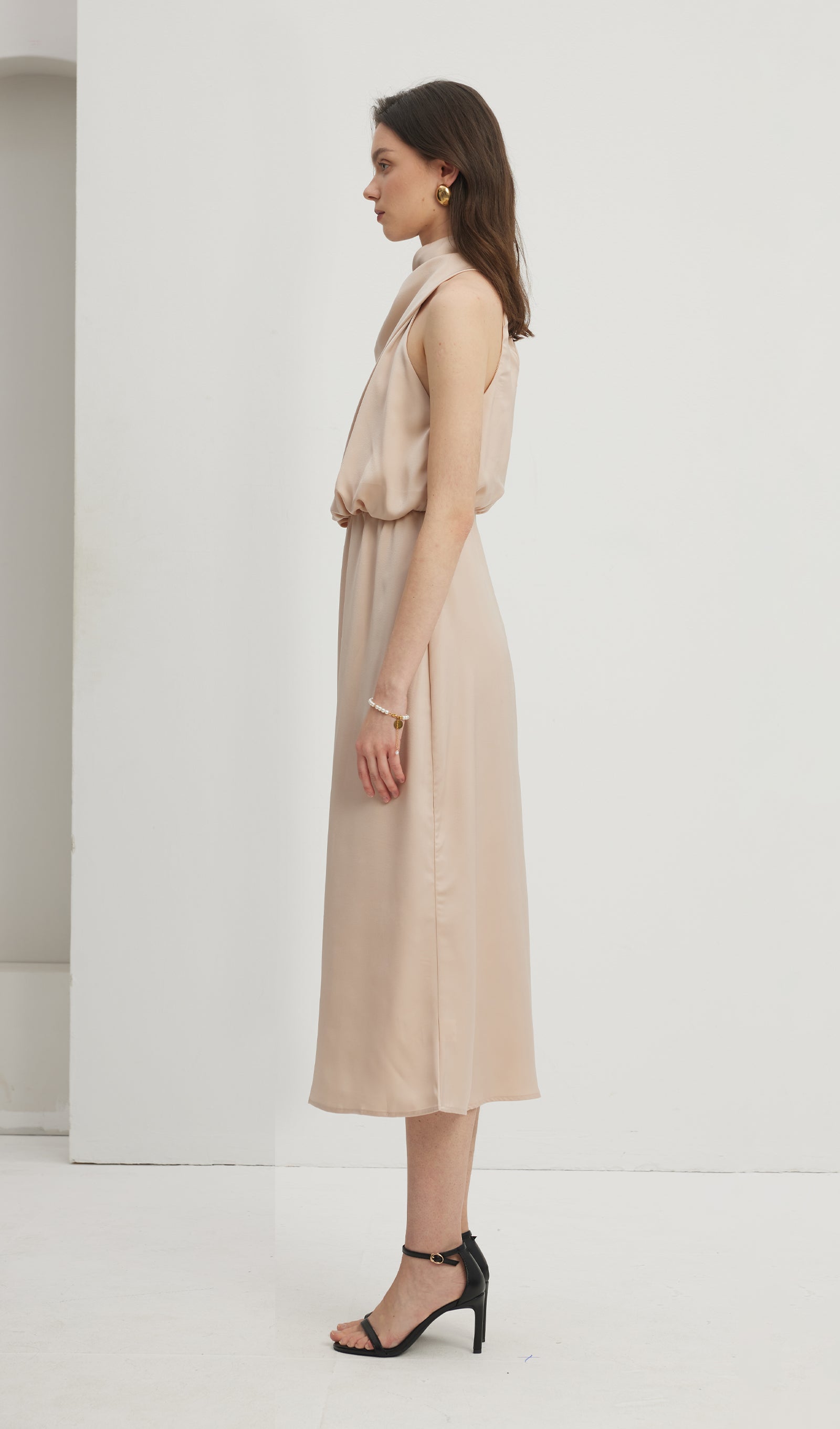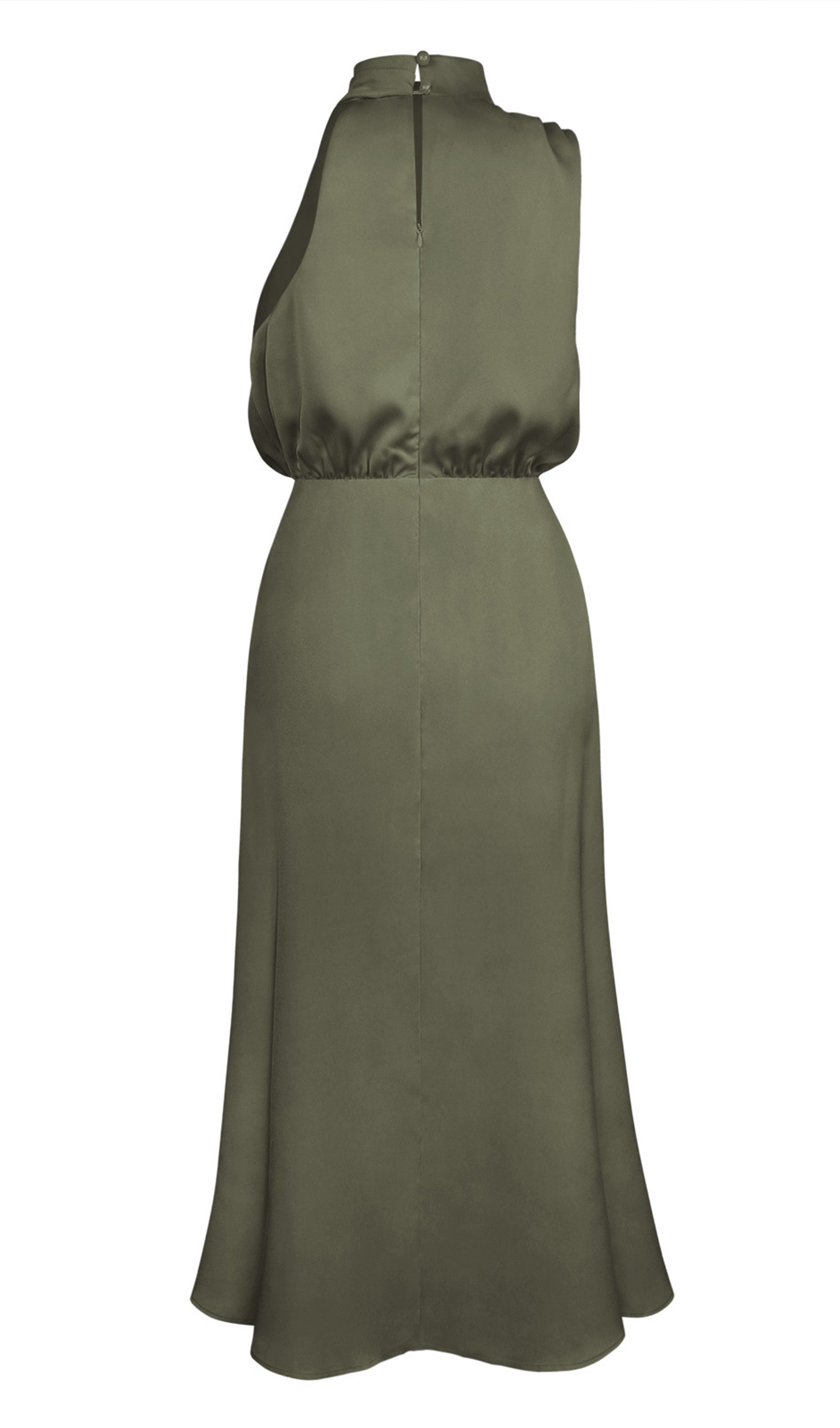 Bedeni boyunca uzanan asimetrik detaylarla sinirli bir hava kazanan bu saten kokteyl elbisesiyle en çekici halinizi hissedin.