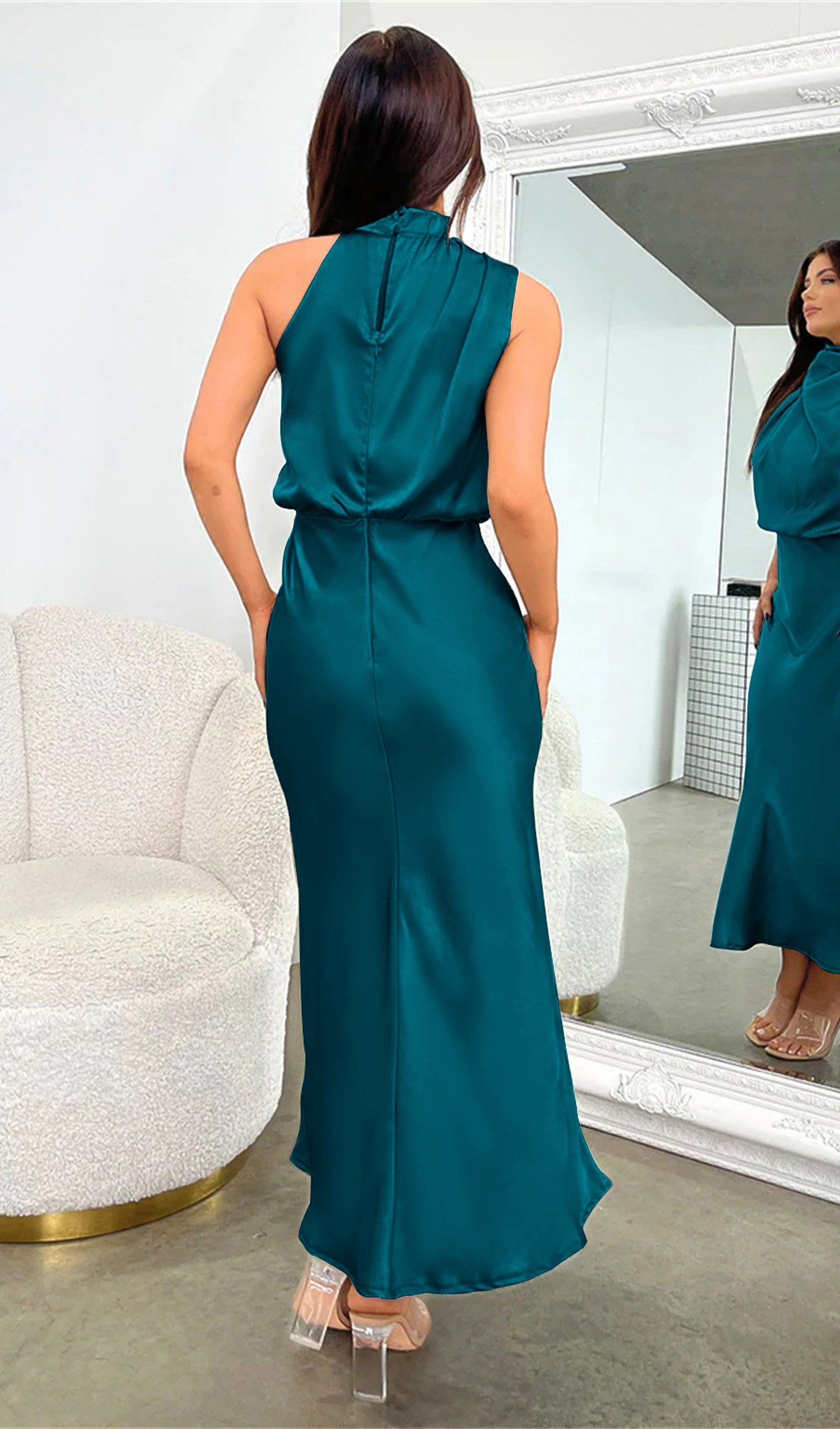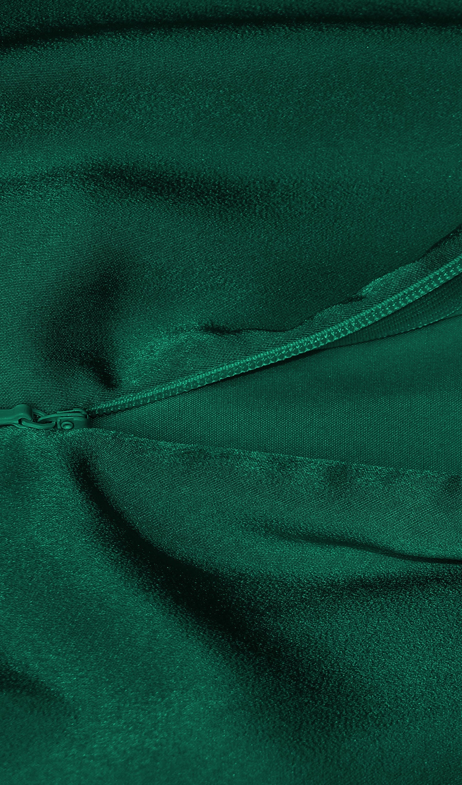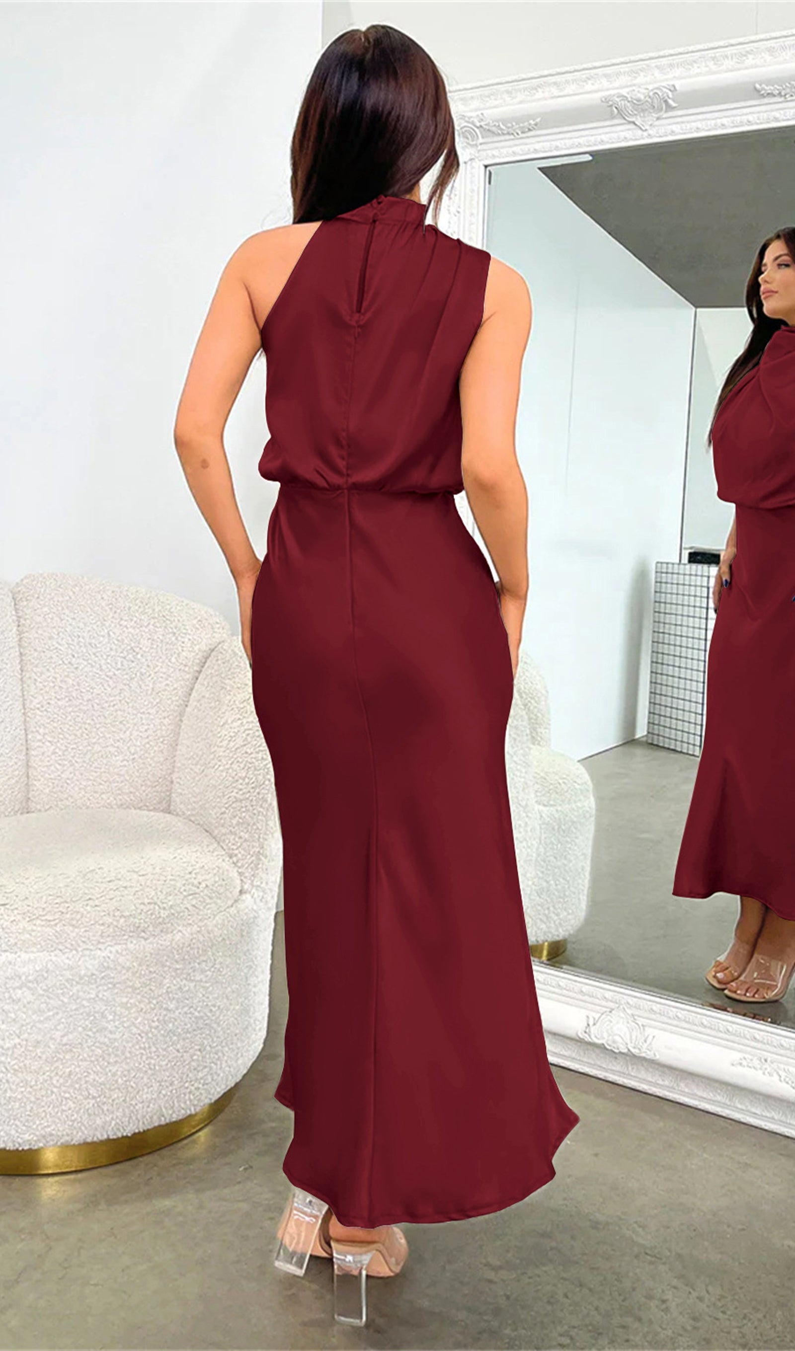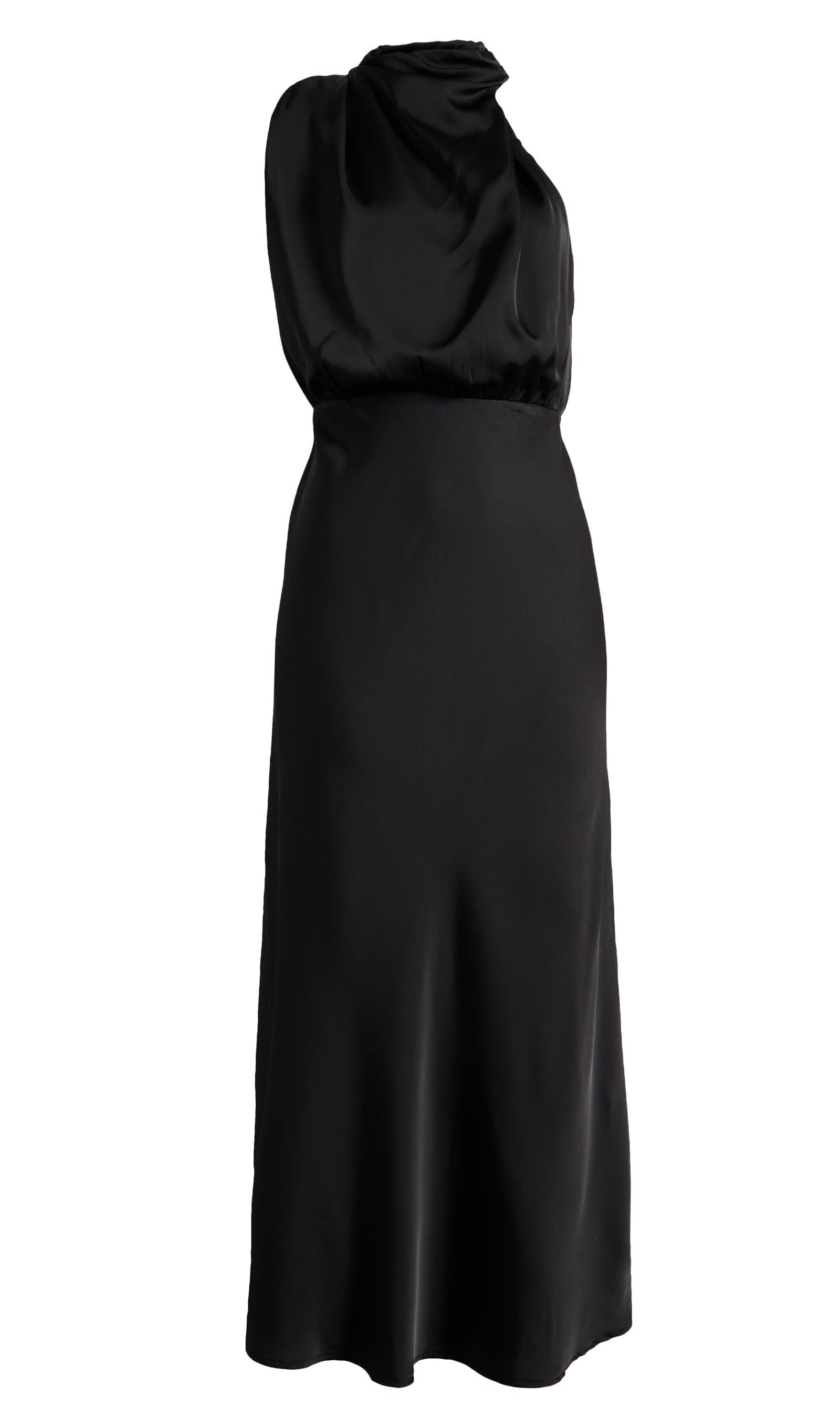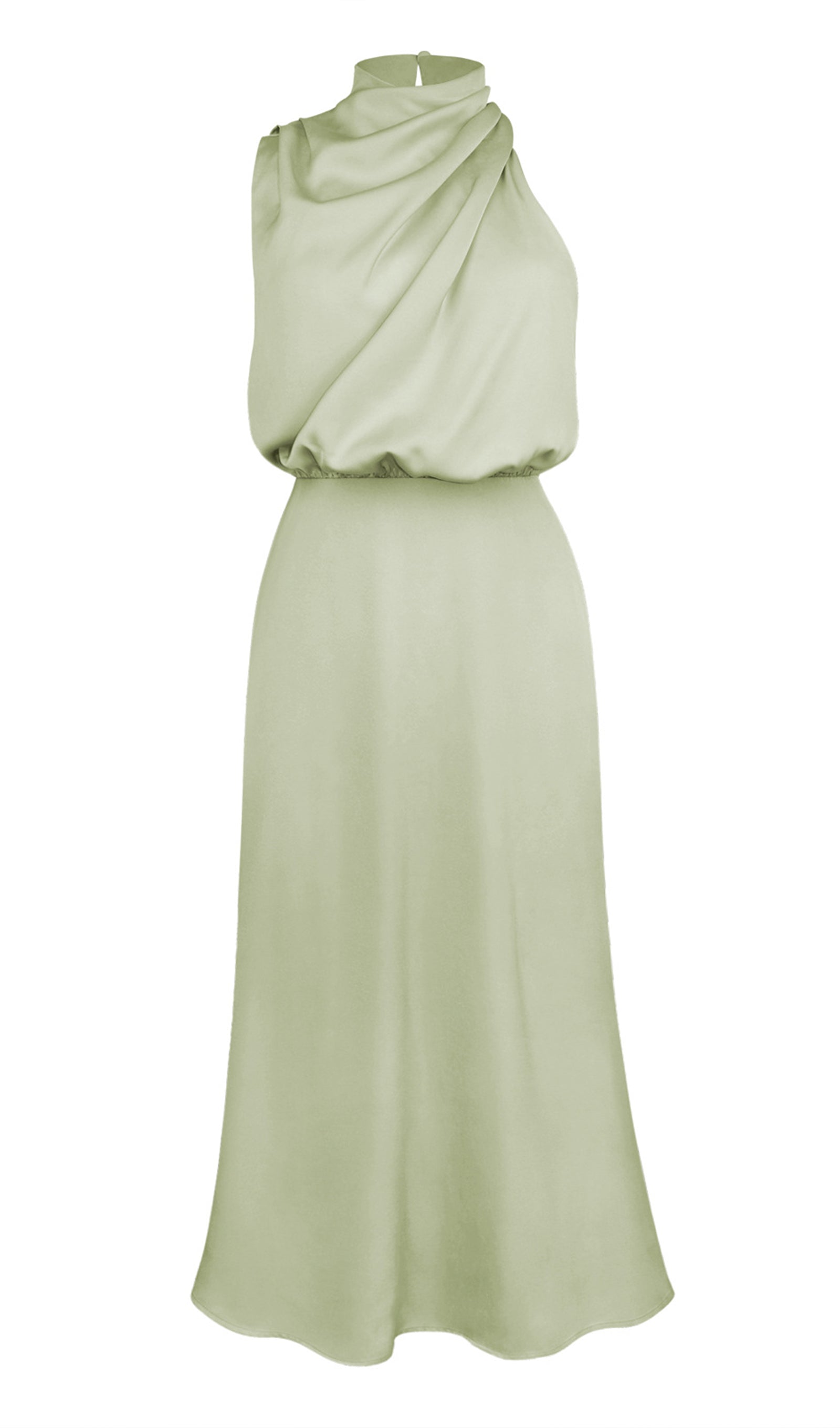 Bedeni boyunca uzanan asimetrik detaylarla sinirli bir hava kazanan bu saten kokteyl elbisesiyle en çekici halinizi hissedin.