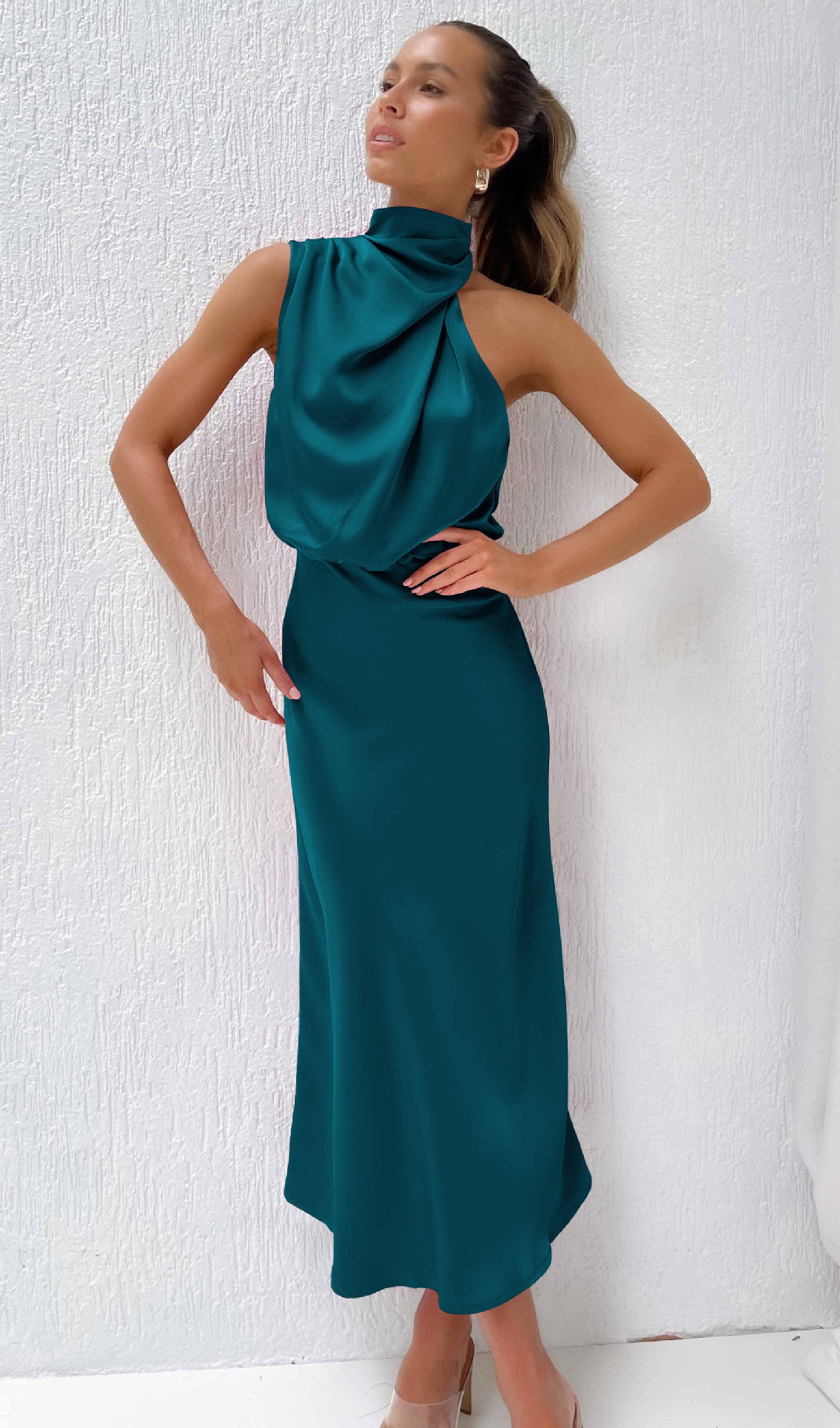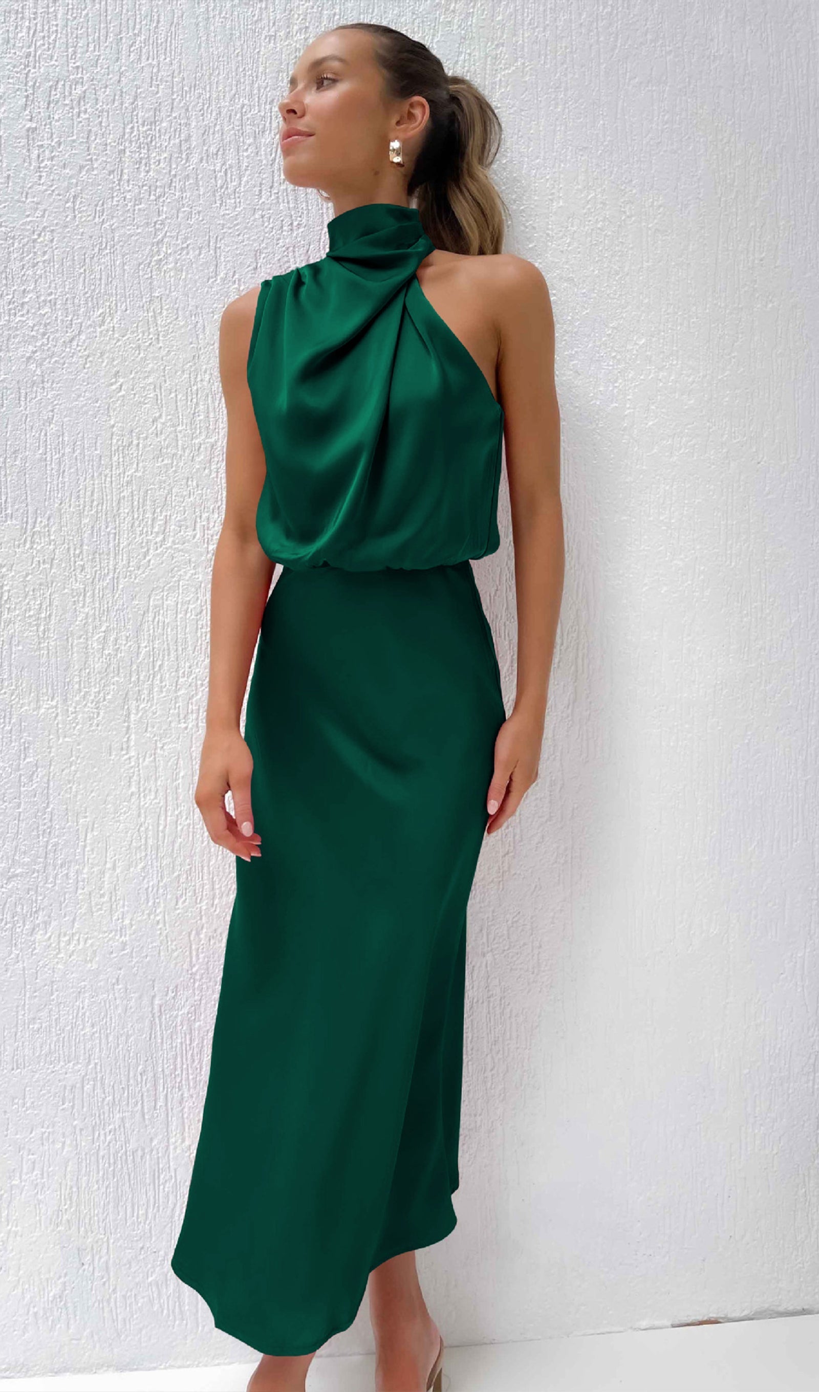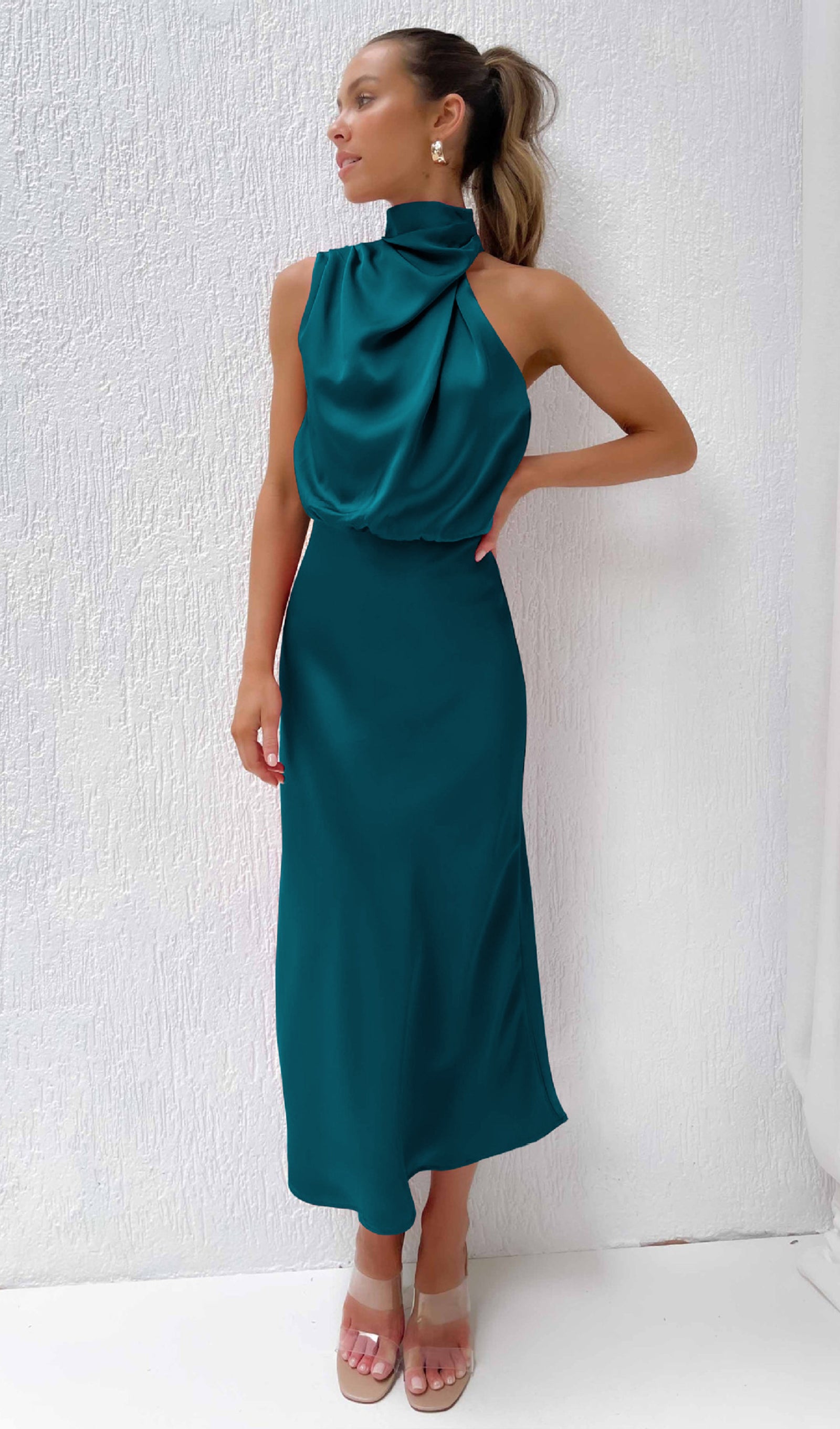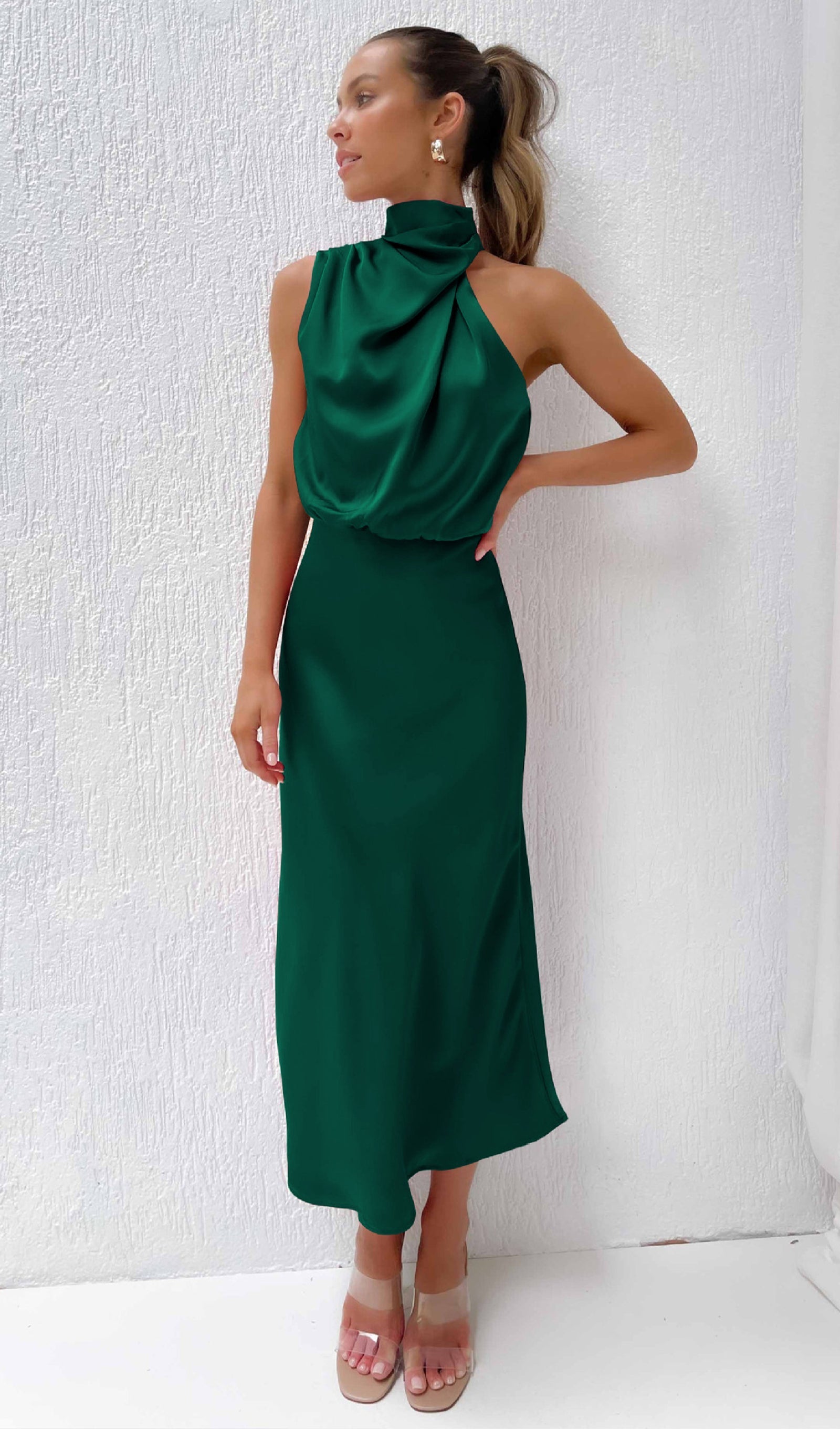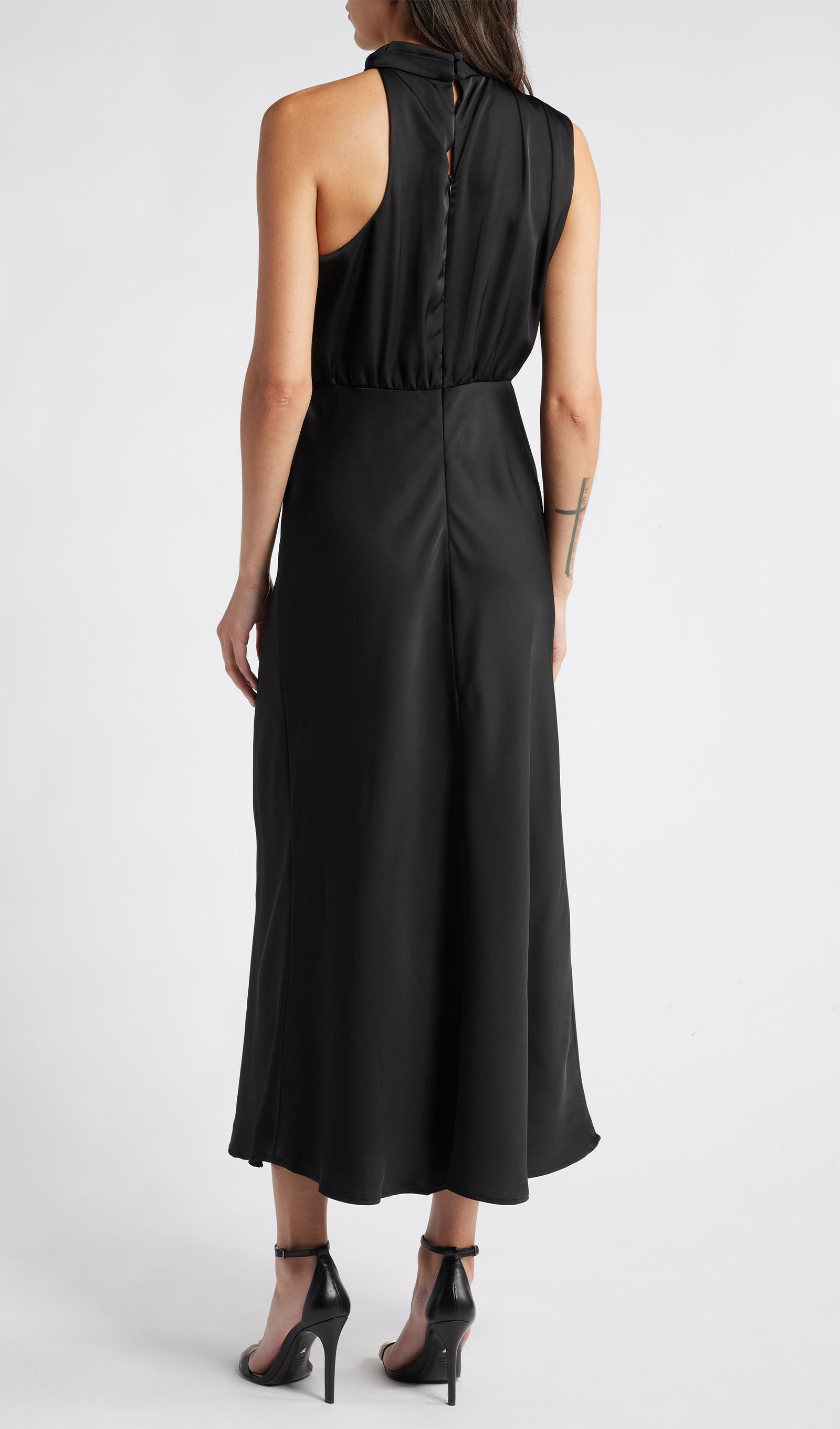 Bedeni boyunca uzanan asimetrik detaylarla sinirli bir hava kazanan bu saten kokteyl elbisesiyle en çekici halinizi hissedin.