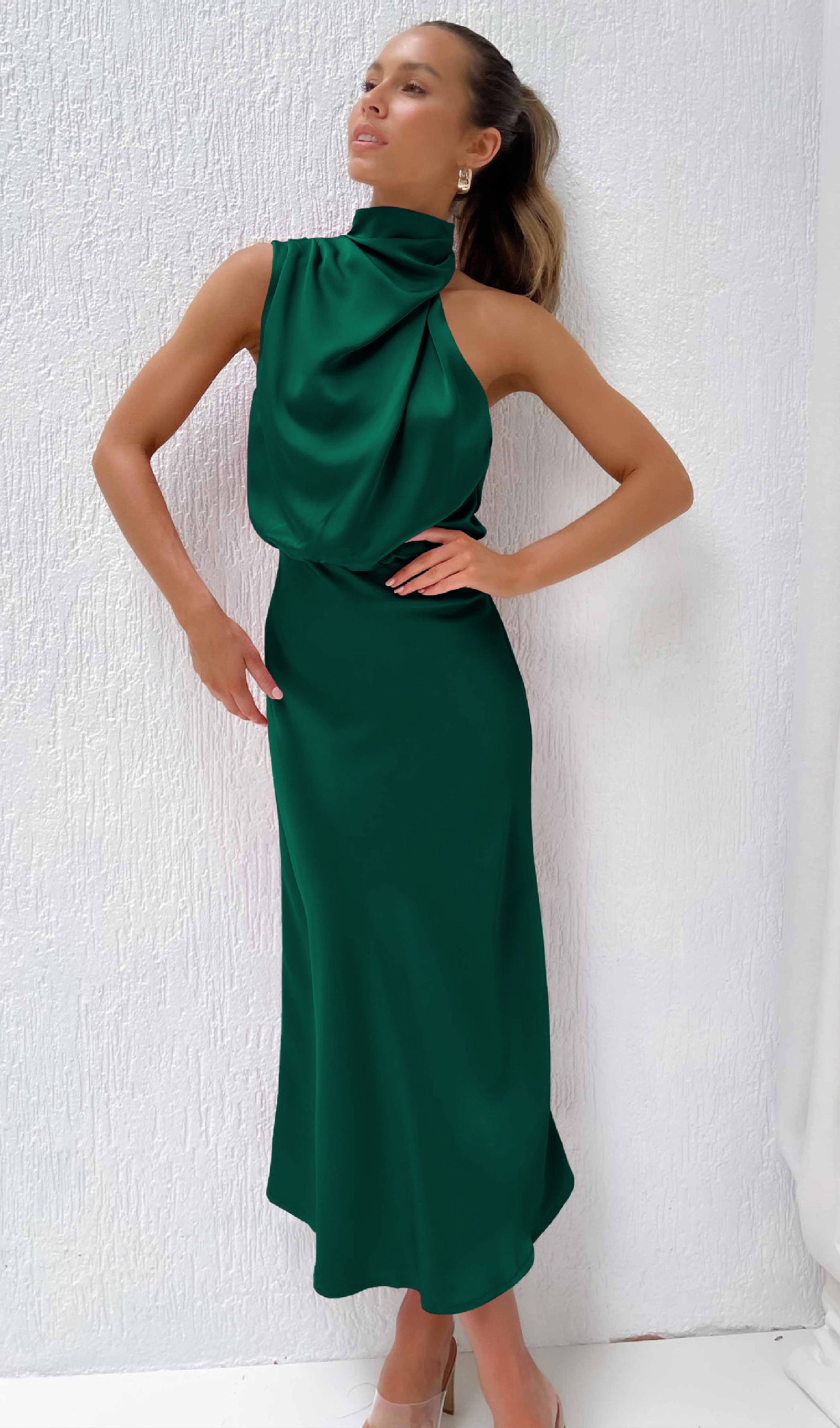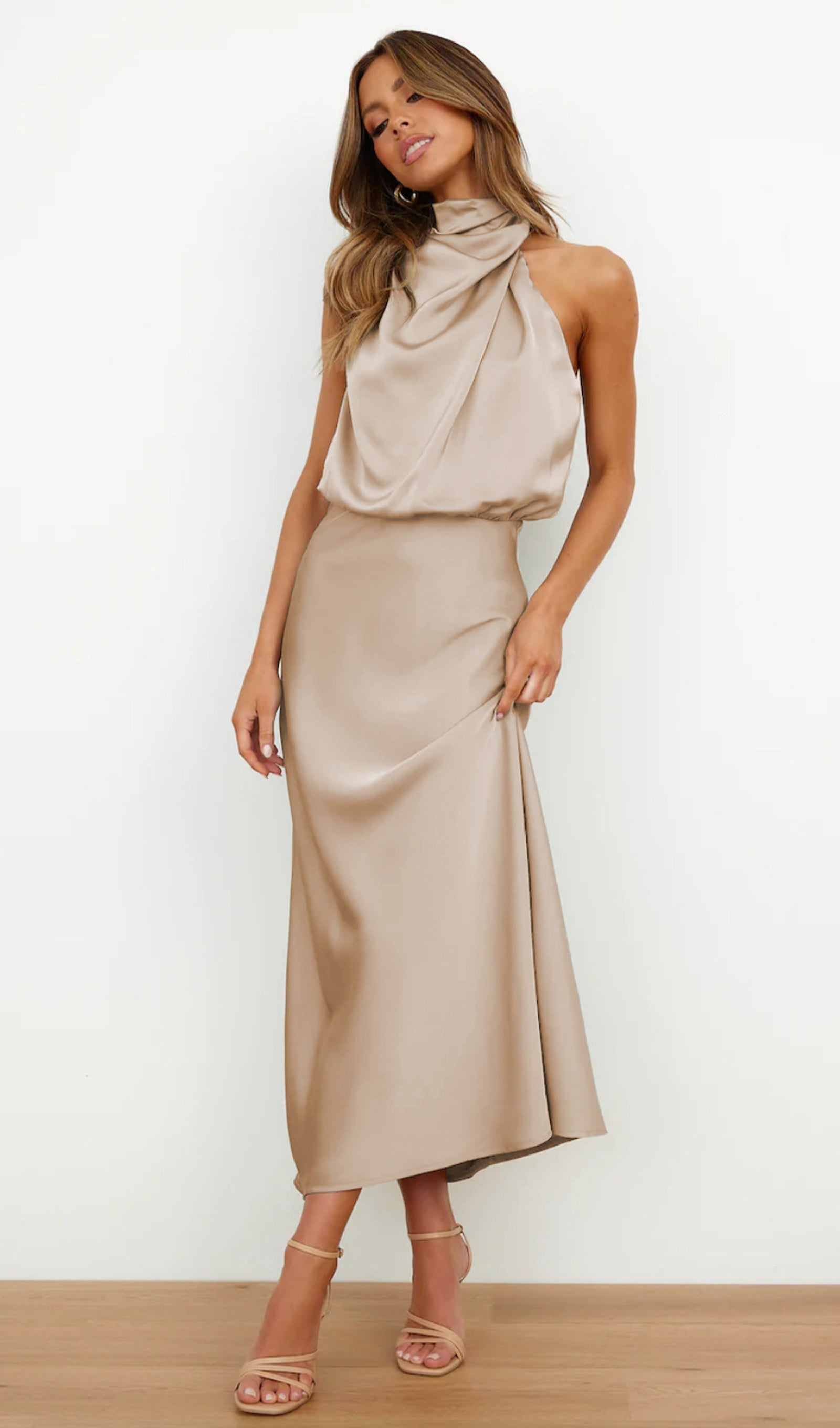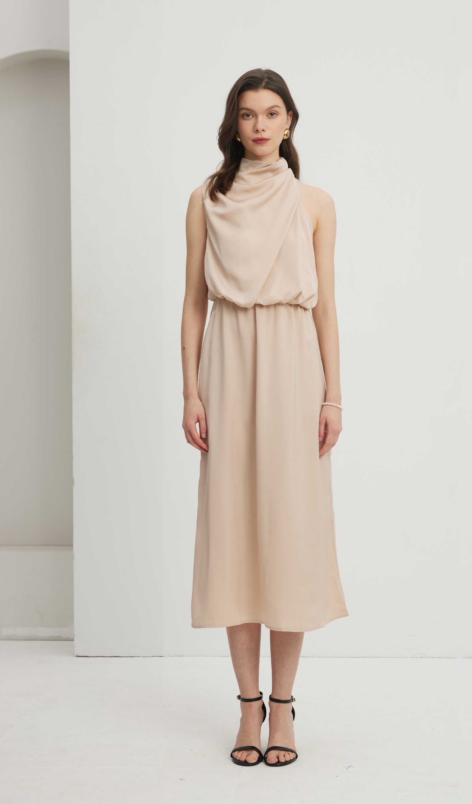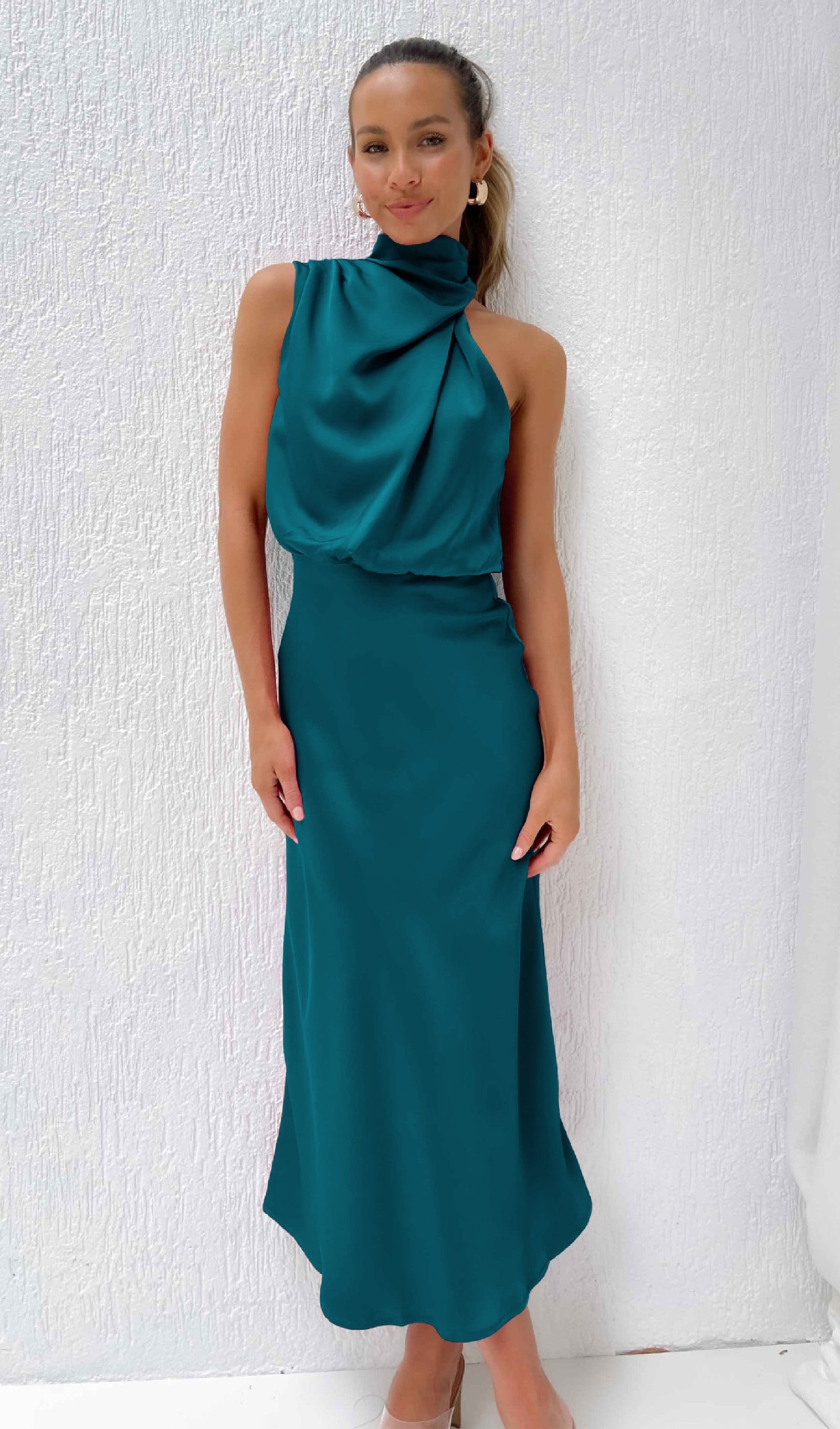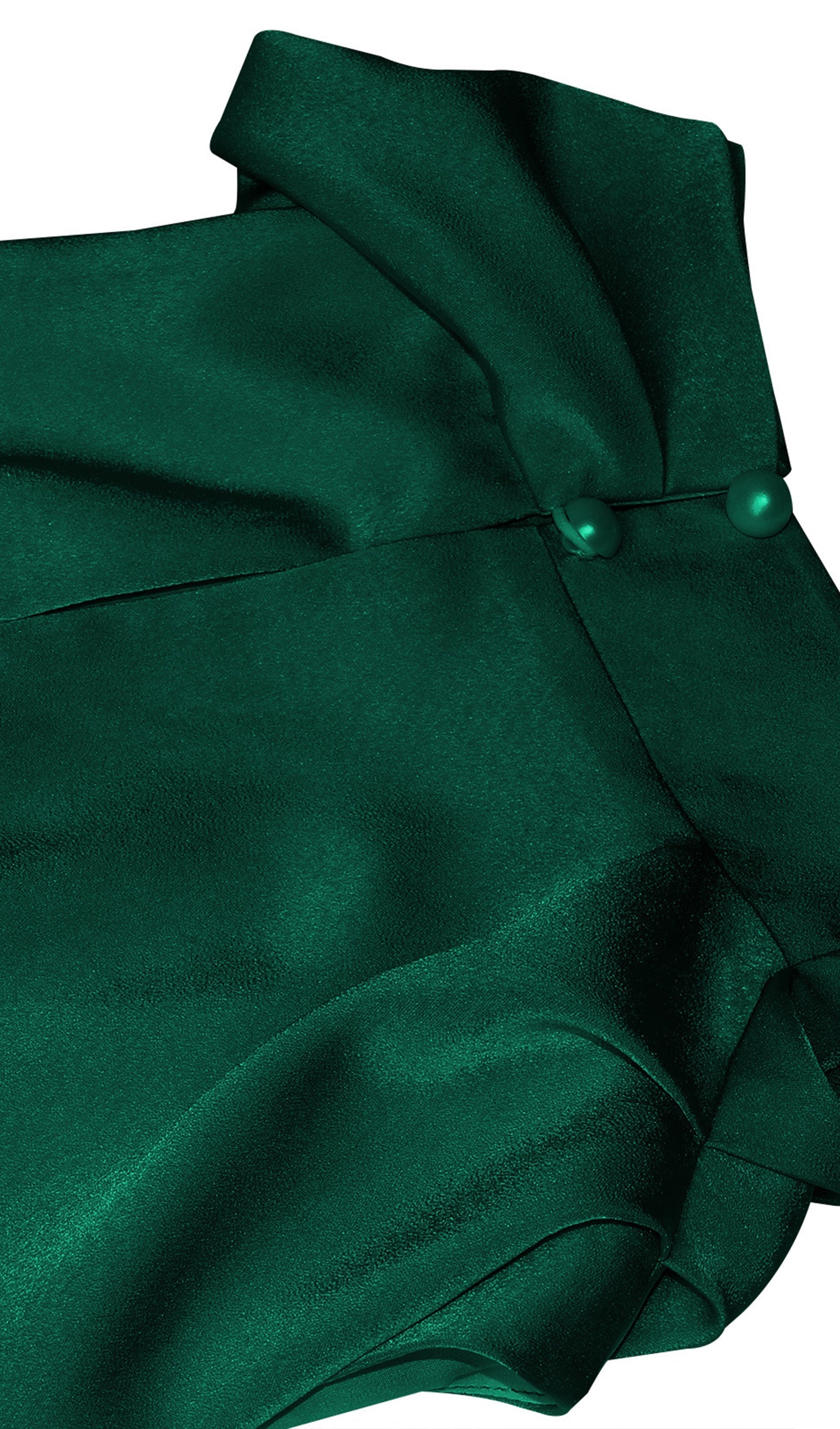 Bedeni boyunca uzanan asimetrik detaylarla sinirli bir hava kazanan bu saten kokteyl elbisesiyle en çekici halinizi hissedin.
