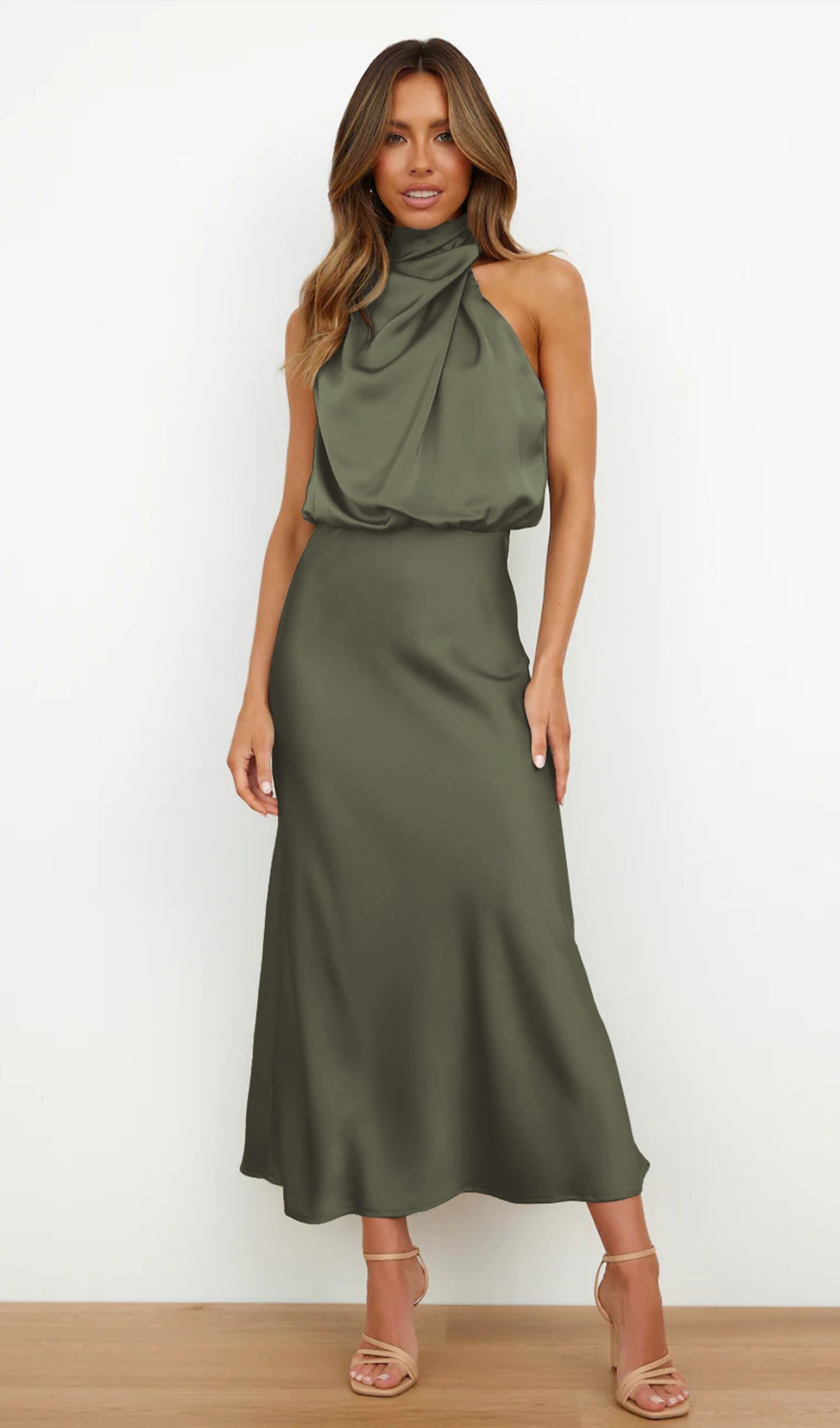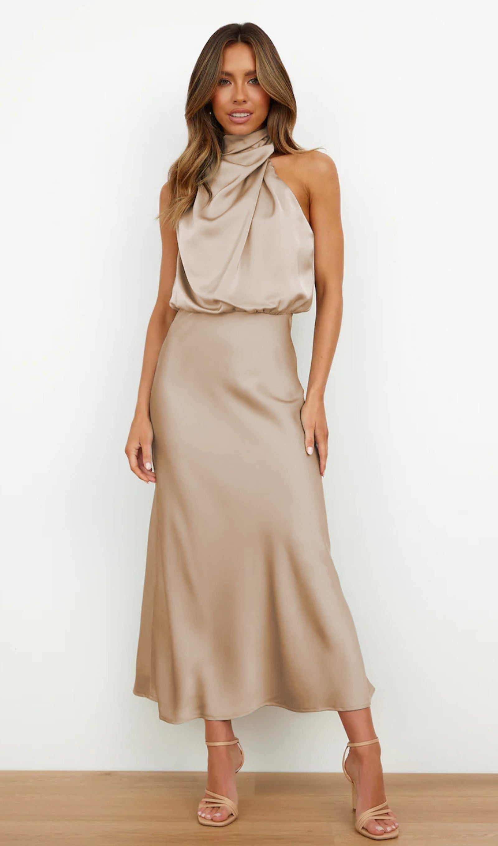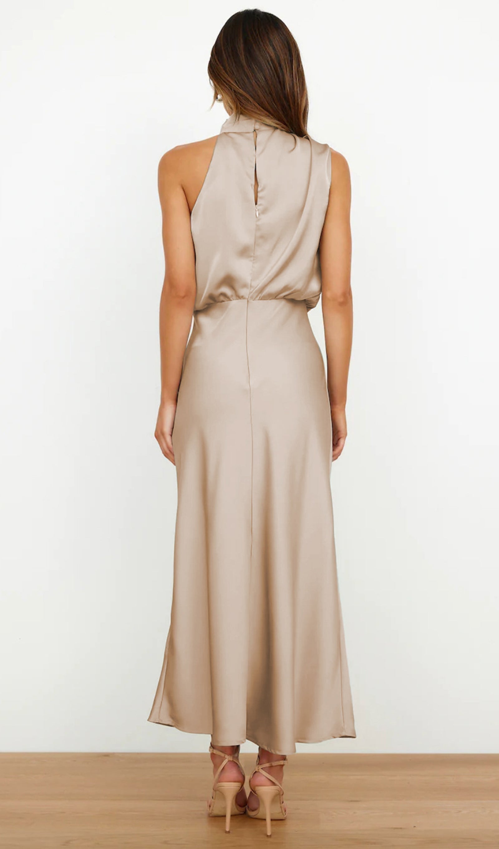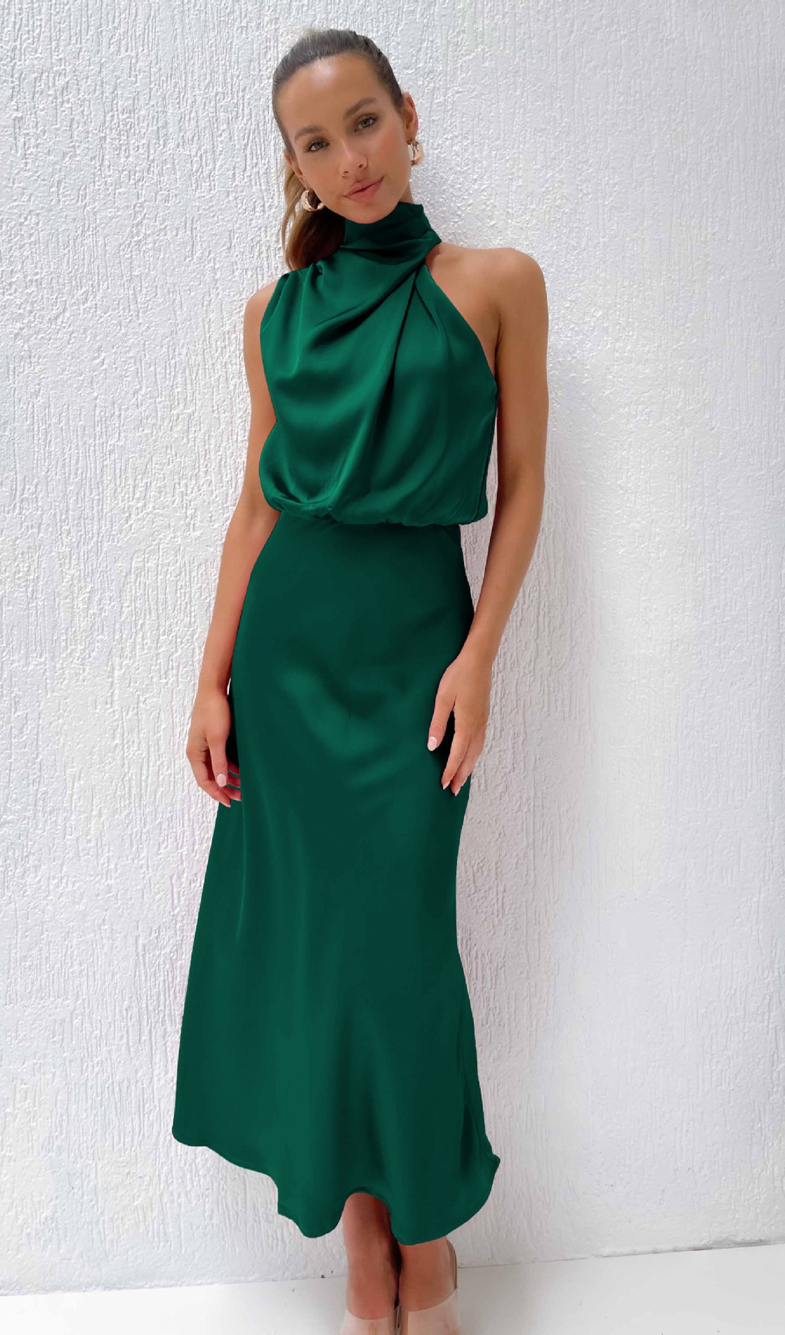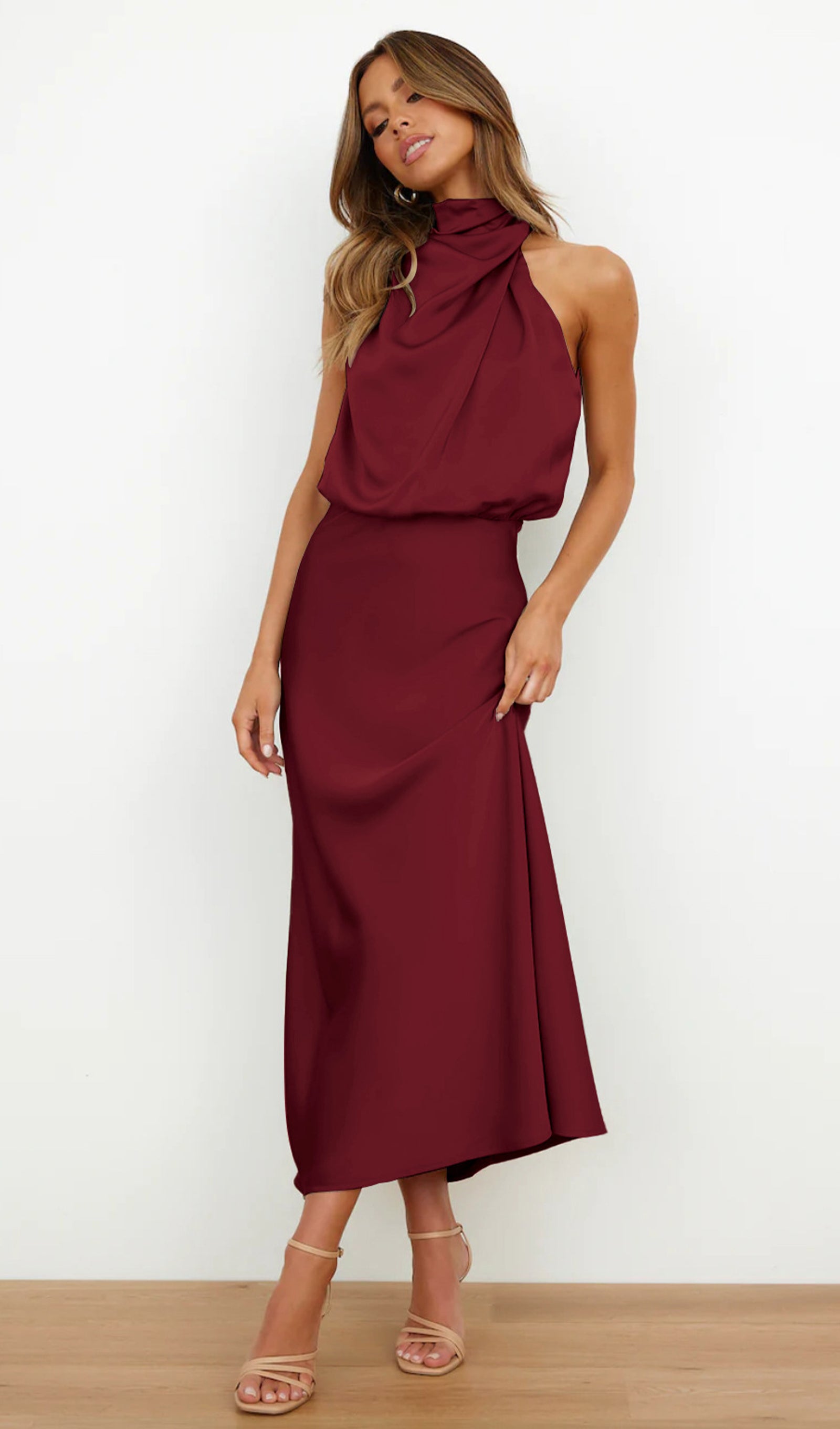 Bedeni boyunca uzanan asimetrik detaylarla sinirli bir hava kazanan bu saten kokteyl elbisesiyle en çekici halinizi hissedin.