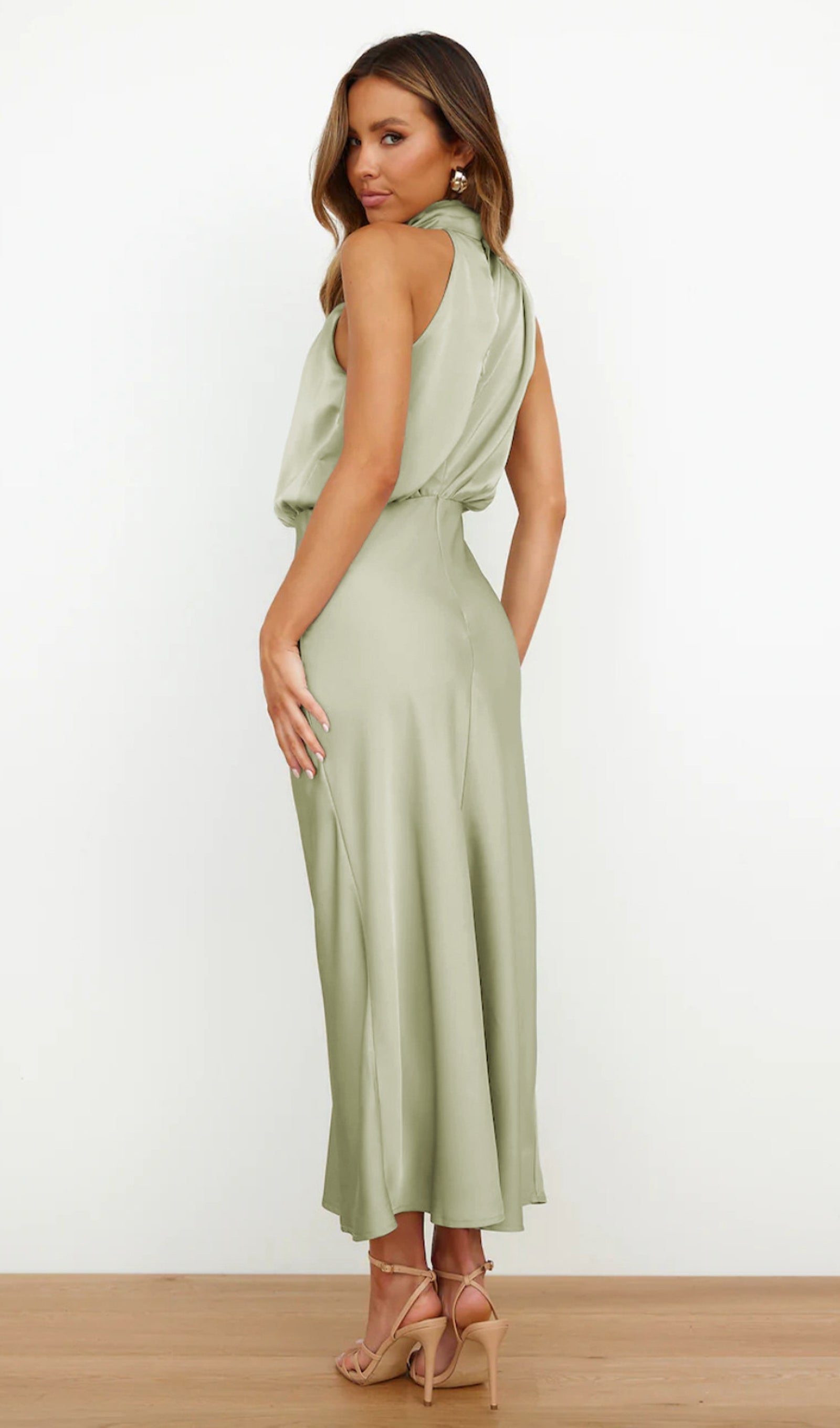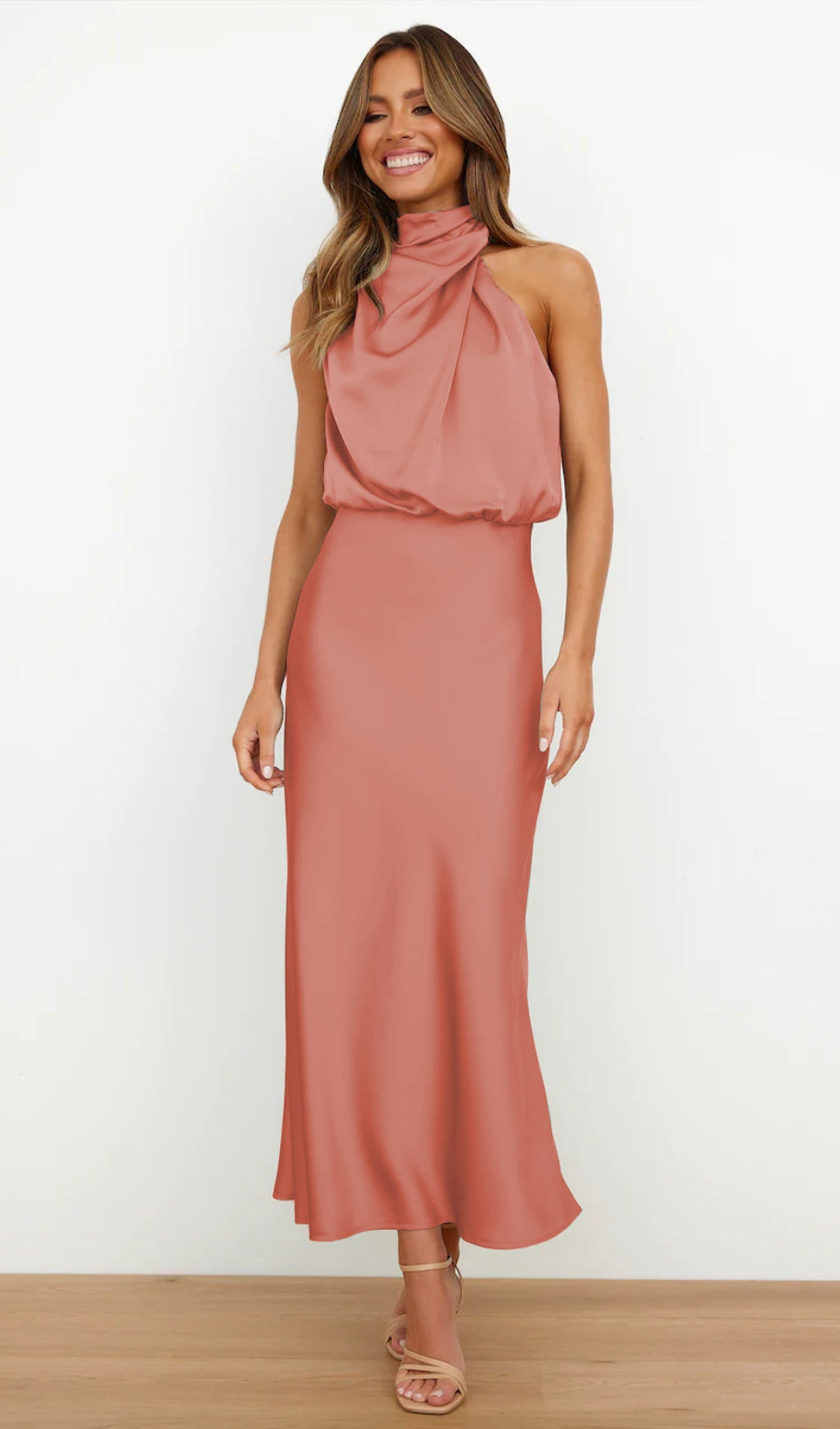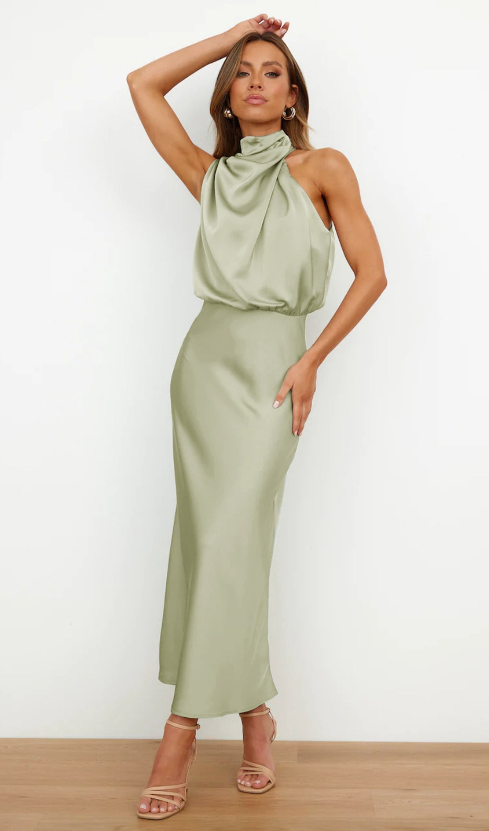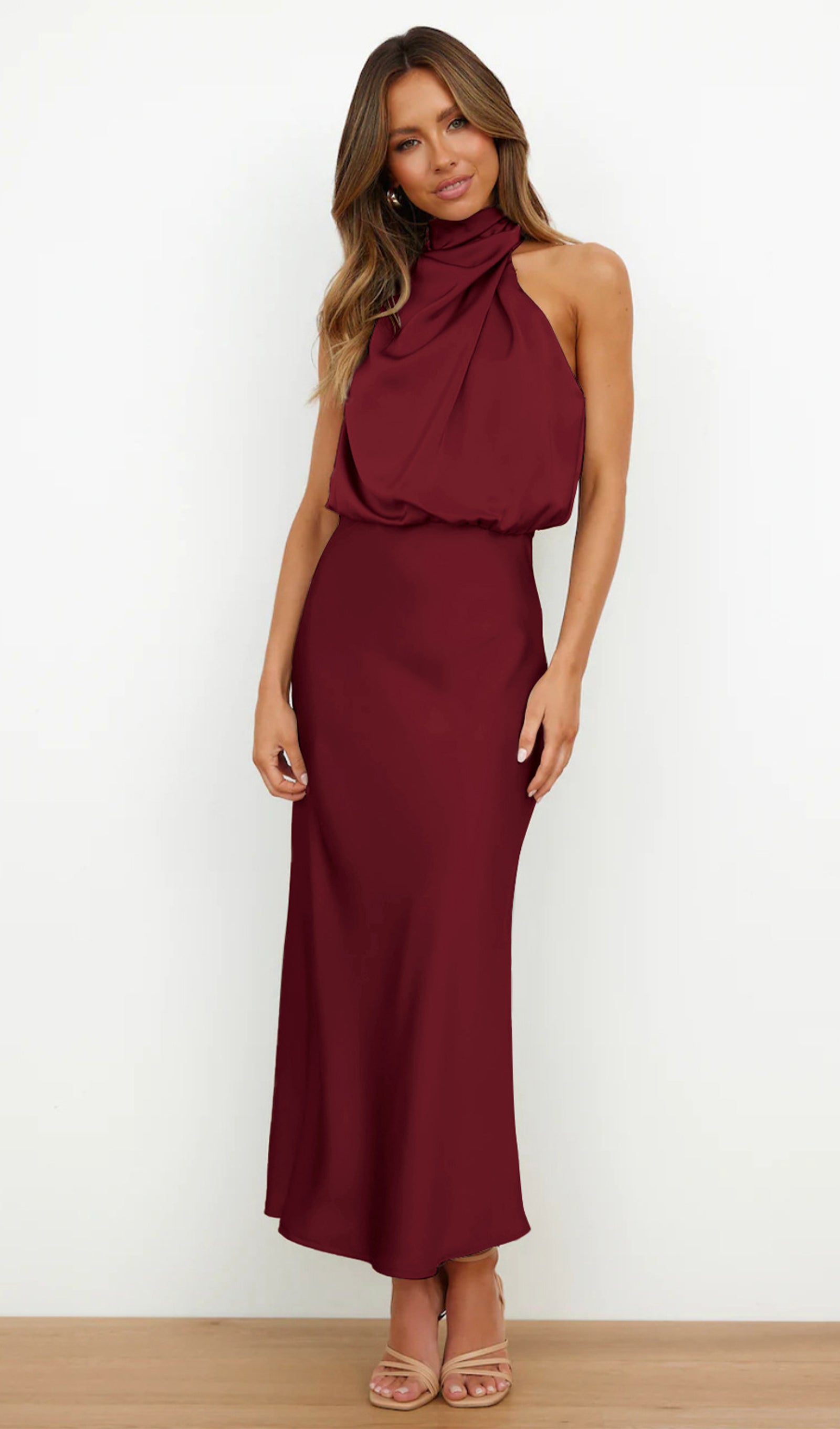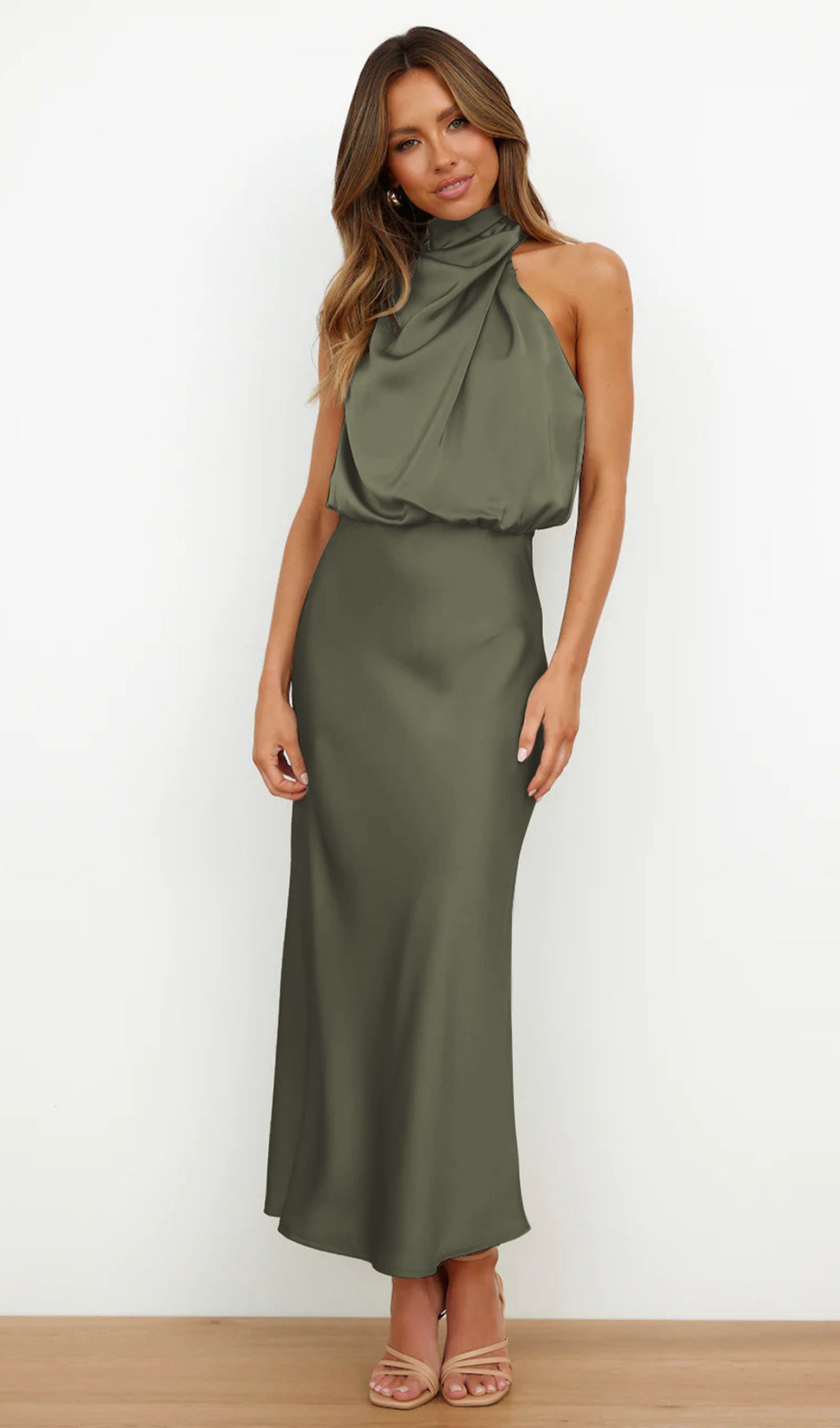 Bedeni boyunca uzanan asimetrik detaylarla sinirli bir hava kazanan bu saten kokteyl elbisesiyle en çekici halinizi hissedin.