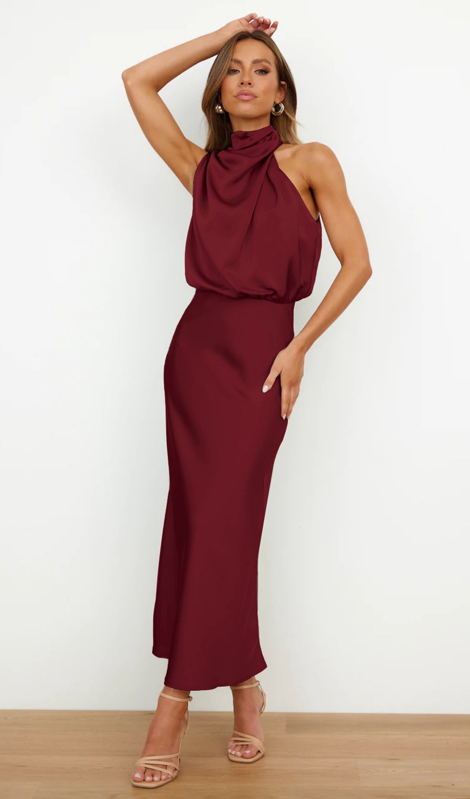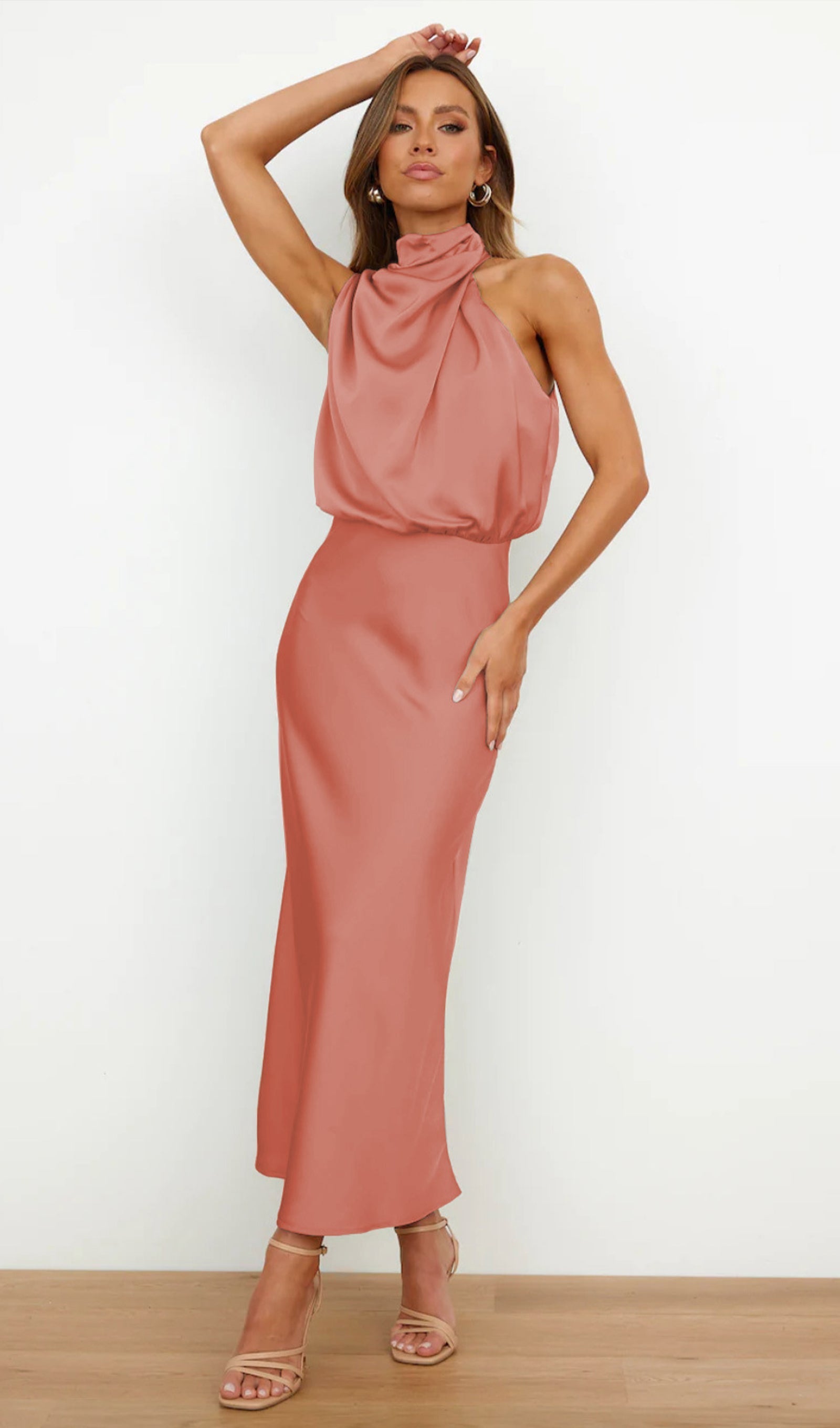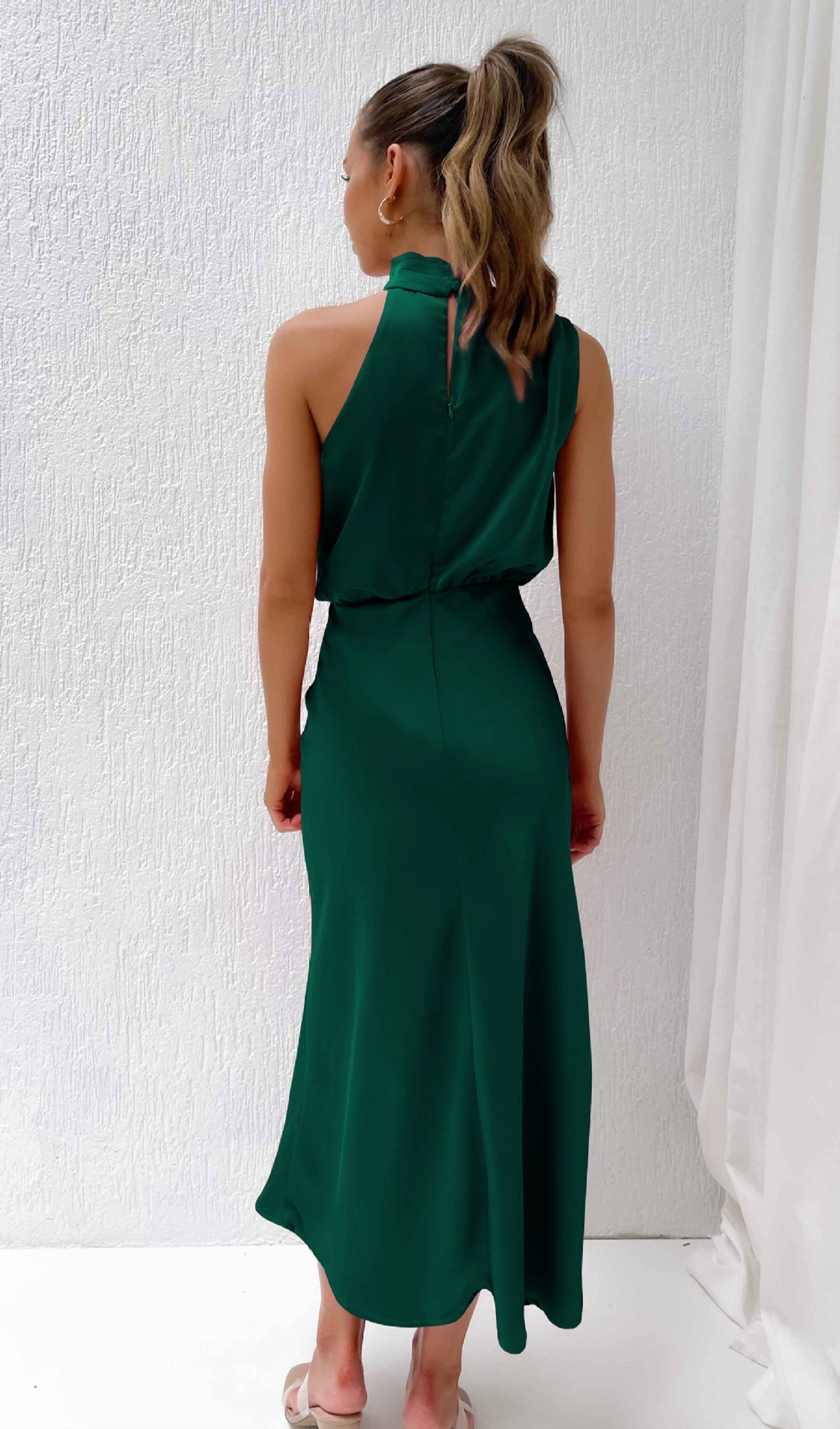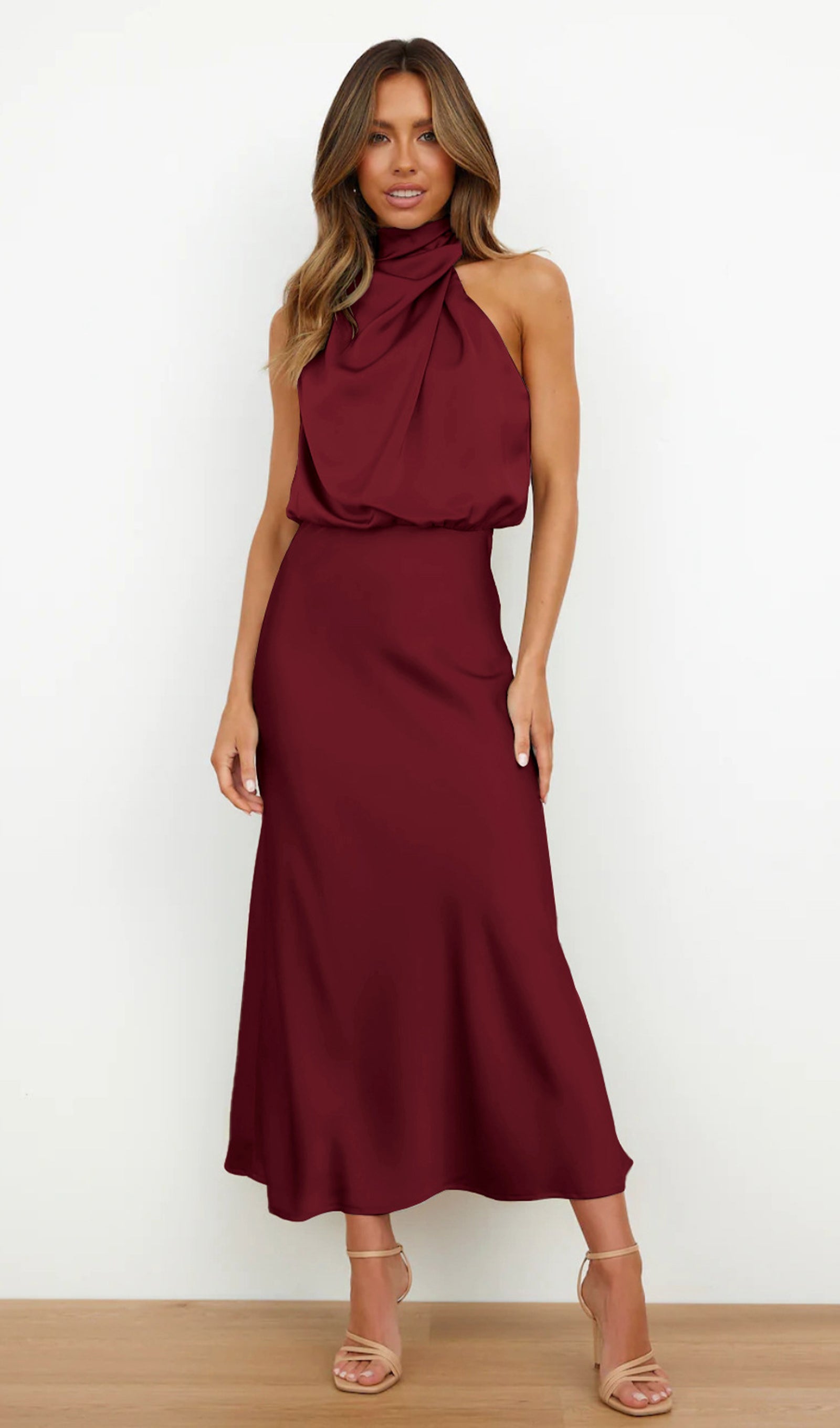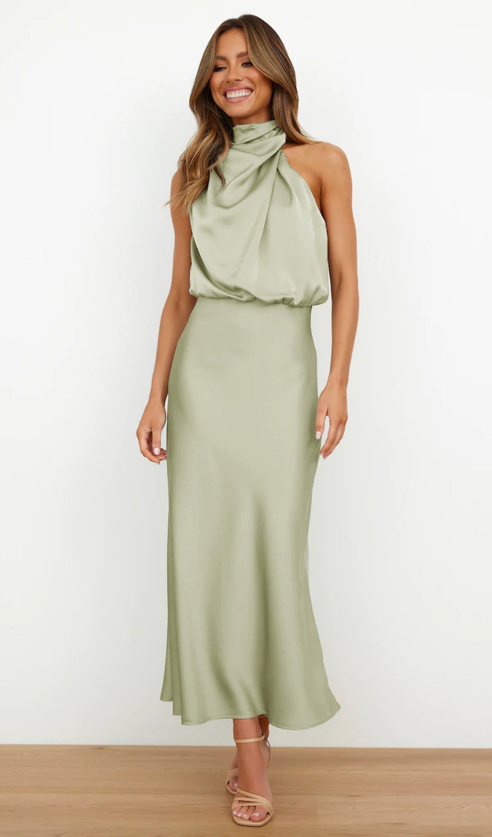 Bedeni boyunca uzanan asimetrik detaylarla sinirli bir hava kazanan bu saten kokteyl elbisesiyle en çekici halinizi hissedin.
