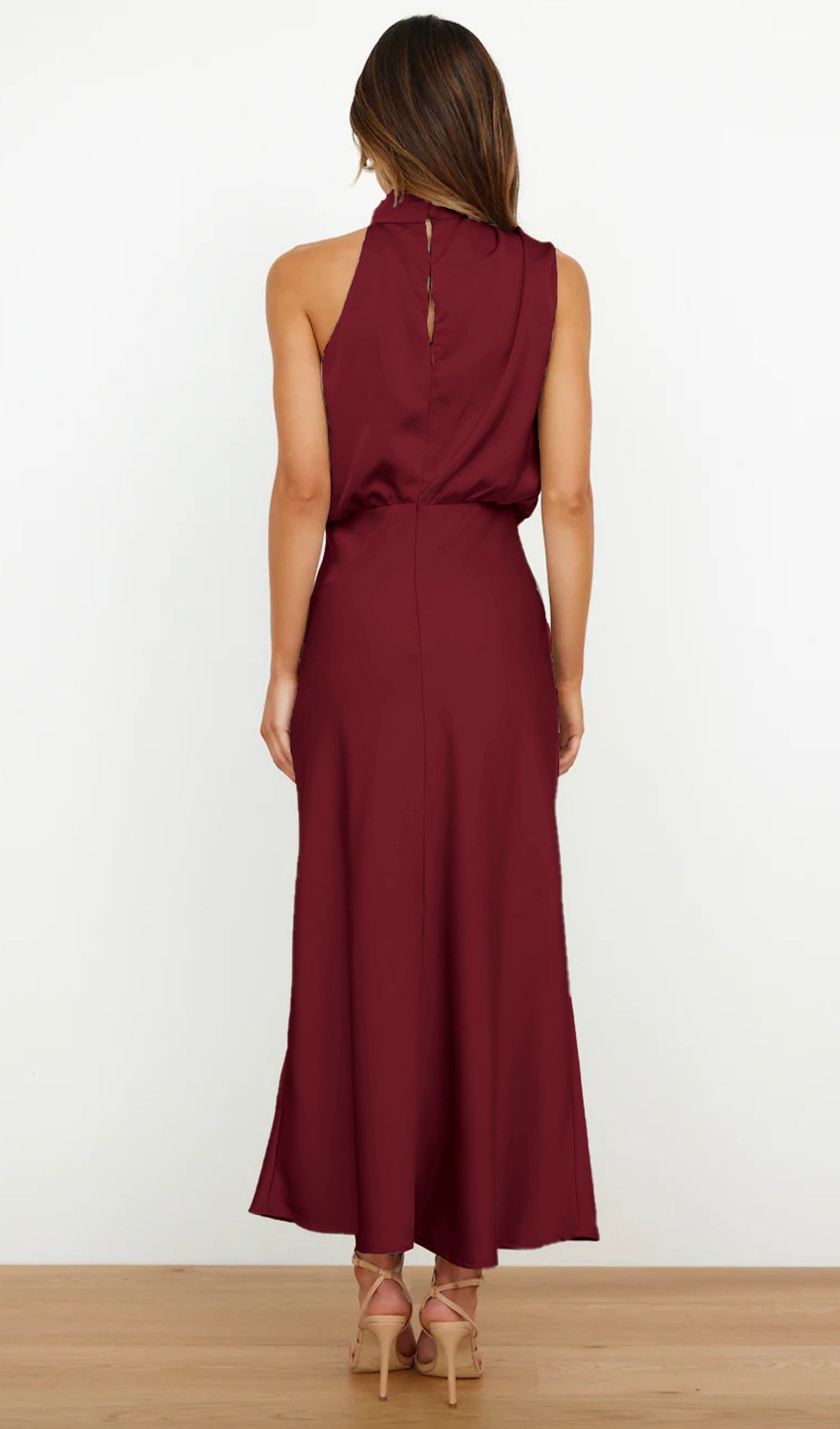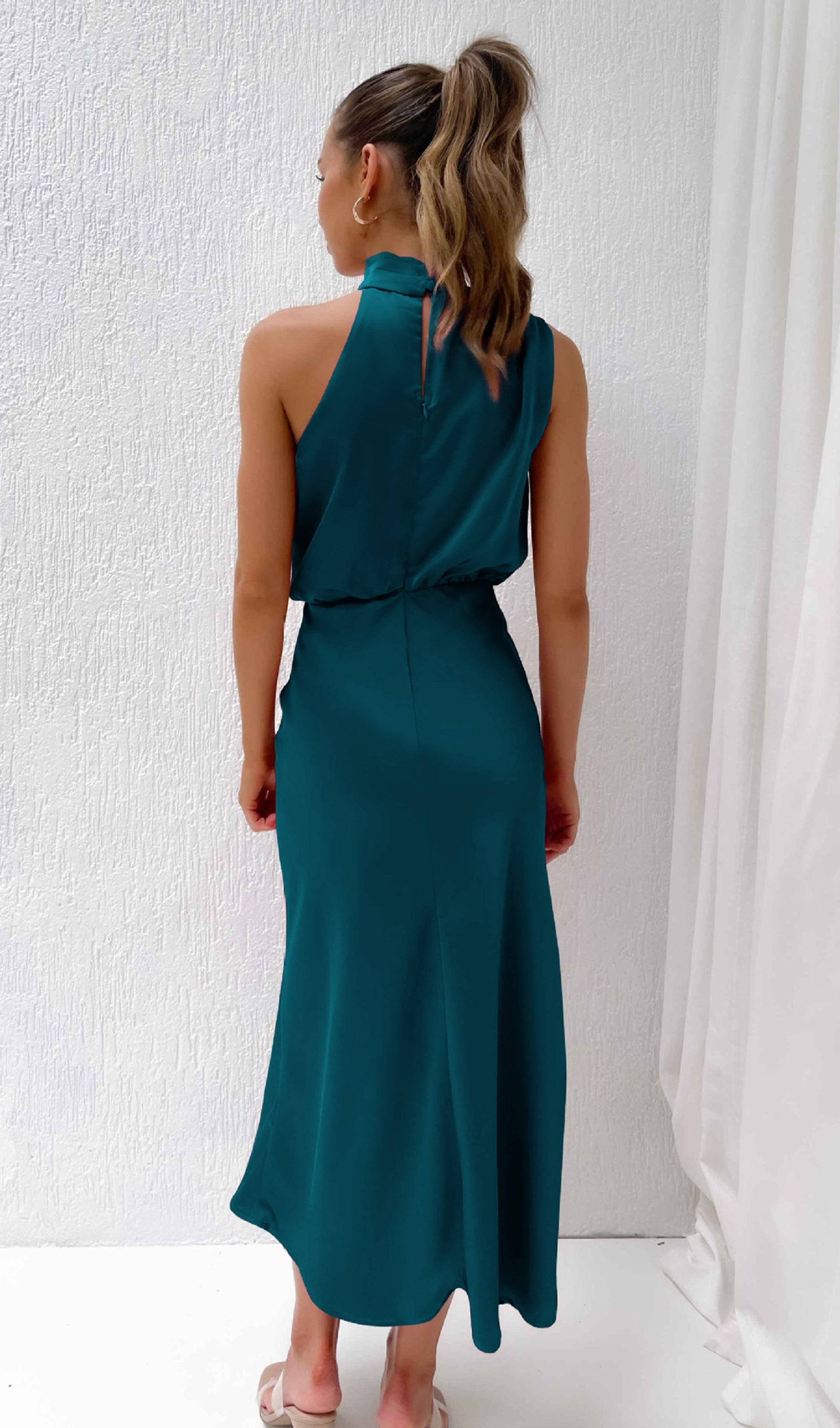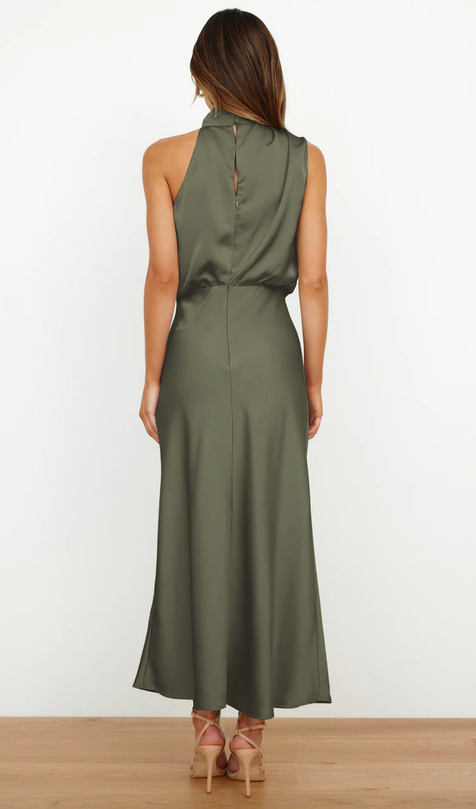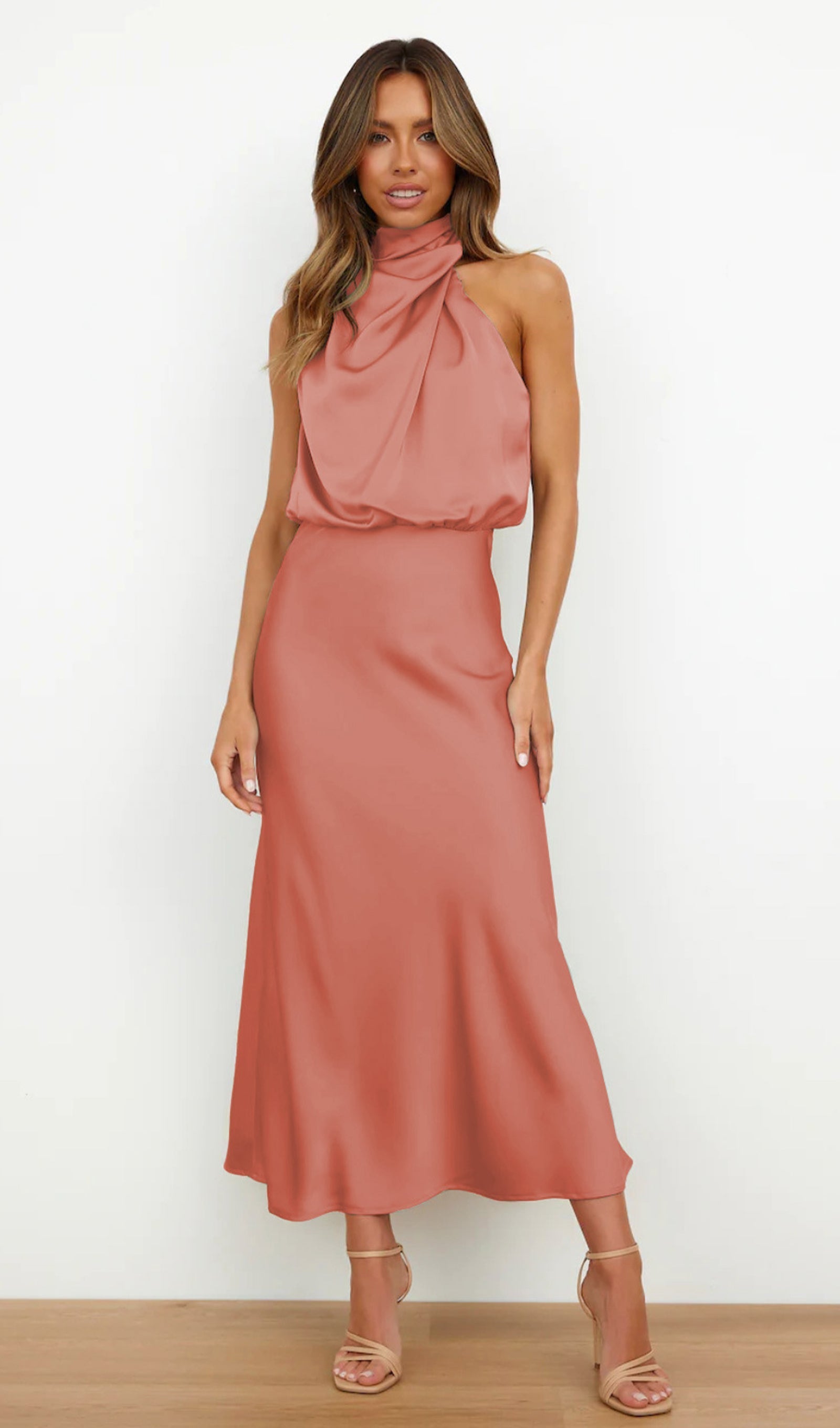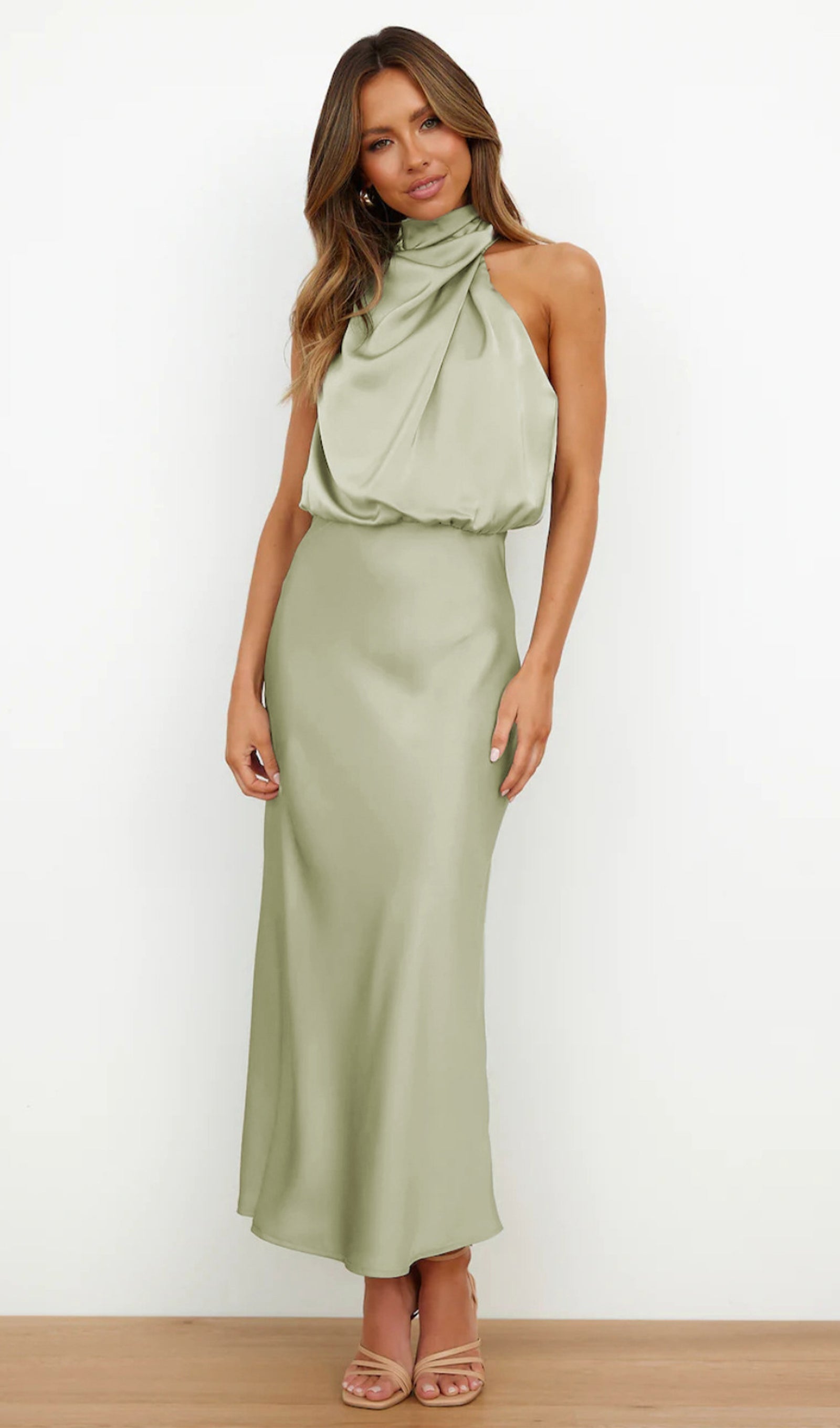 Bedeni boyunca uzanan asimetrik detaylarla sinirli bir hava kazanan bu saten kokteyl elbisesiyle en çekici halinizi hissedin.