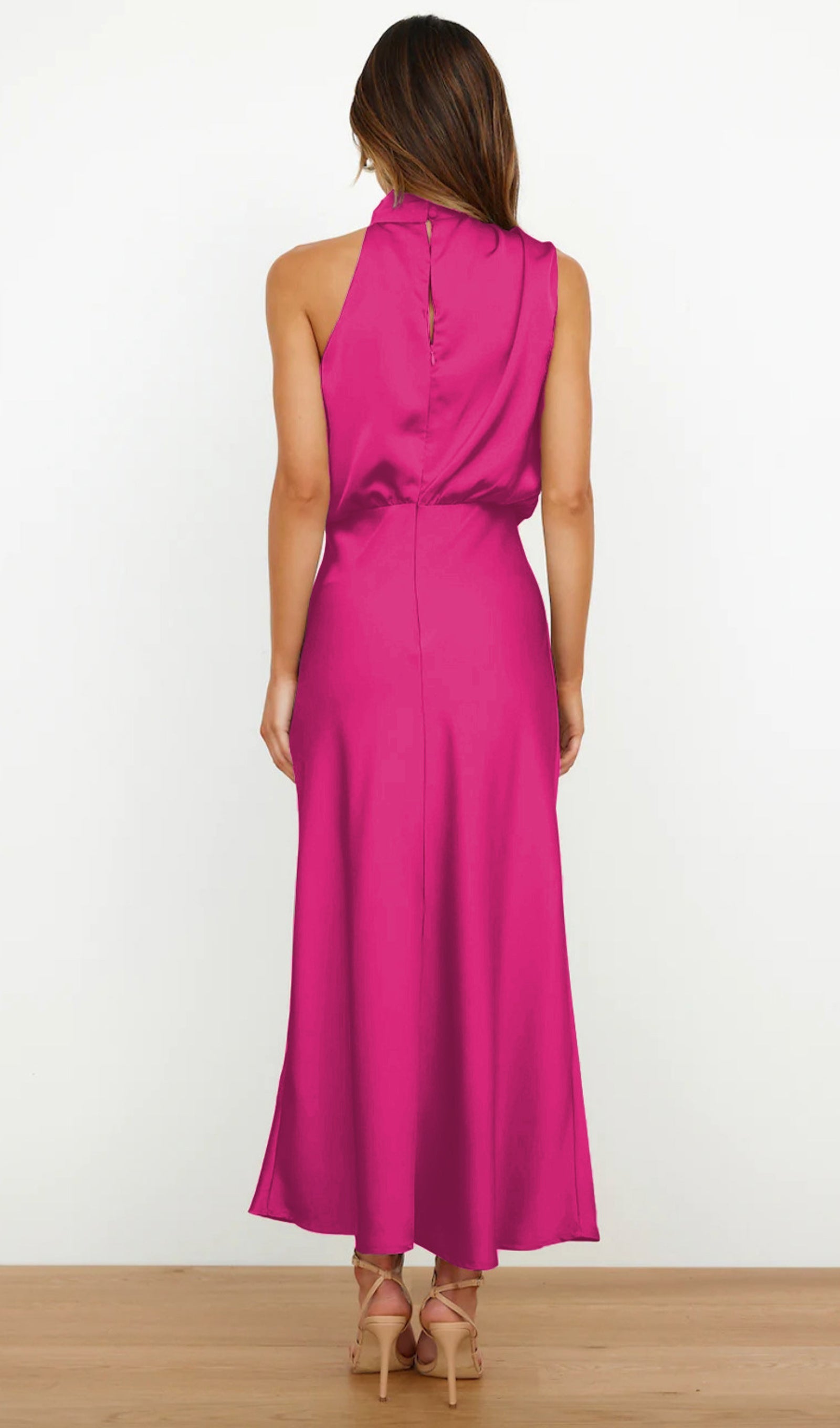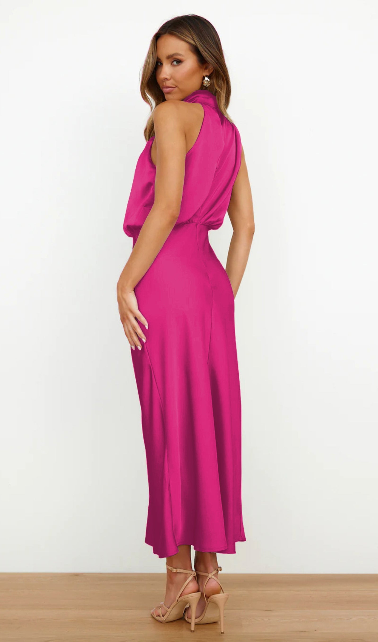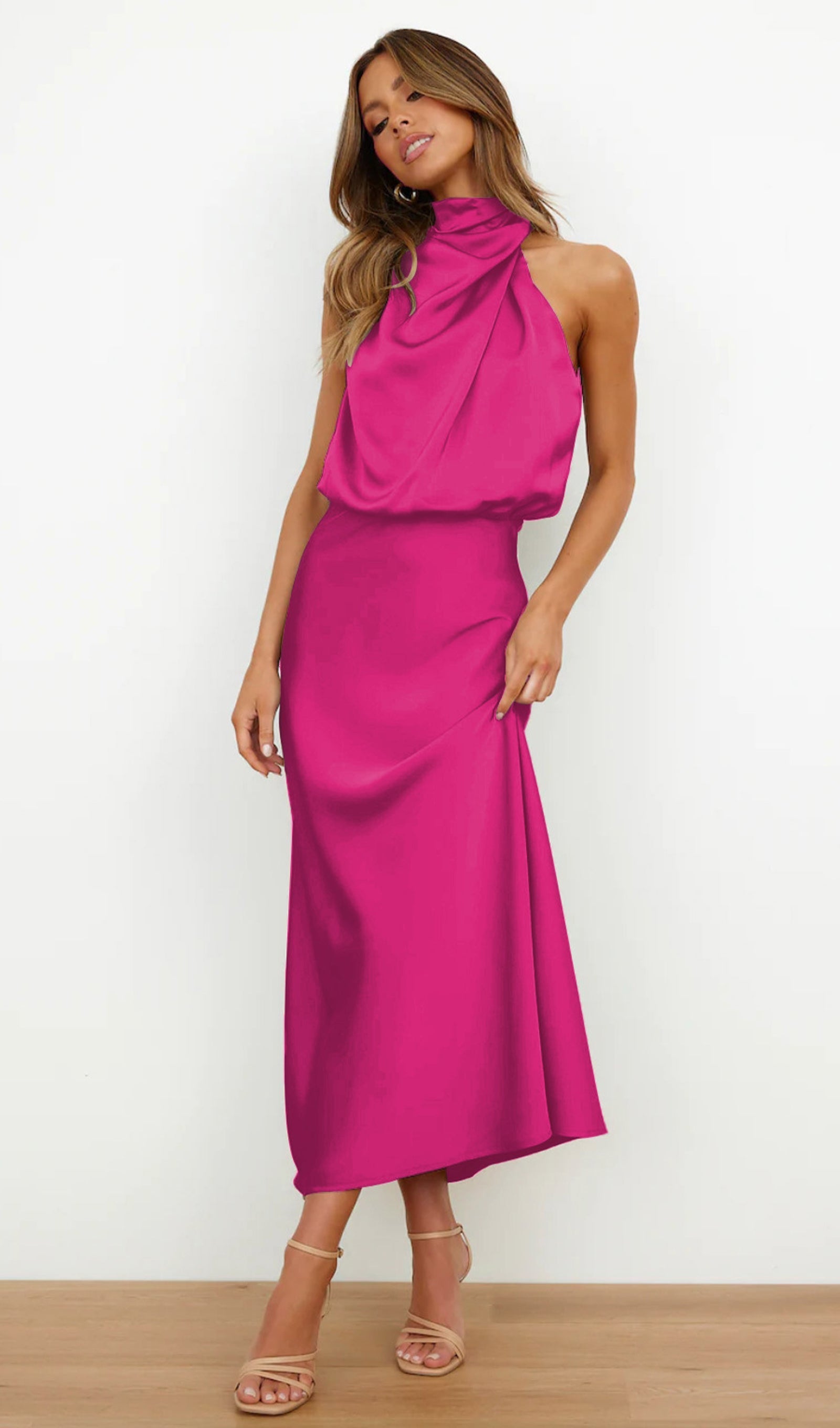 Asimetrik Saten Midi Elbise Gül Kırmızısı