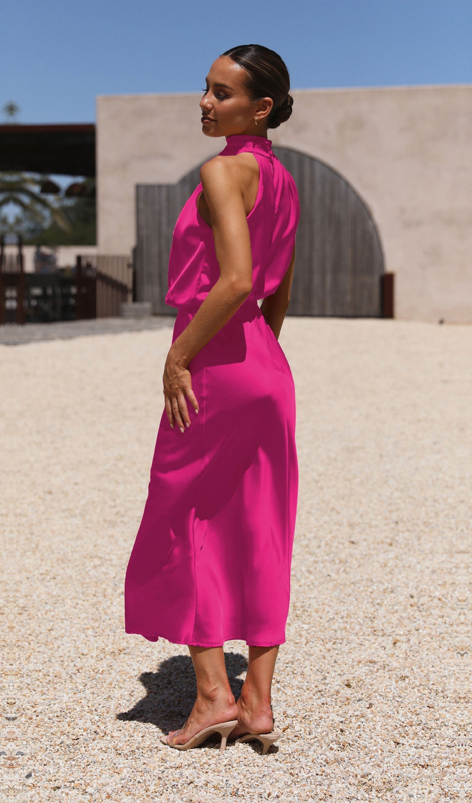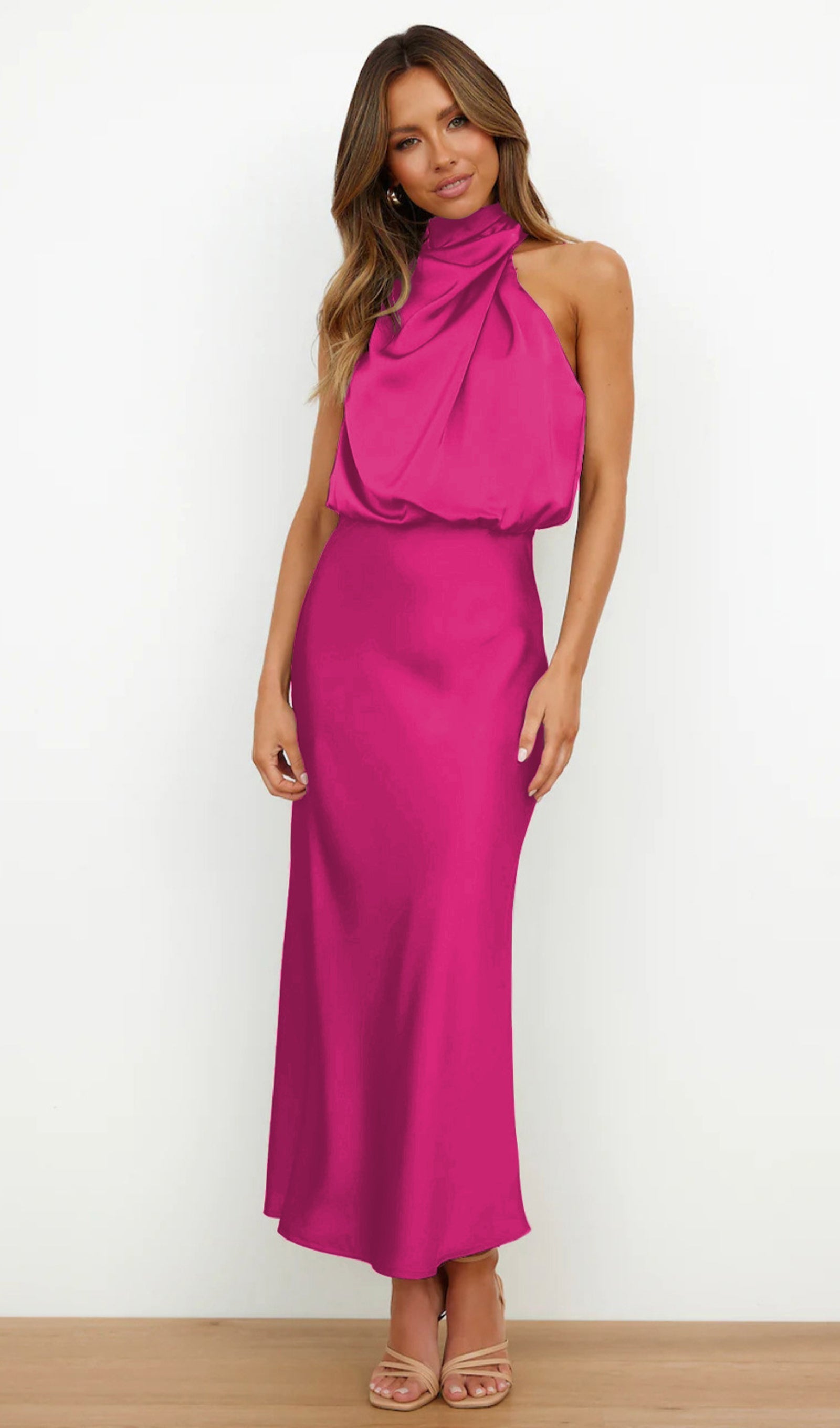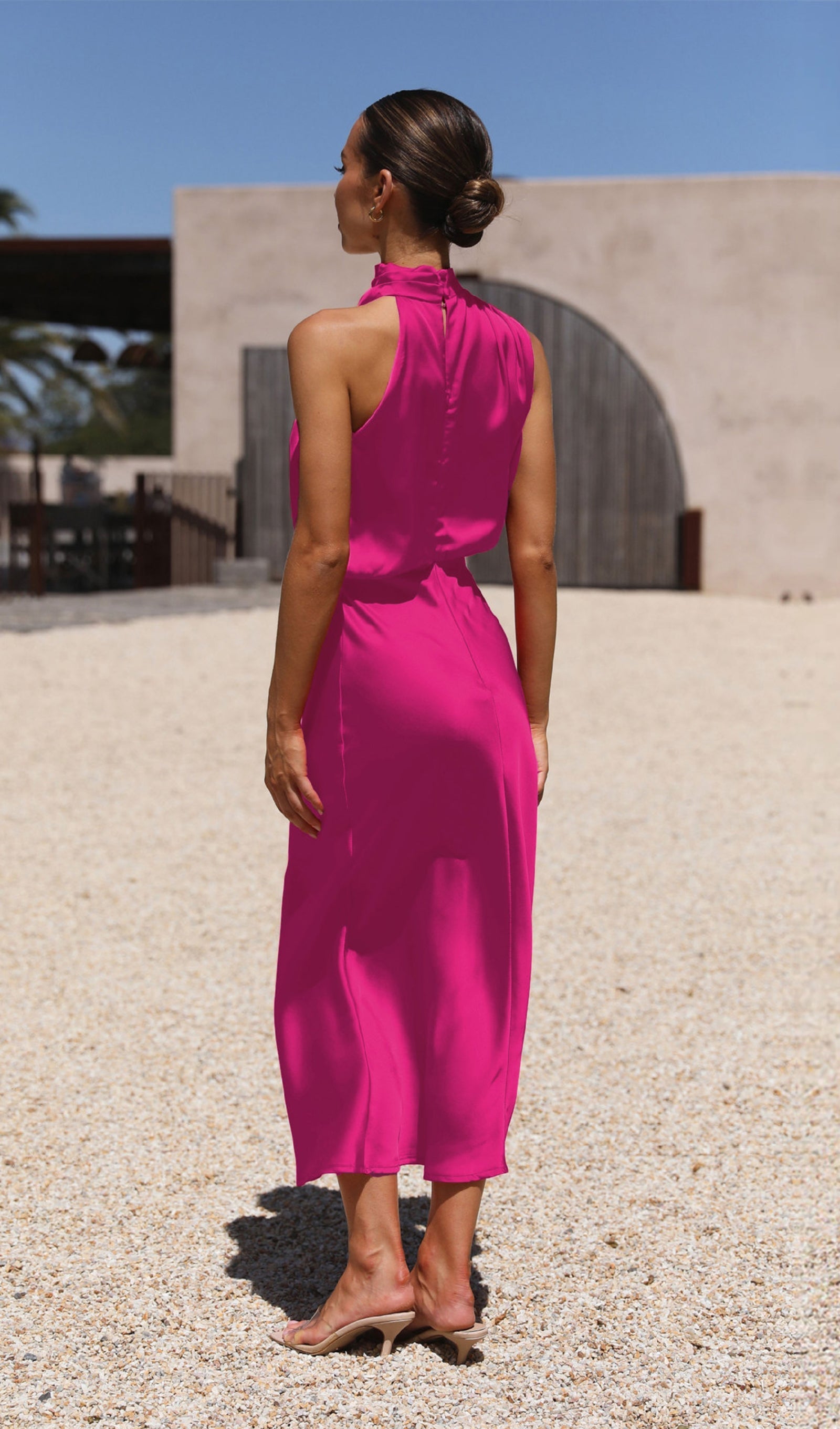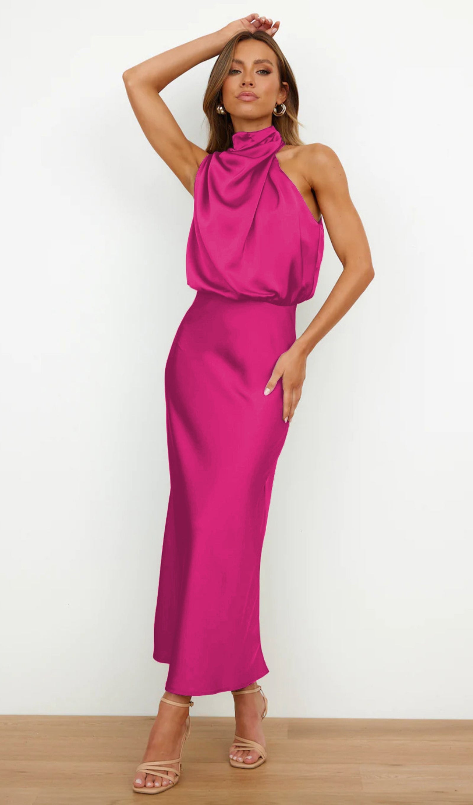Asimetrik Saten Midi Elbise Gül Kırmızısı