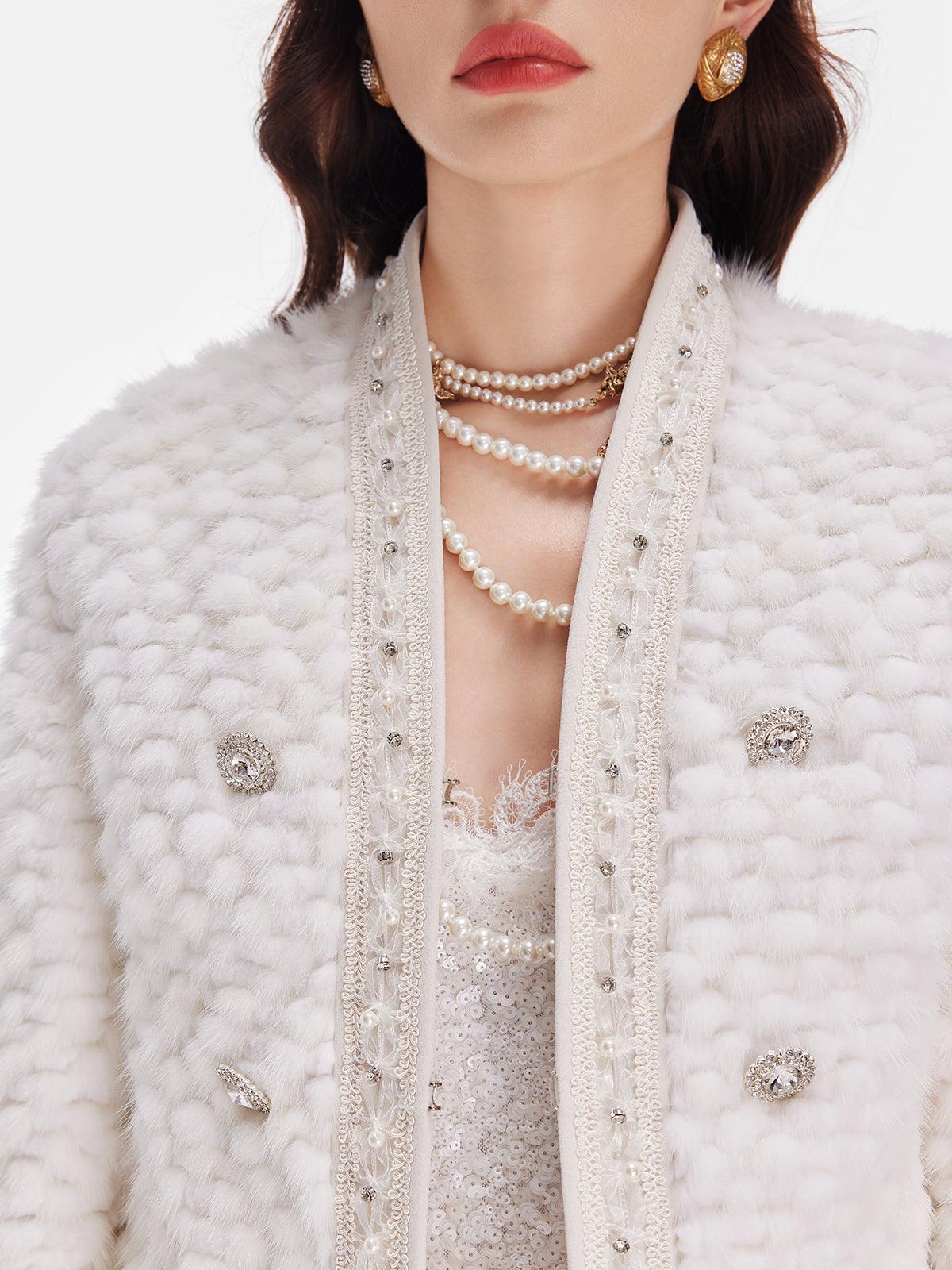 Lüks tasarımıyla öne çıkan bu beyaz kısa ceket, incili detayları ve düğme süslemeleriyle zarafeti yeniden tanımlıyor. Şıklığınızı tamamlamak için özel davetlerde veya günlük kombinlerinizde tercih edebilirsiniz. Hem sıcak tutan dokusuyla hem de göz alıcı görünümüyle stilinize değer katacak!