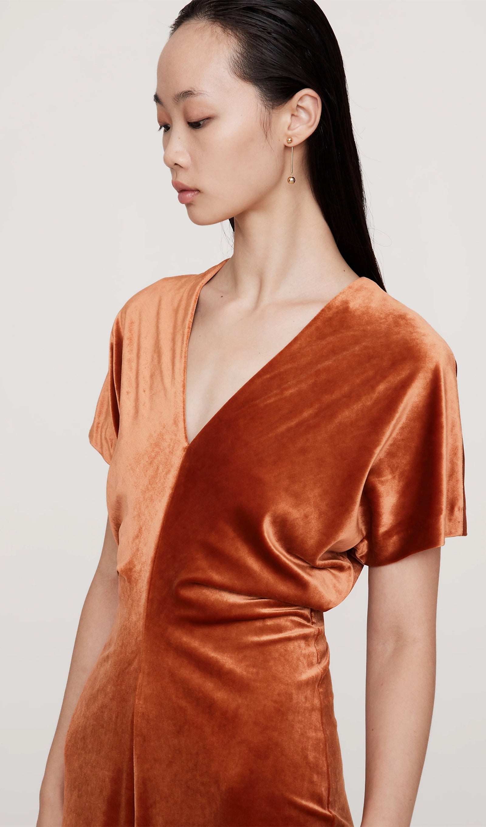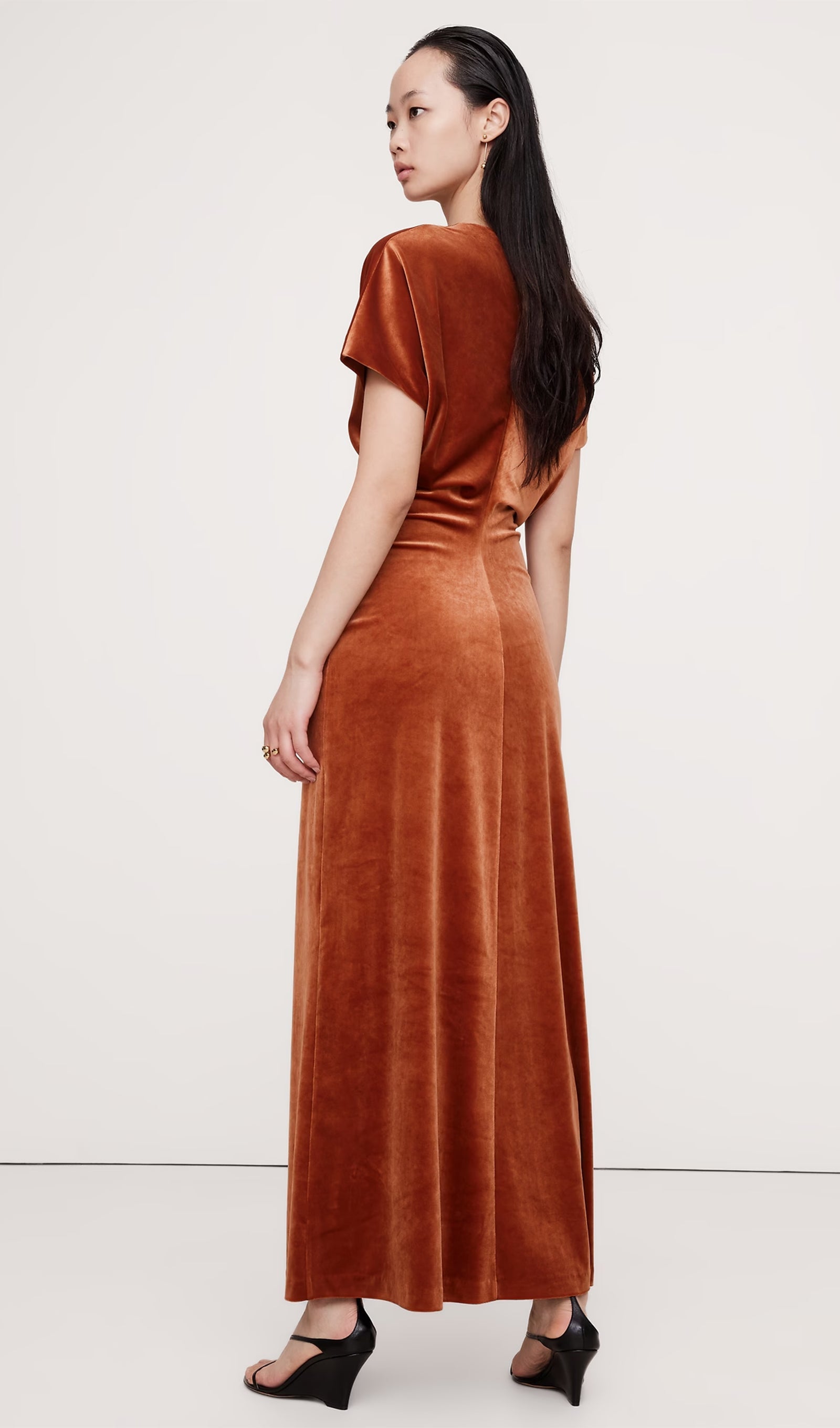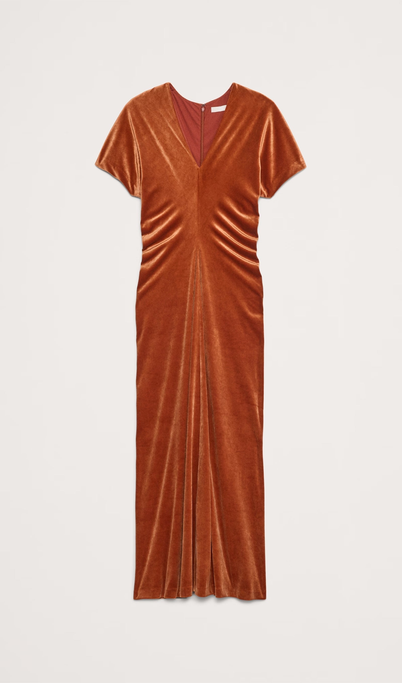 Biye Kesimli Kadife Maksi Elbise-Bakır