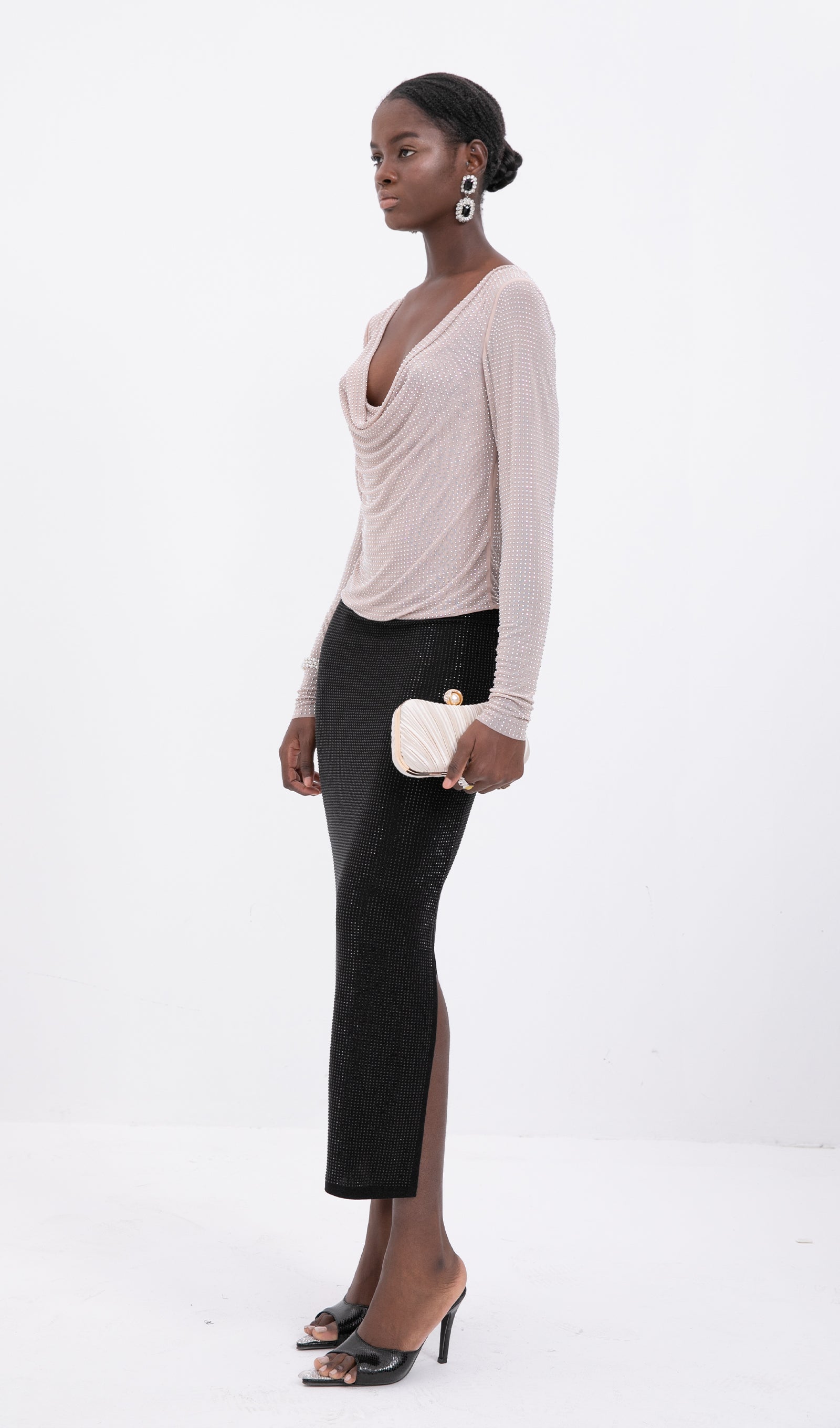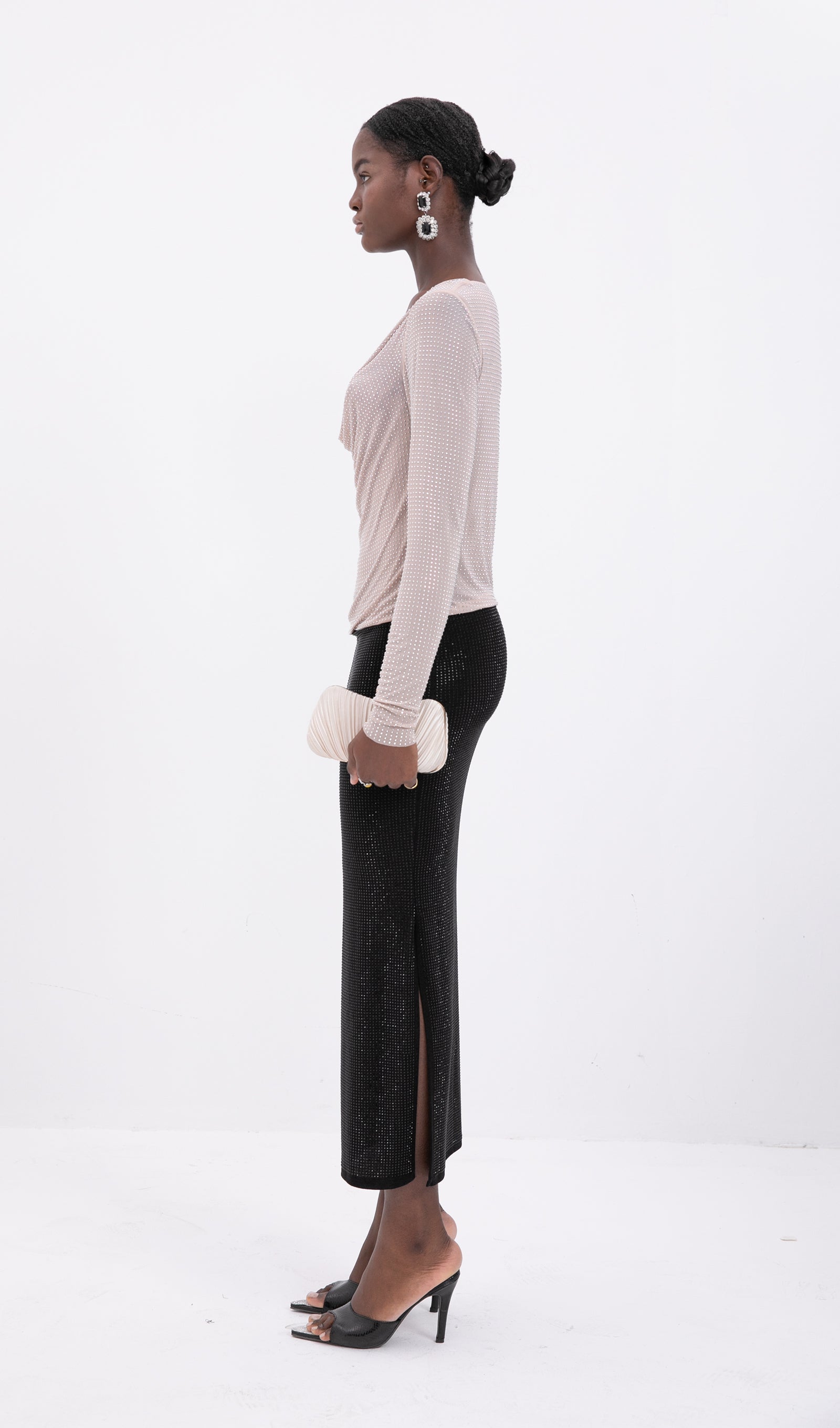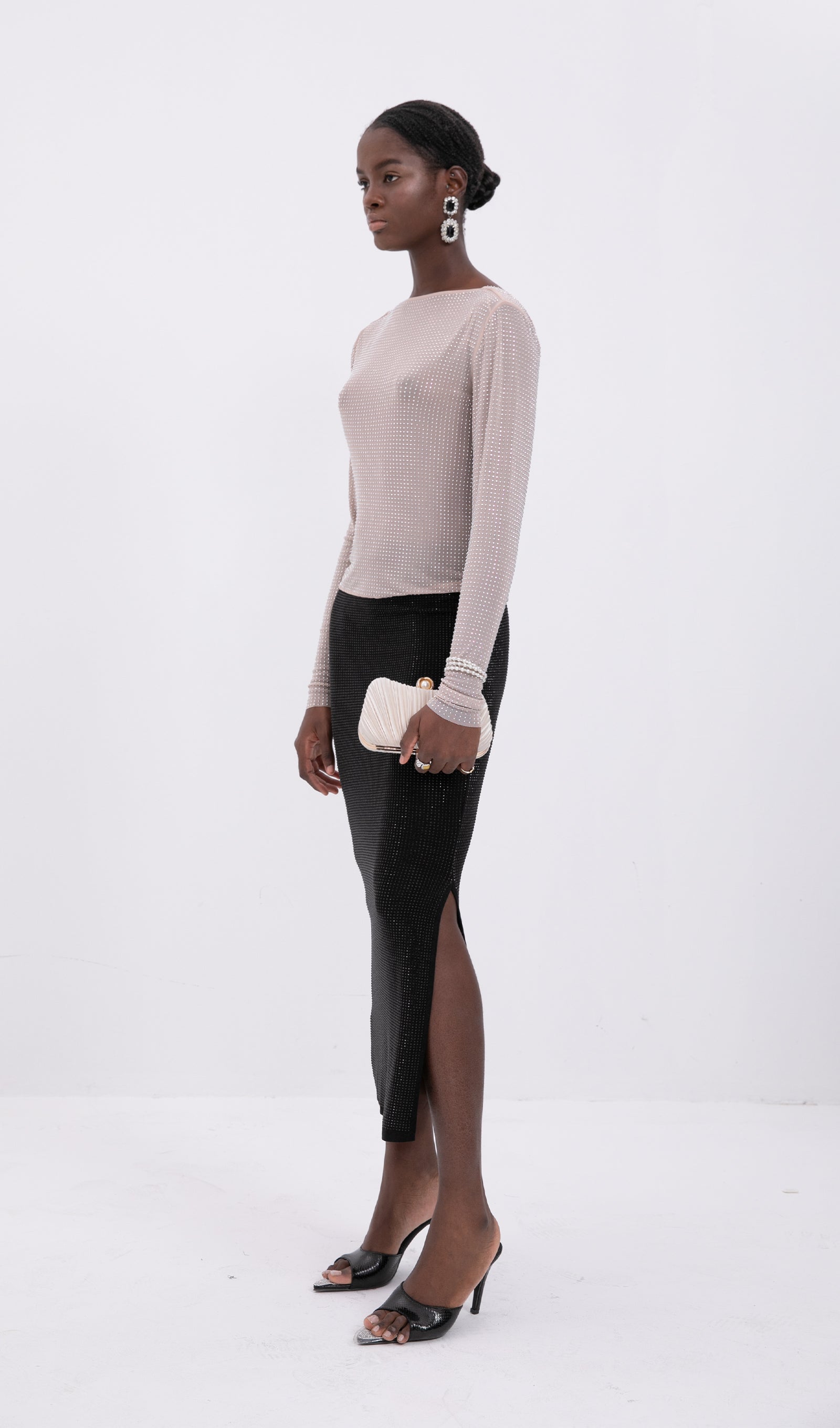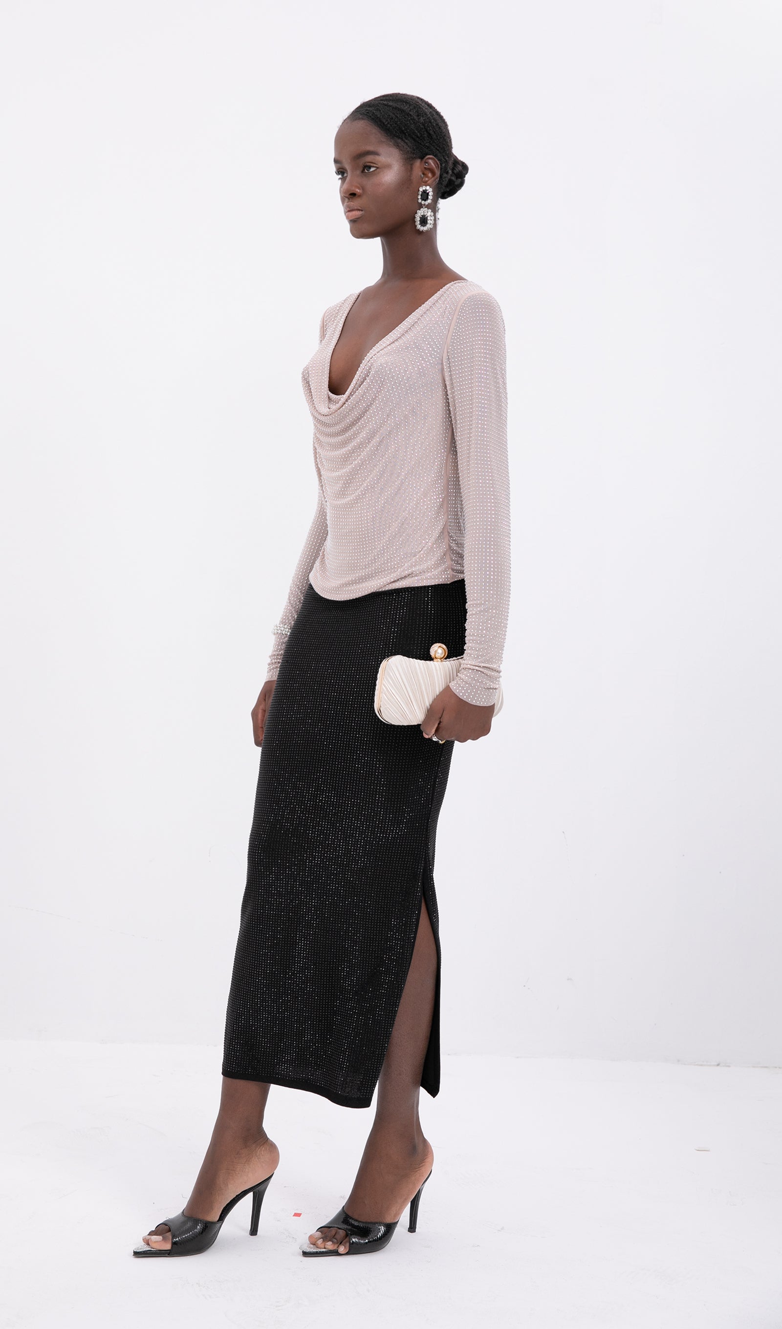 Bu gümüş tonlu boncuklu midi etek, herhangi bir özel etkinlikte bir açıklama yapmak için sofistike bir seçimdir. Şık kesimi ve baştan çıkarıcı bir dokunuş katan yan yırtmacı ile bu parça parlamak için tasarlandı. Siyah süslemesi, boncukların ışıltısıyla mükemmel bir tezat oluşturarak modern ve göz alıcı bir görünüm yaratır. Sofistike ve şık bir görünüm için sade bir üst ve yüksek topuklu ayakkabılarla eşleştirmek için mükemmeldir.