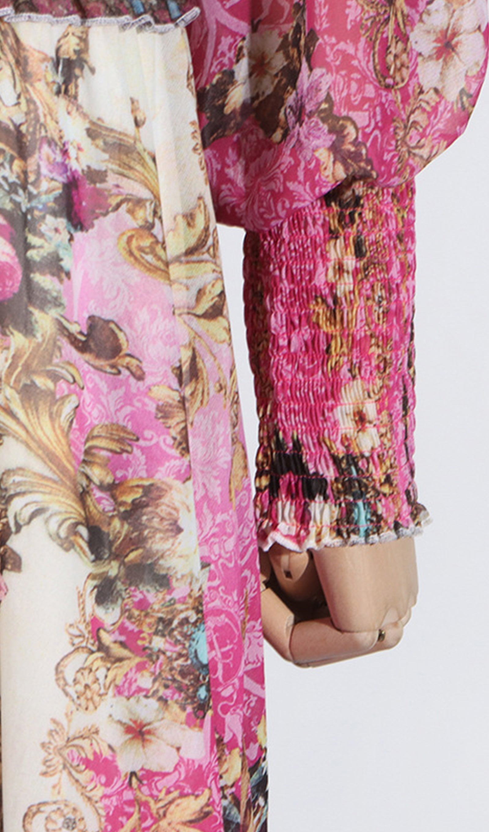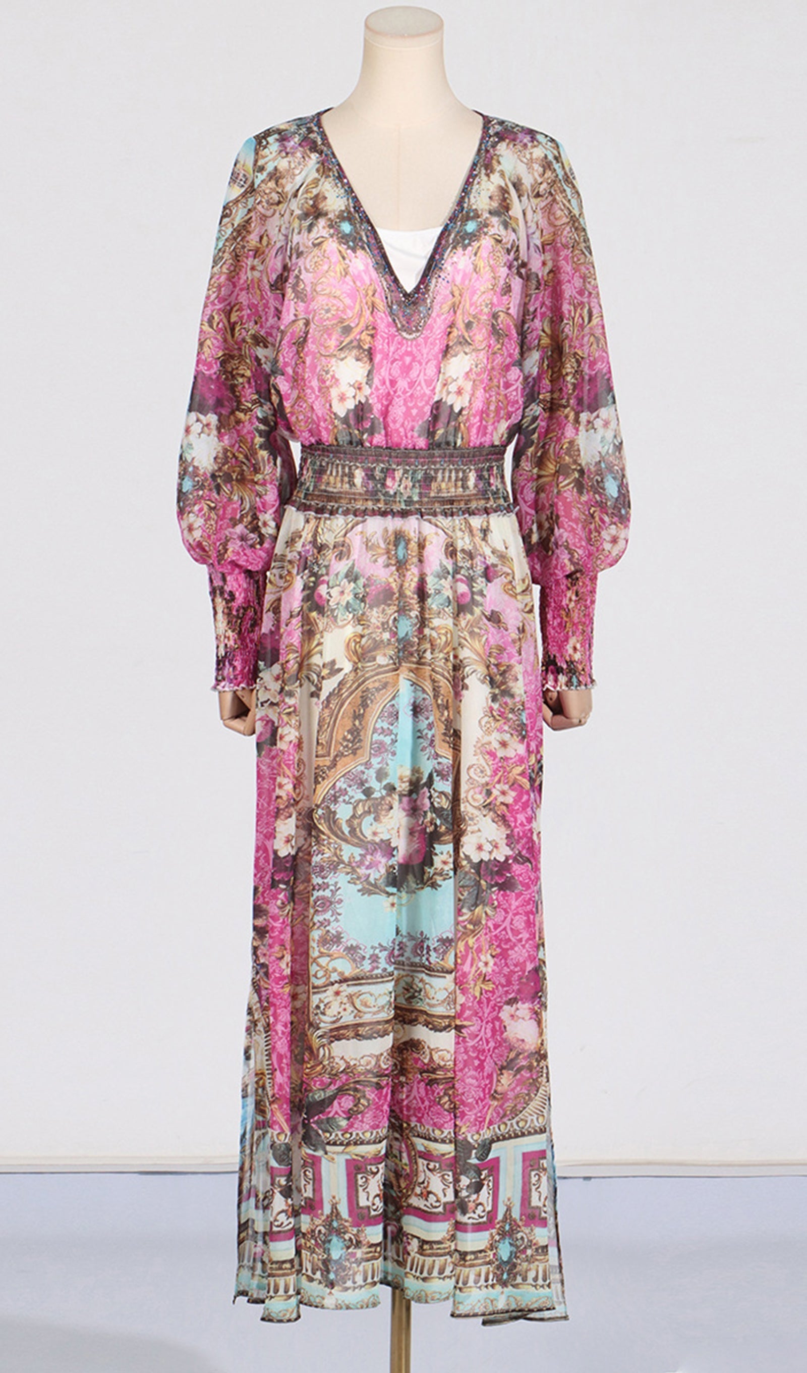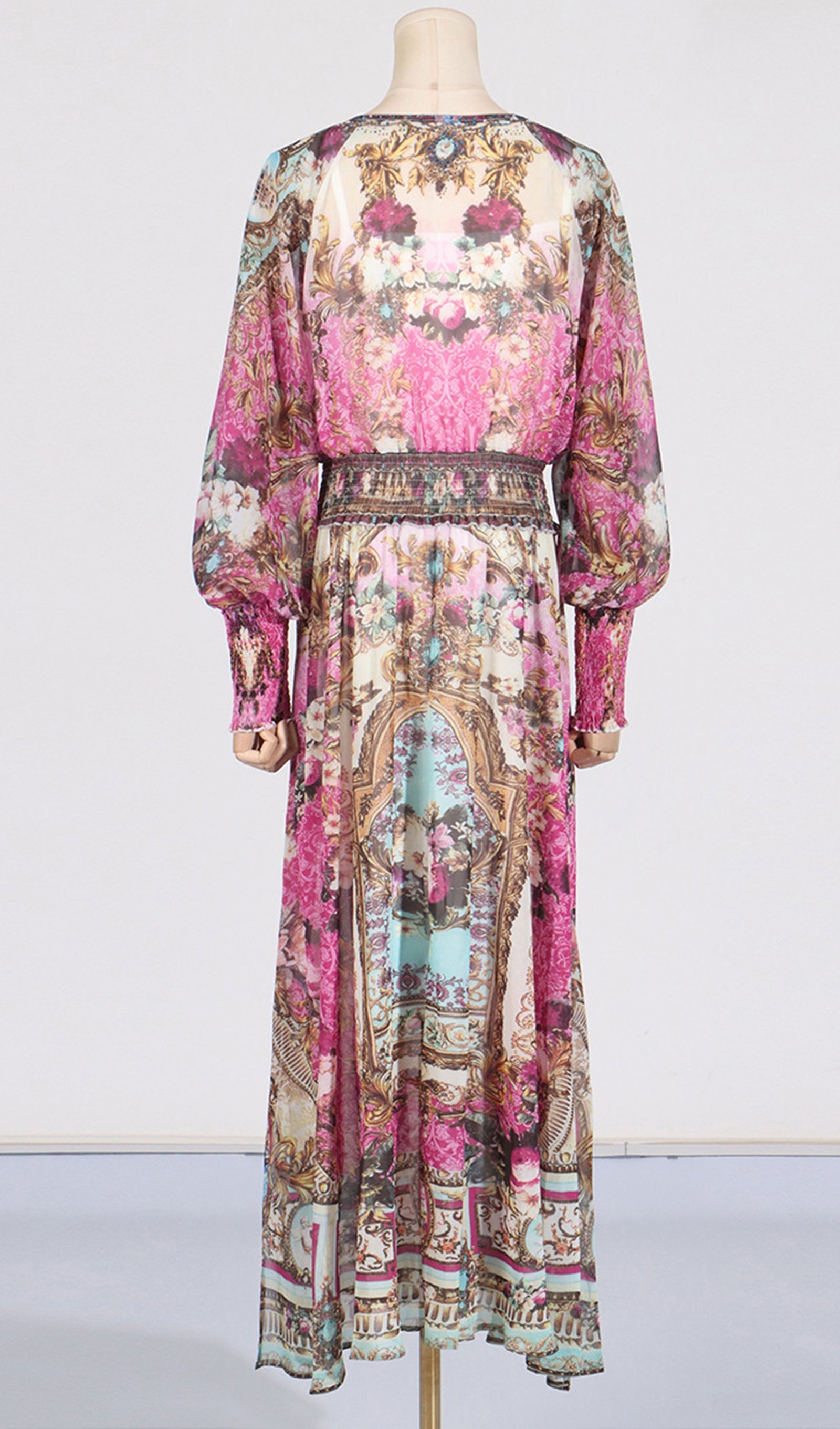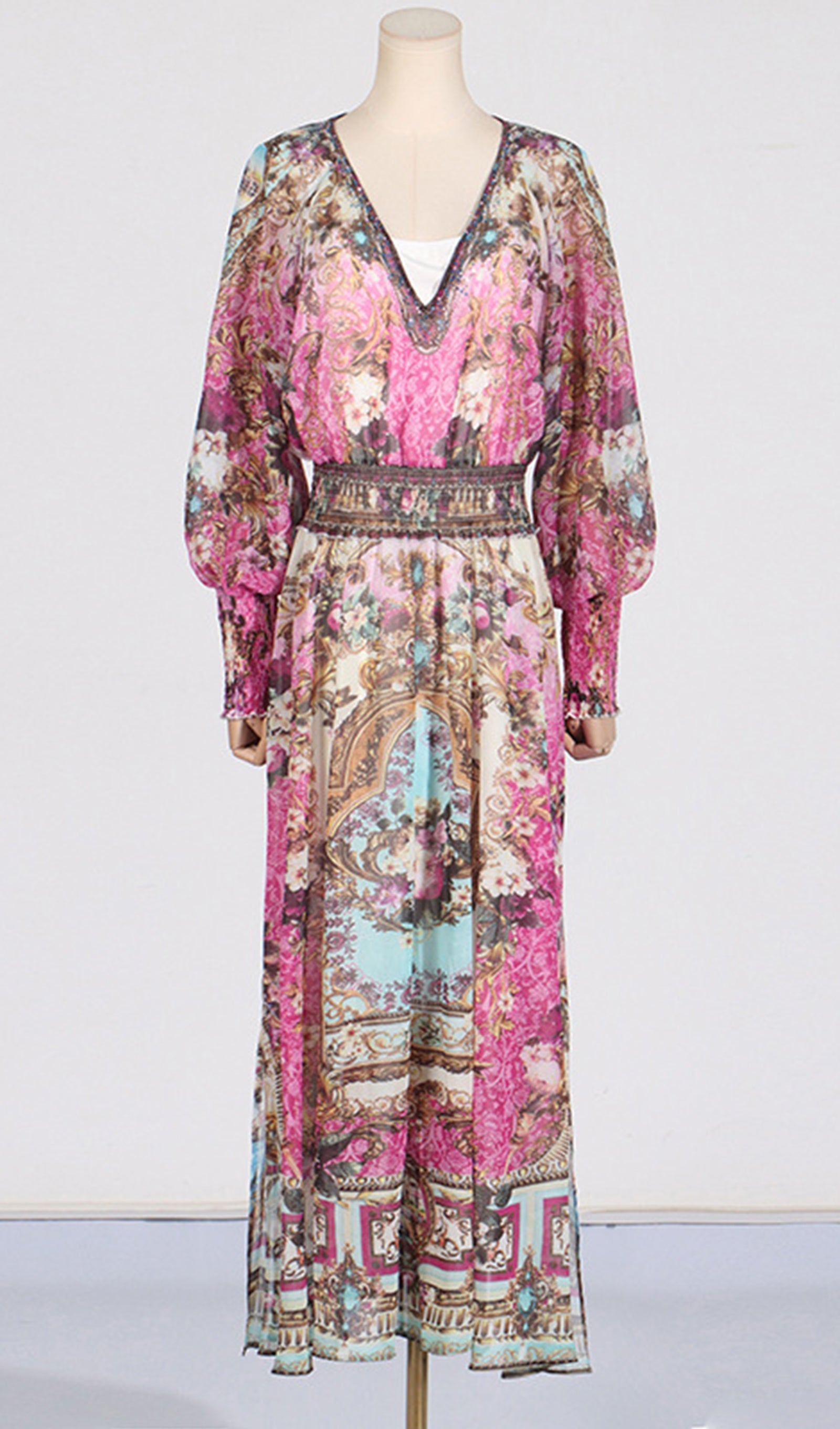 Boho Çiçekli Uzun Kollu V Yaka Maxi Elbise