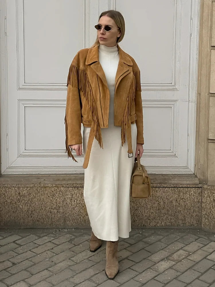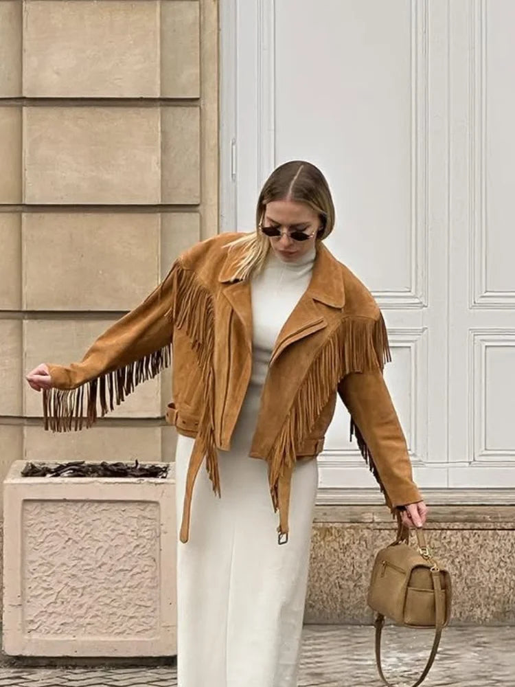Bu Kahverengi Püsküllü Süet Ceket, modayı yakından takip eden kadınlar için zarif ve şık bir tasarıma sahiptir.
