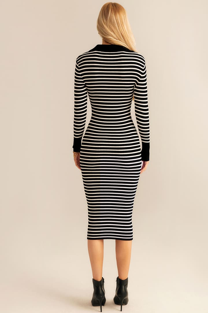 Gündelik V Yaka Örgü Çizgili Uzun Kollu Midi Elbise
