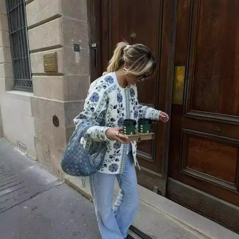 Günlük Sokak Çiçekleri Dantel Yukarı Düğmeler Patchwork O Yaka Dış Giyim