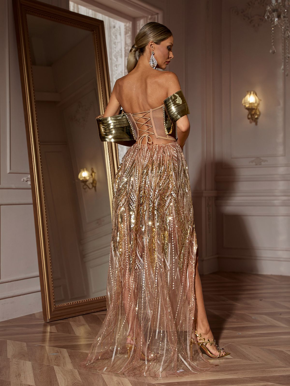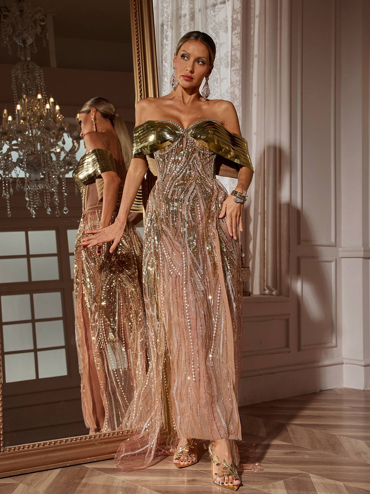 Daryle Omuz Açık Payetli Bölünmüş Maxi Elbise Altın