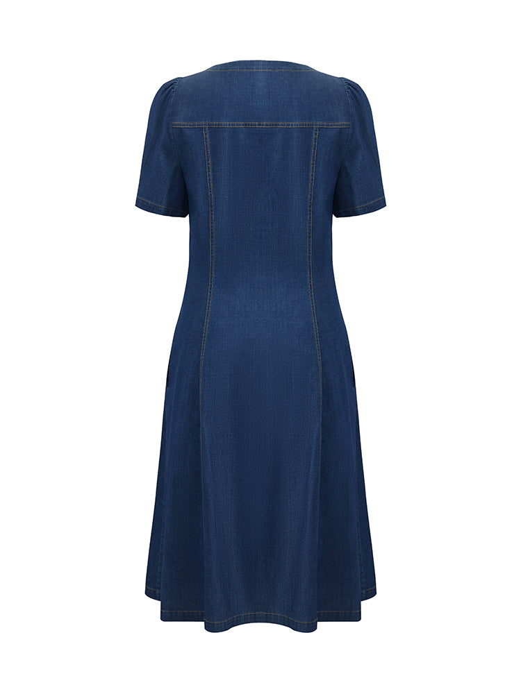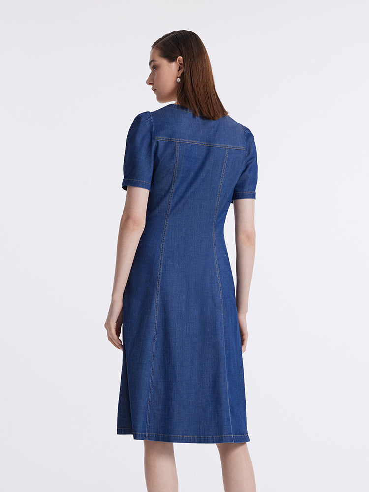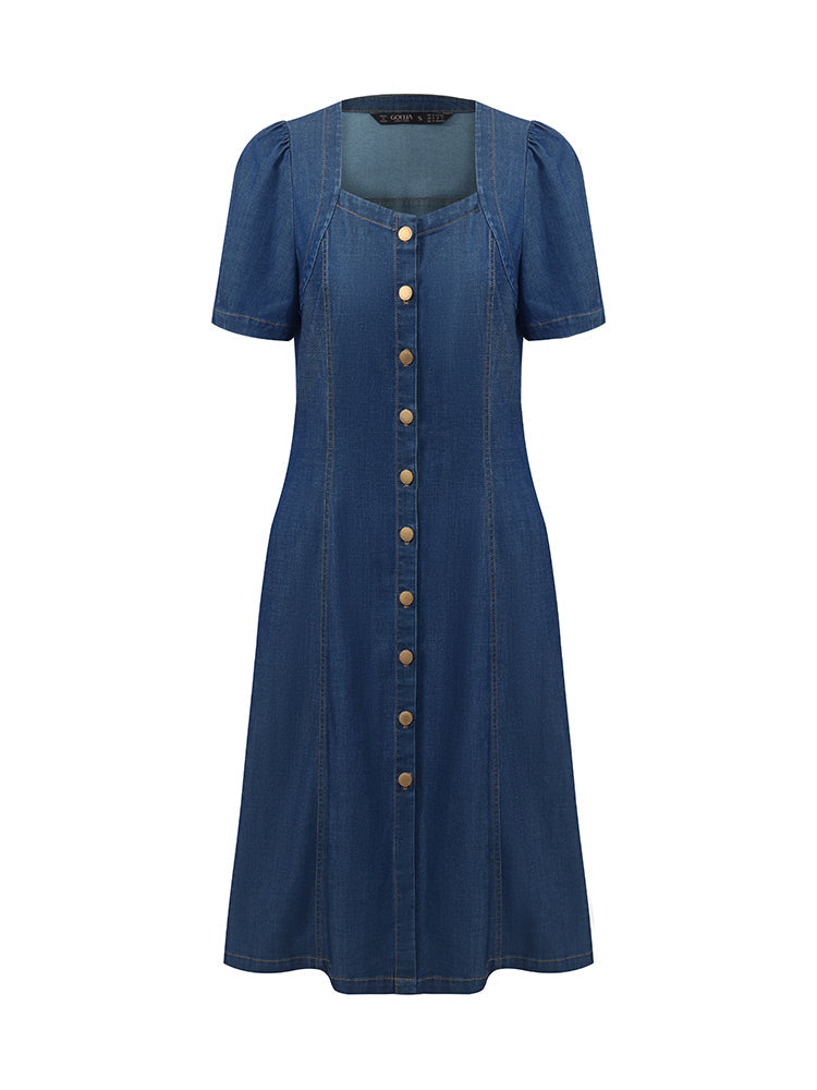 Denim Puf Kollu Tek Göğüslü Kadın Midi Kot Elbise