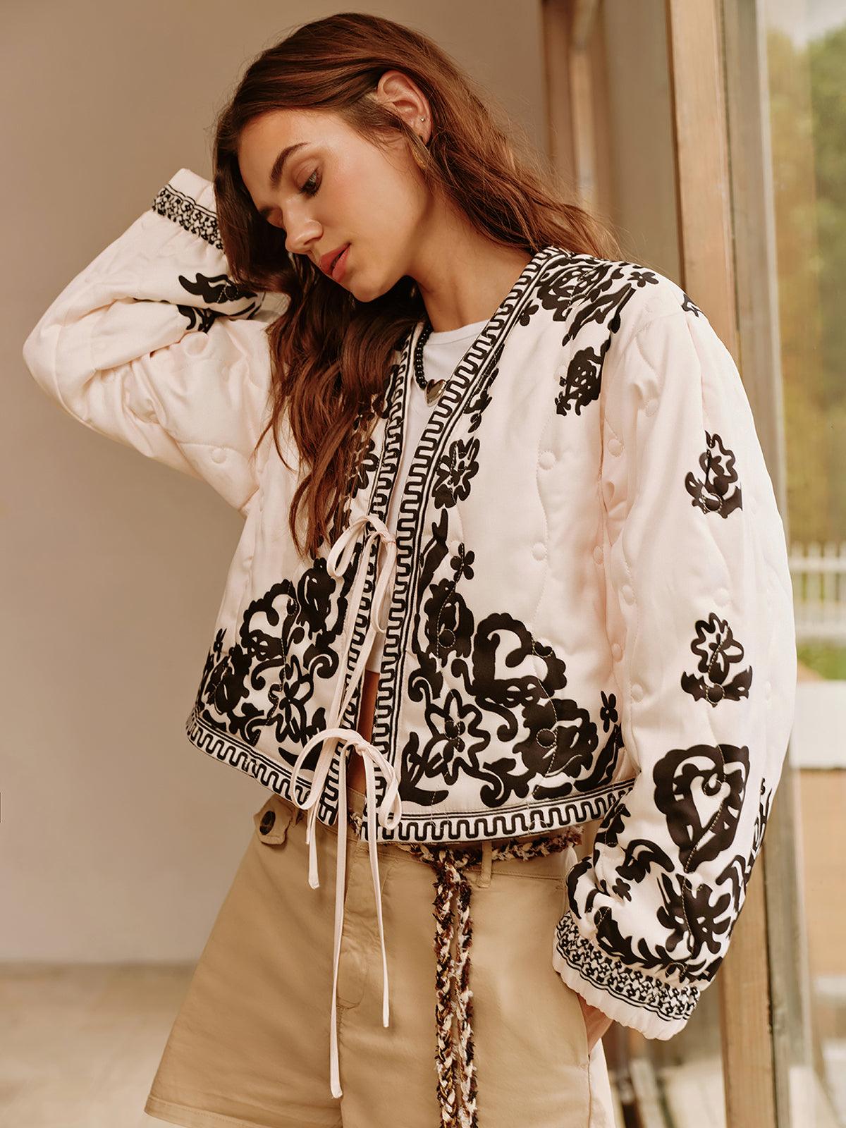 Zarif desenleri ve şal yaka detayıyla göz kamaştıran bu bağlamalı ceket, her kombine etnik ve modern bir dokunuş katıyor. Hem günlük hem de özel günlerde şıklığınızla fark yaratın!