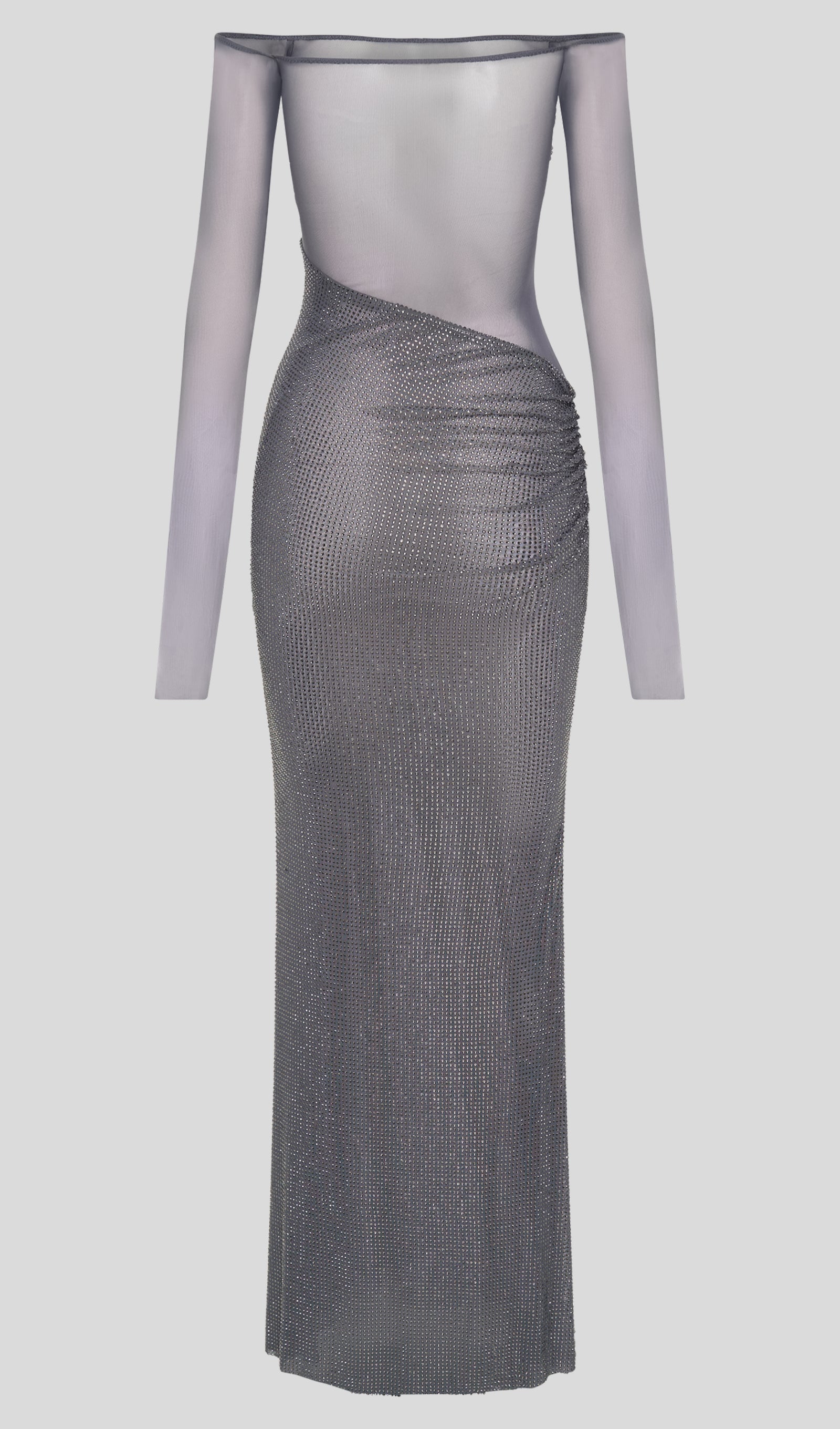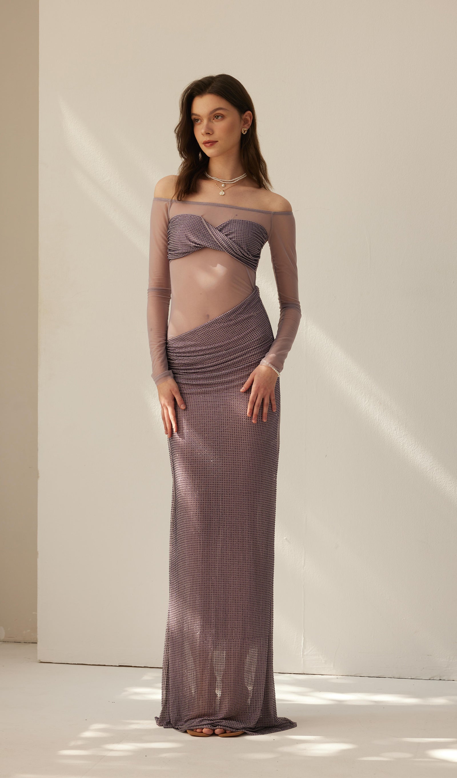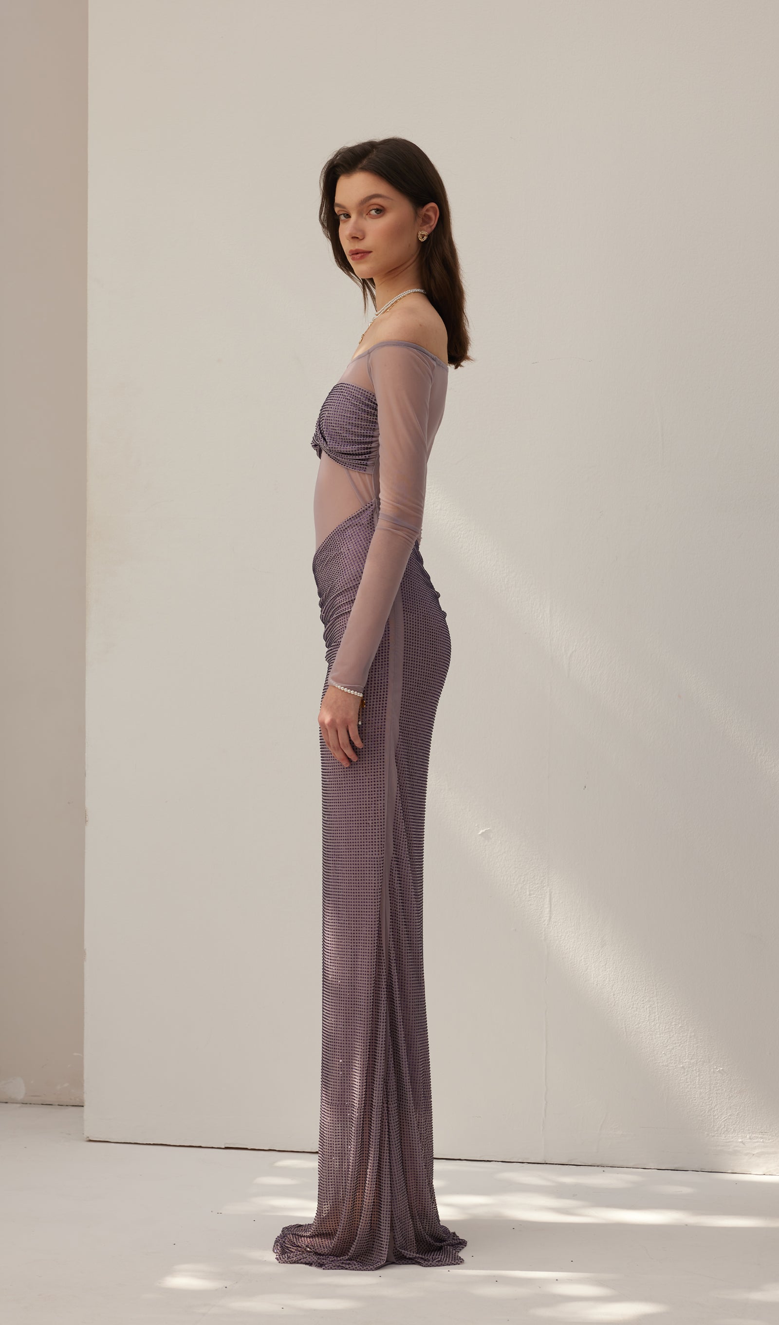 Diamante Kapalı Omuz Maksi Elbise - Gri Mor