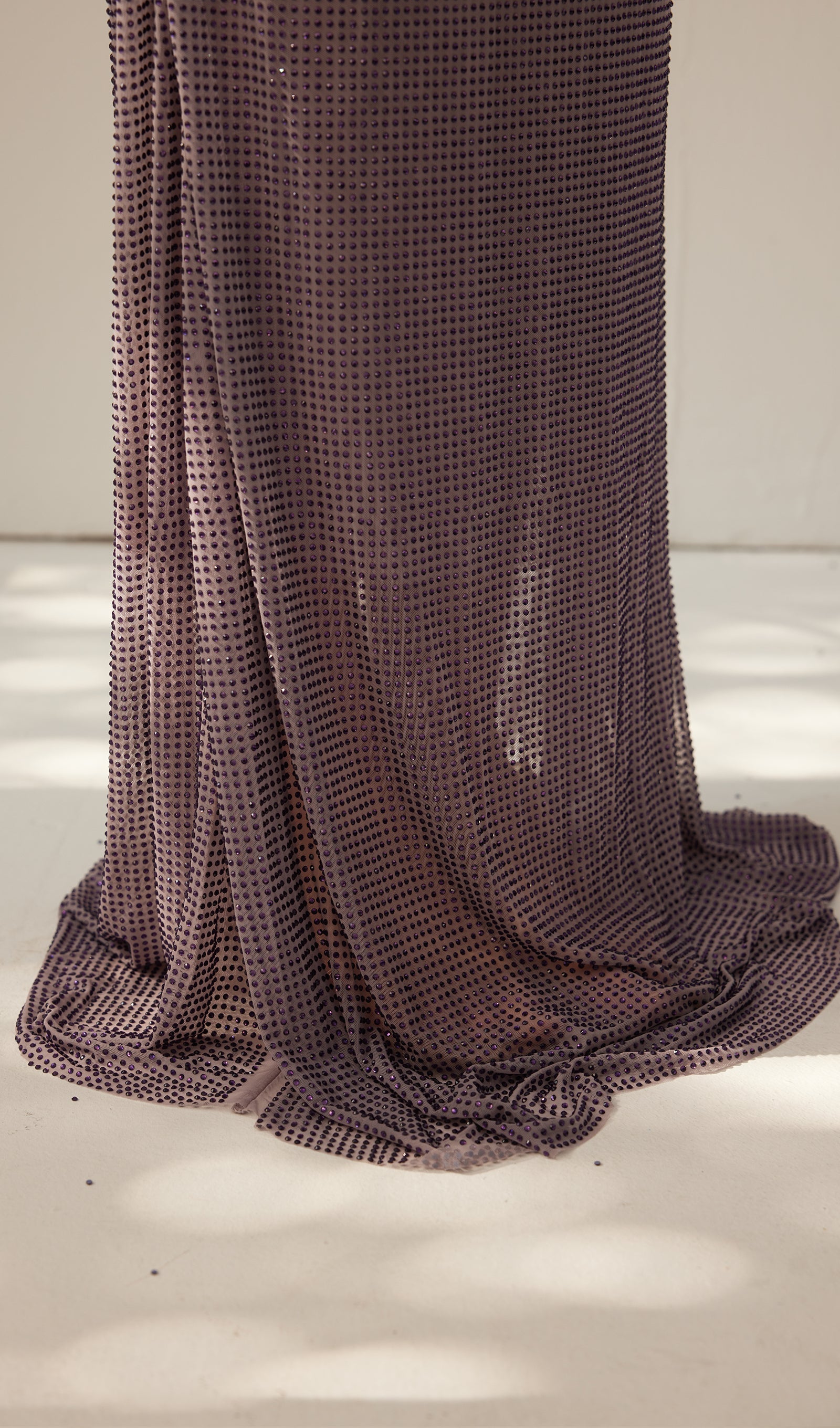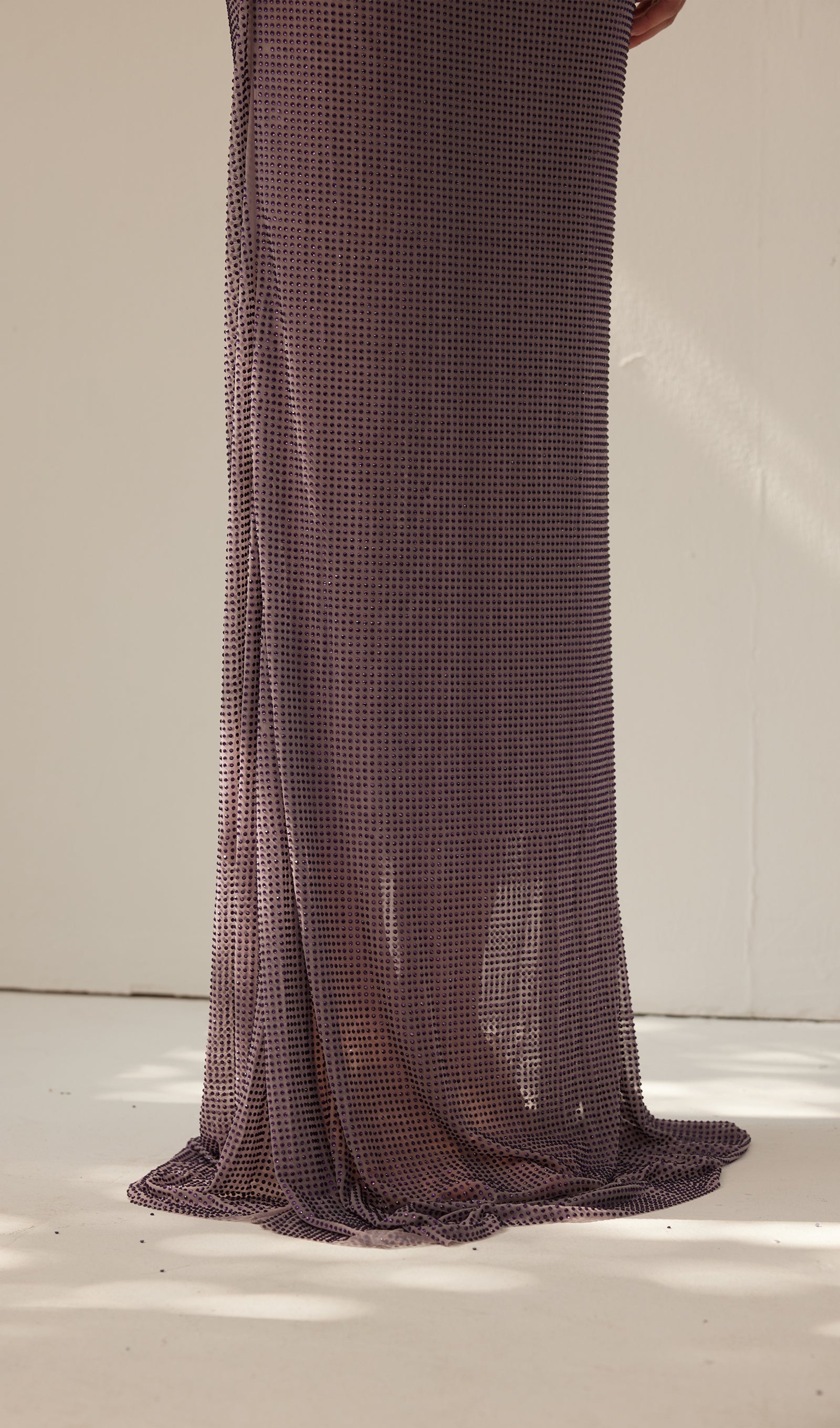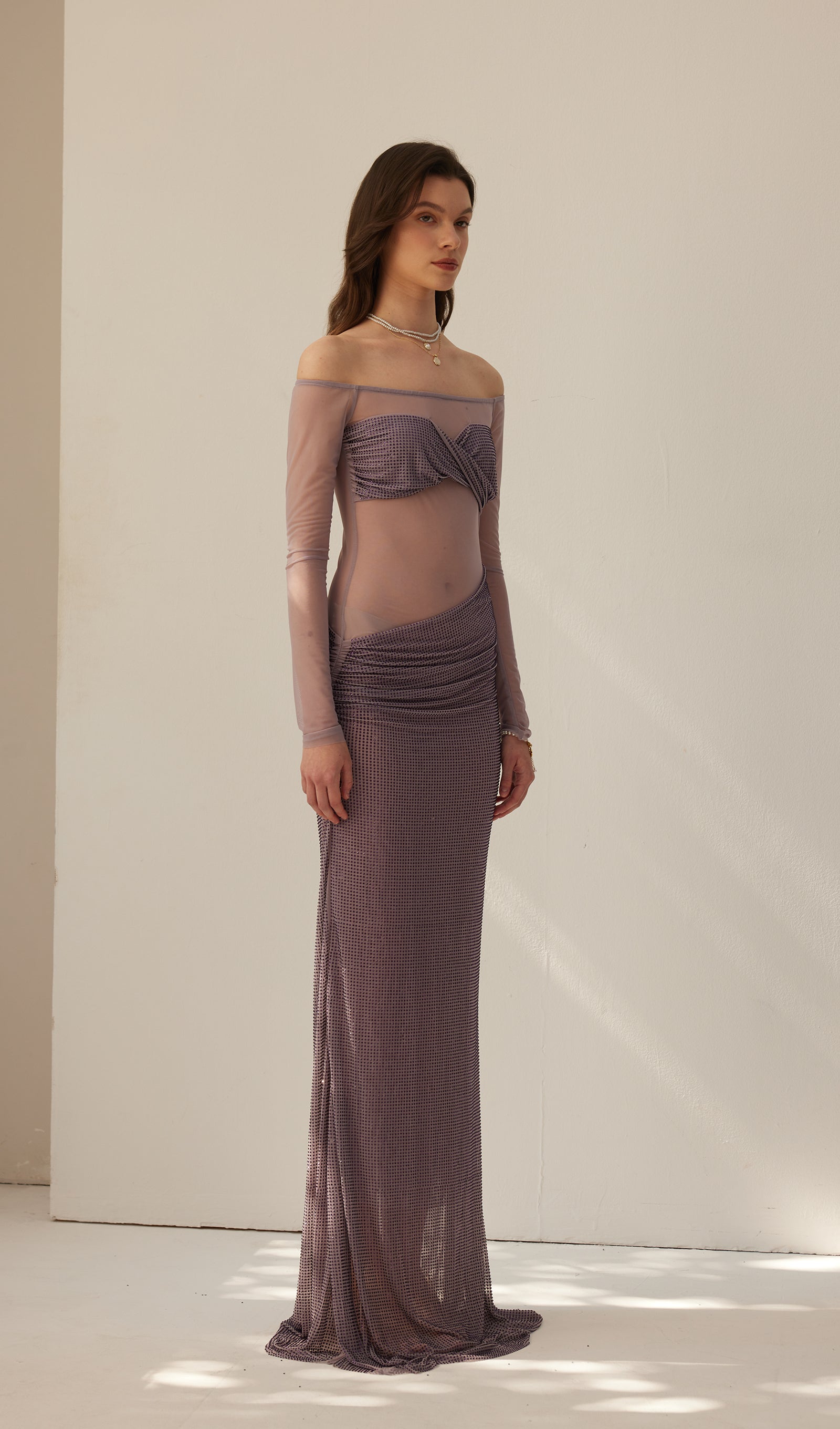 Diamante Kapalı Omuz Maksi Elbise - Gri Mor