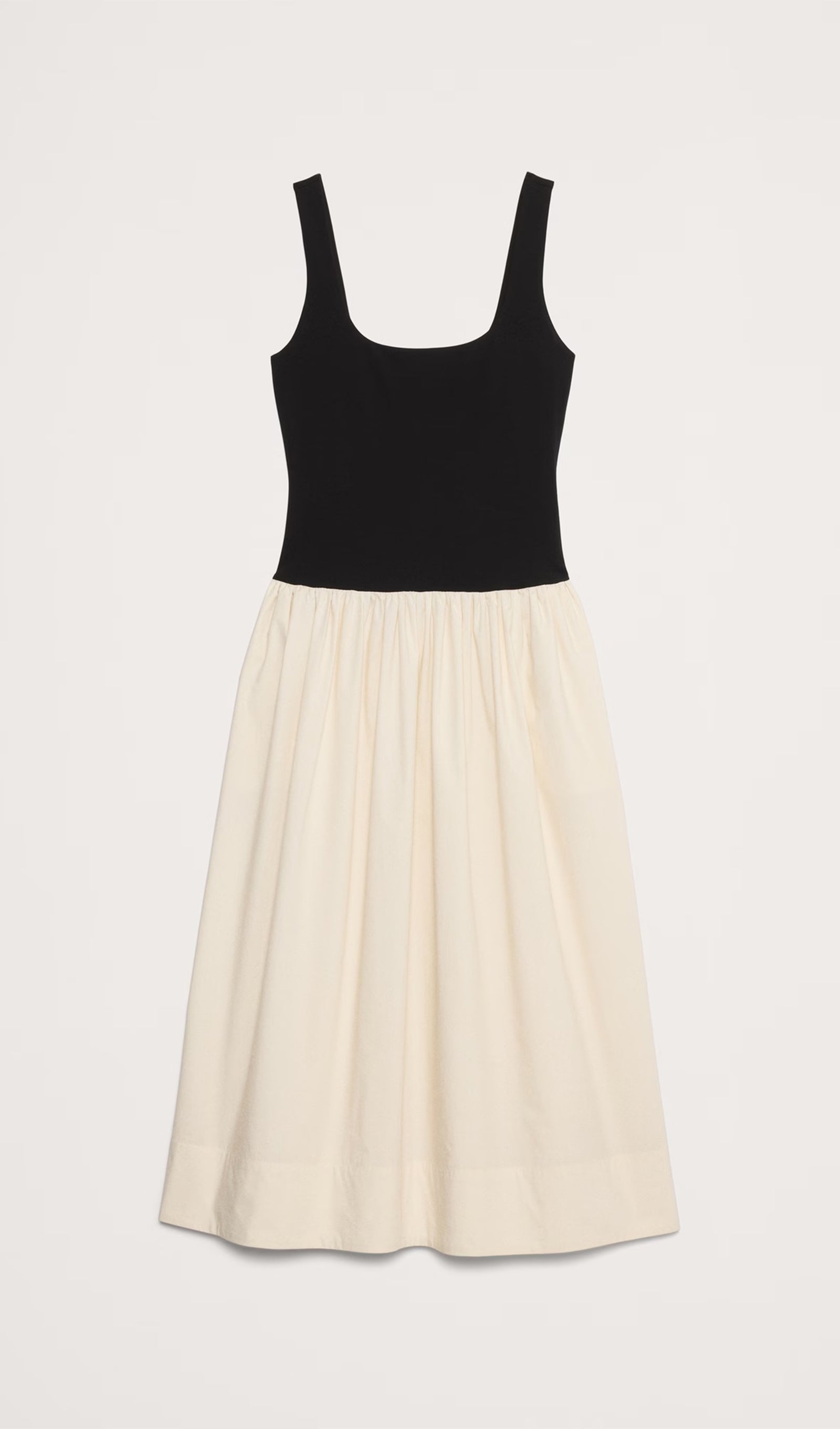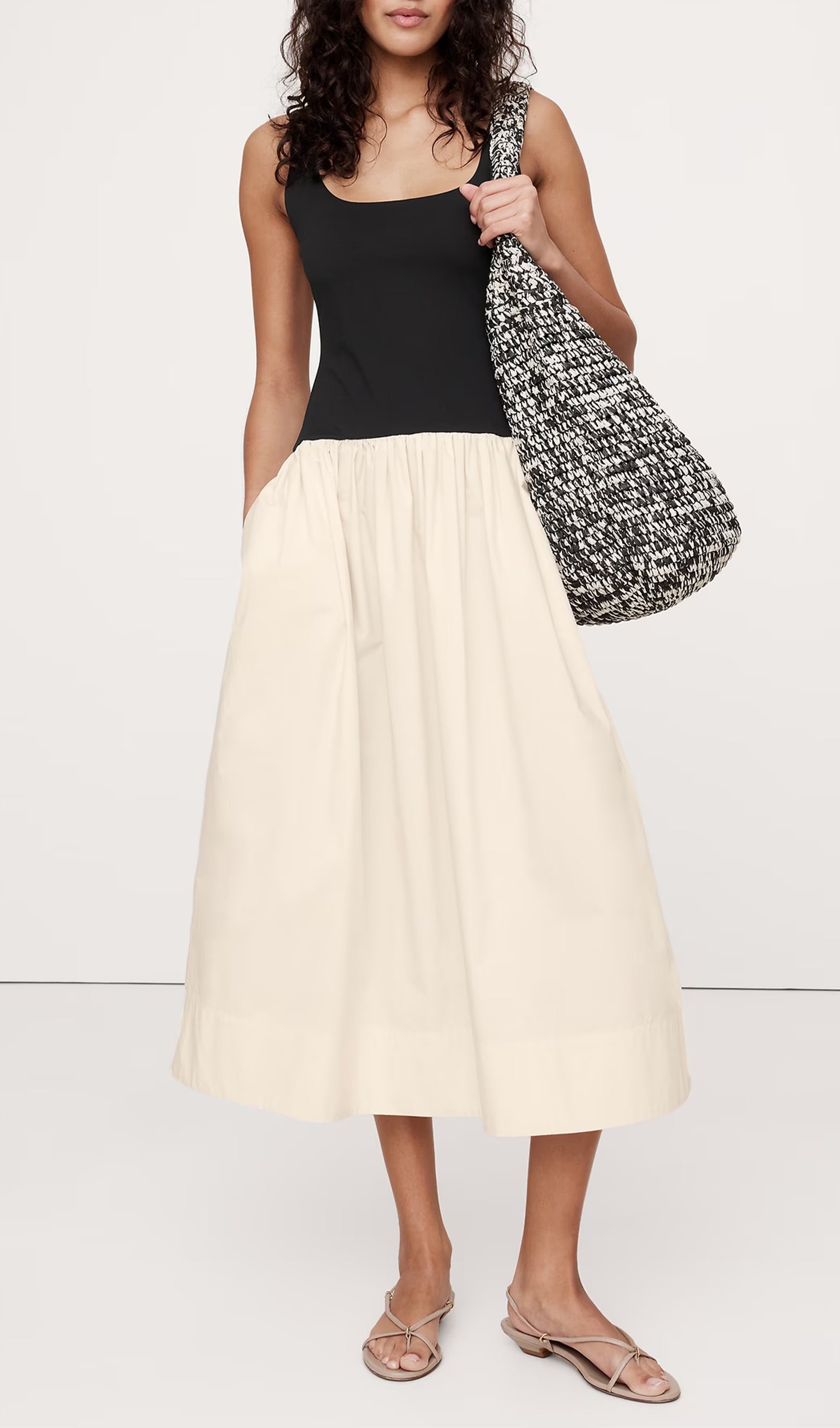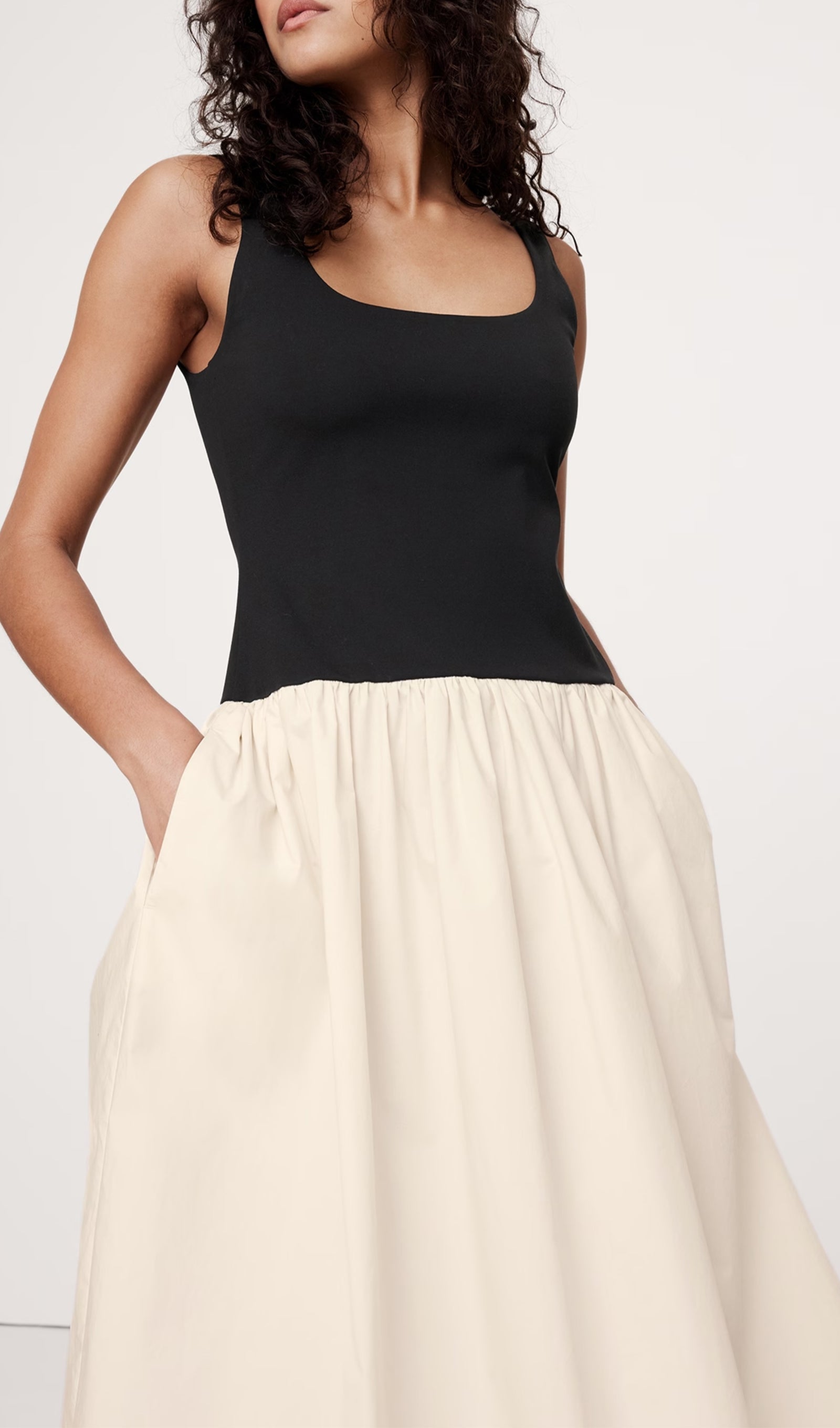 Bu düşük bel elbiseyi iki farklı kumaştan kestik: yumuşak, esnek bir örgüden bir beden ve gevrek, pamuklu poplinden kesilmiş etek. İnce topuklu sandaletler ve heykelsi takılarla giydirin ya da jean ceket ve düz ayakkabılarla aşağı indirin.