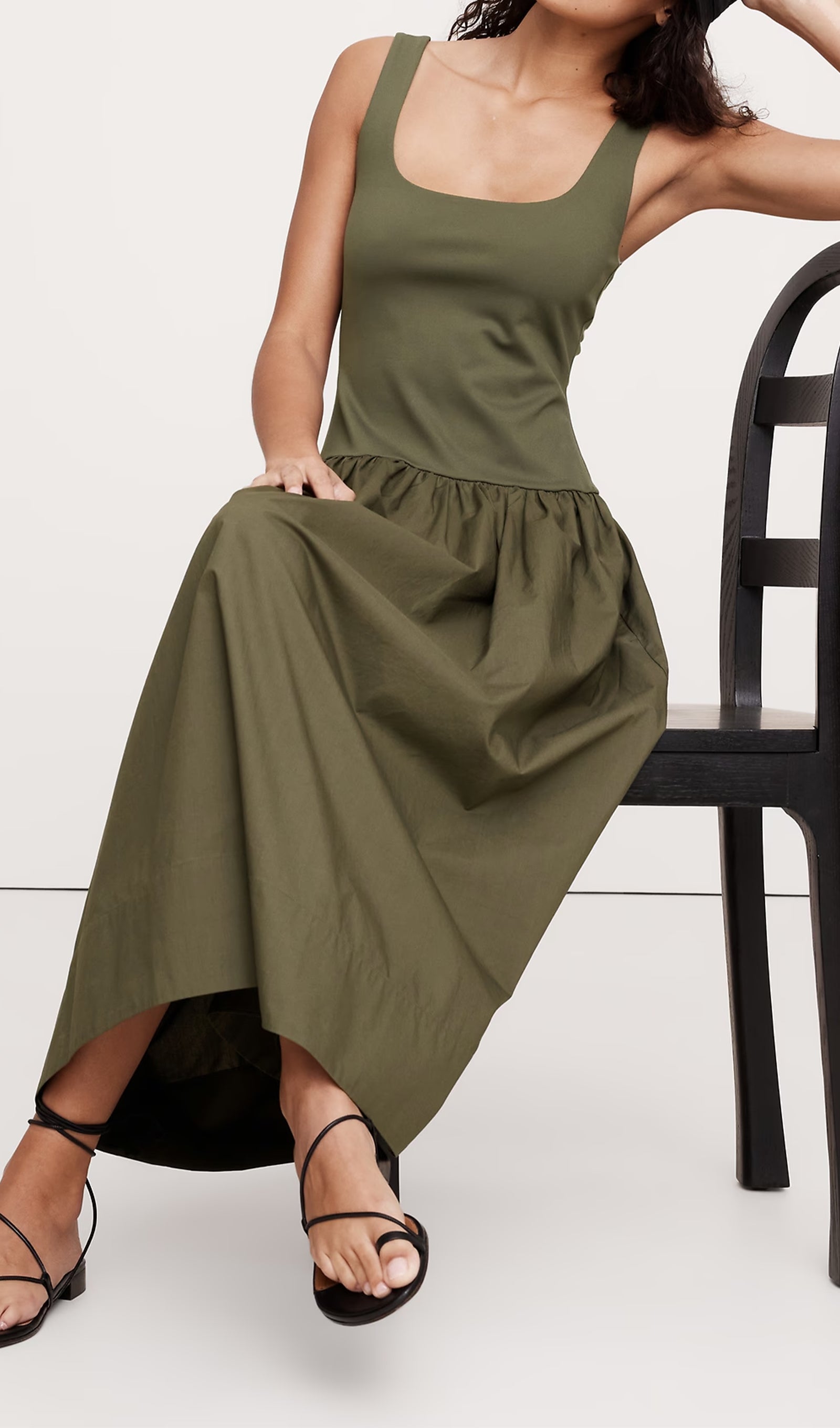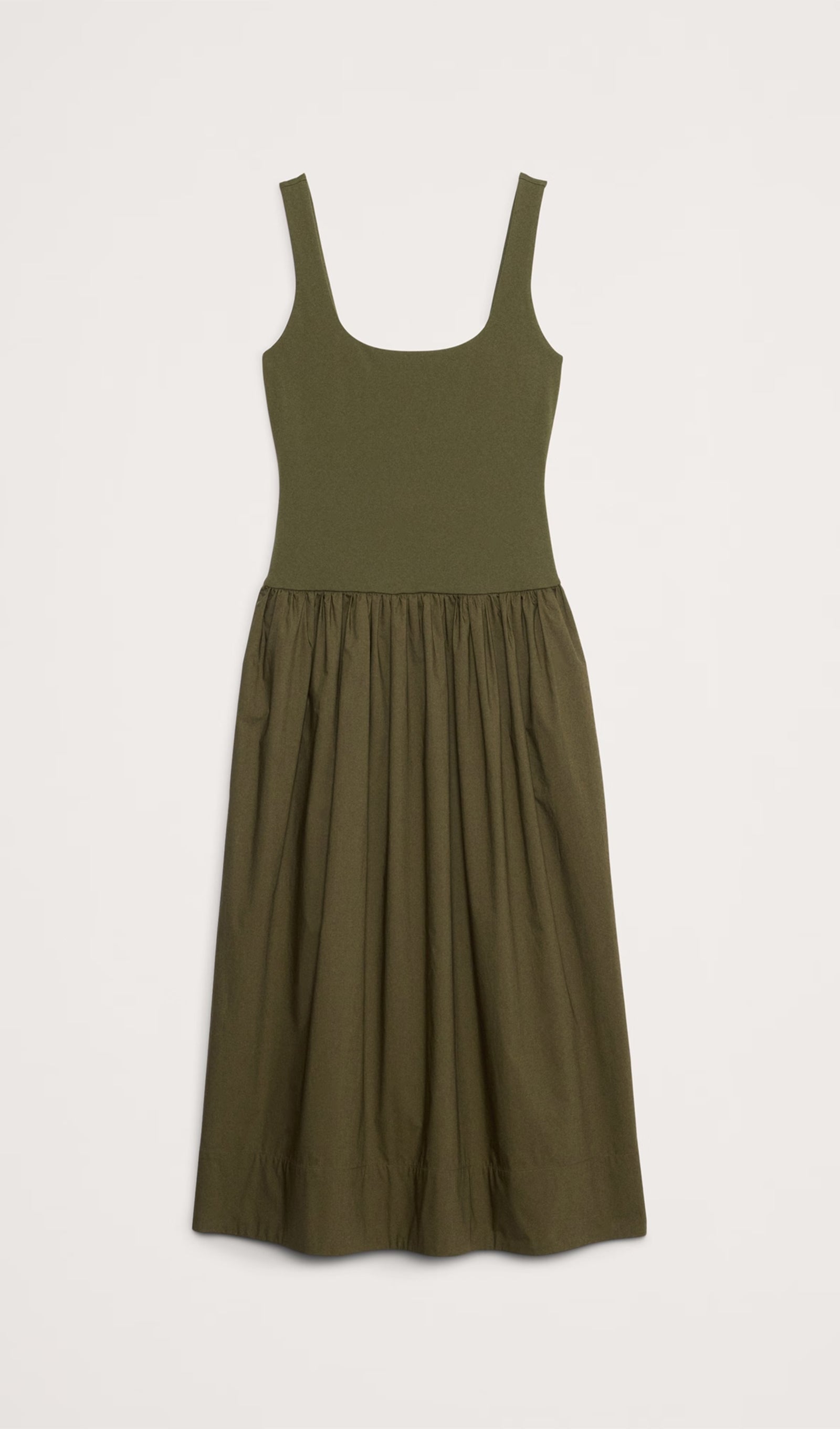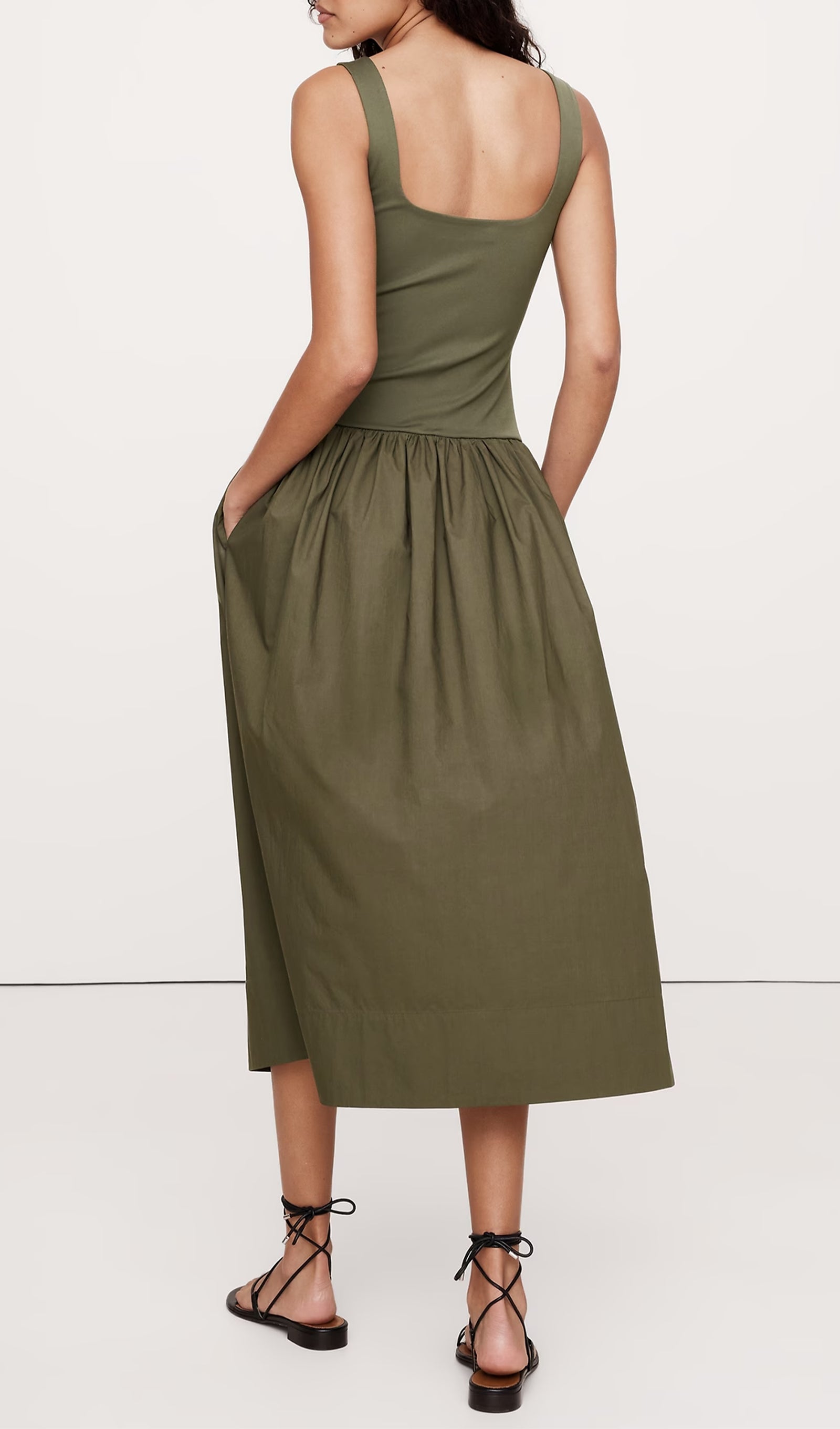 Bu düşük bel elbiseyi iki farklı kumaştan kestik: yumuşak, esnek bir örgüden bir beden ve gevrek, pamuklu poplinden kesilmiş etek. İnce topuklu sandaletler ve heykelsi takılarla giydirin ya da jean ceket ve düz ayakkabılarla aşağı indirin.