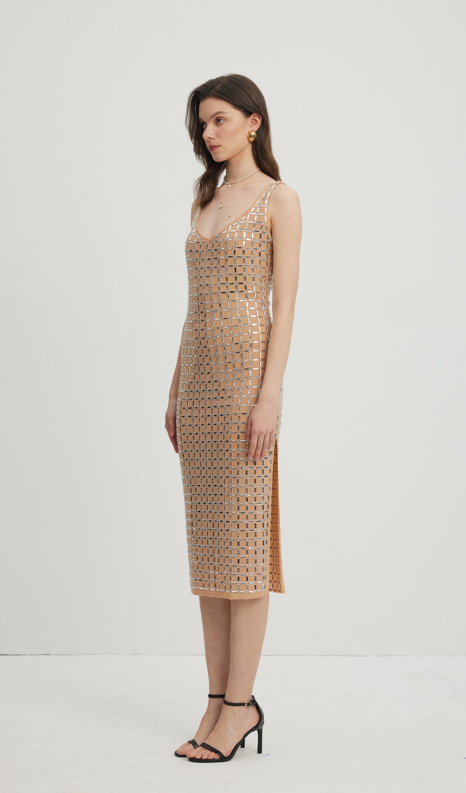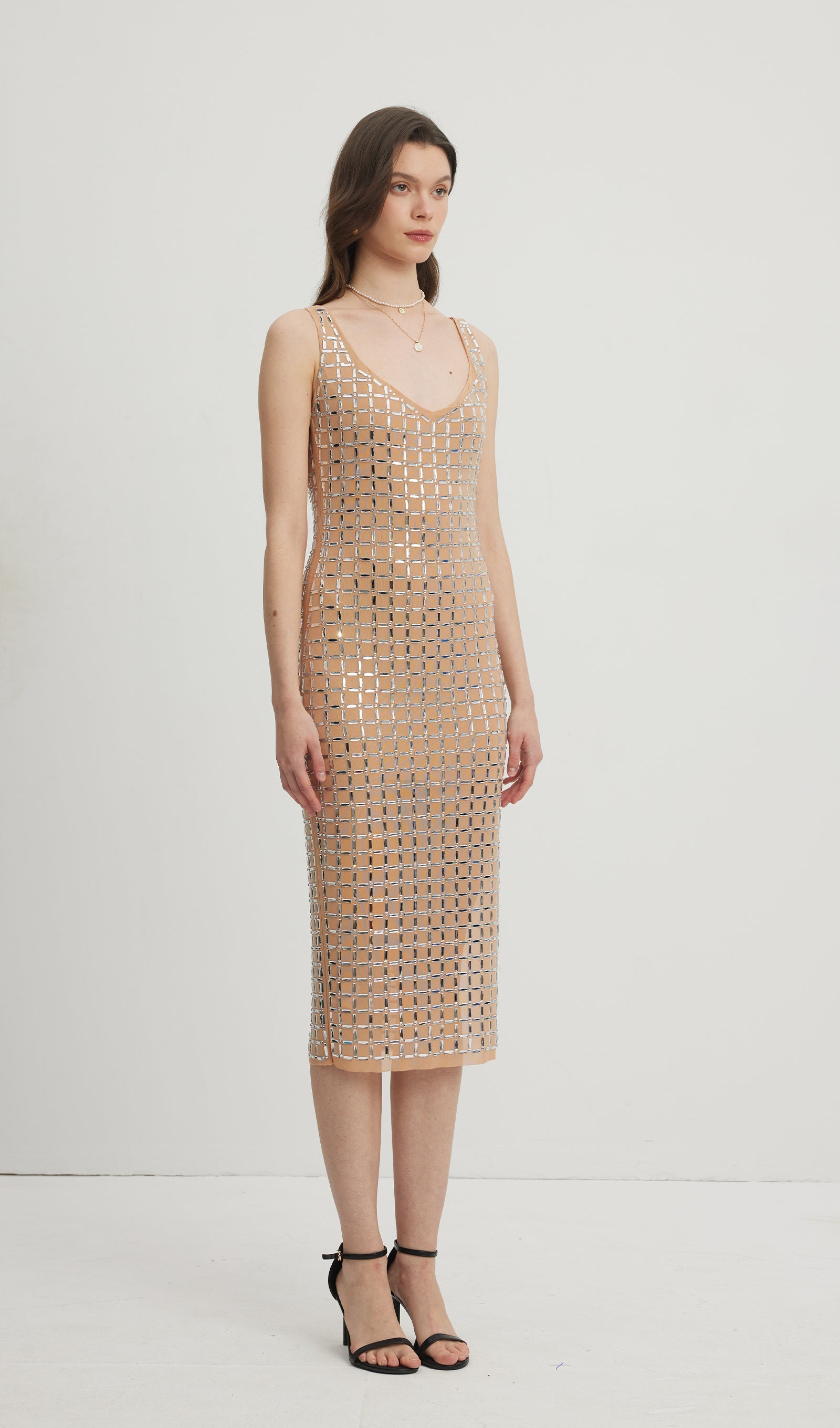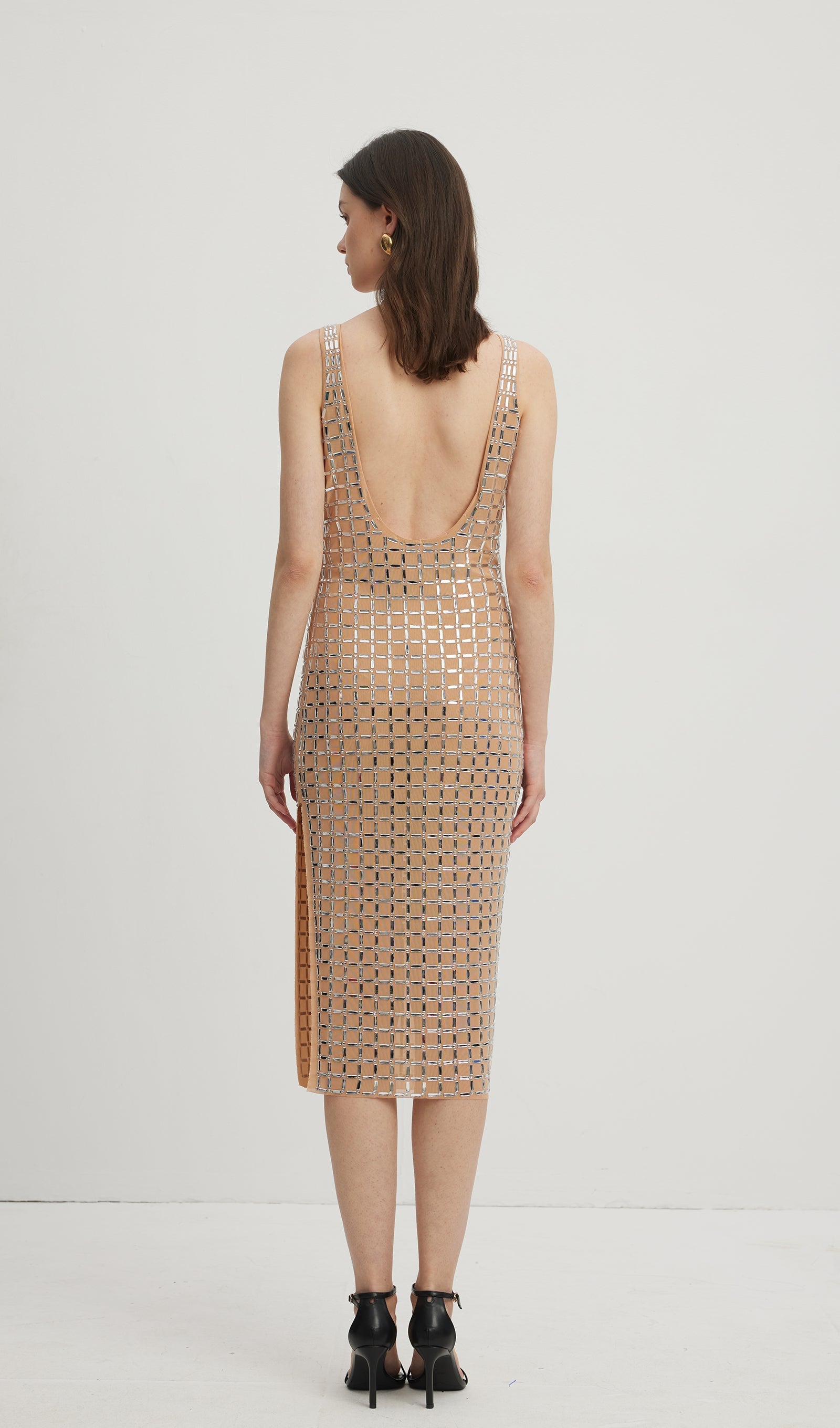 Süslemeli Sırtı Açık Midi Elbise Nude